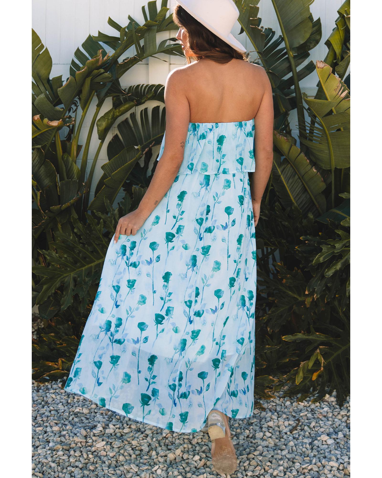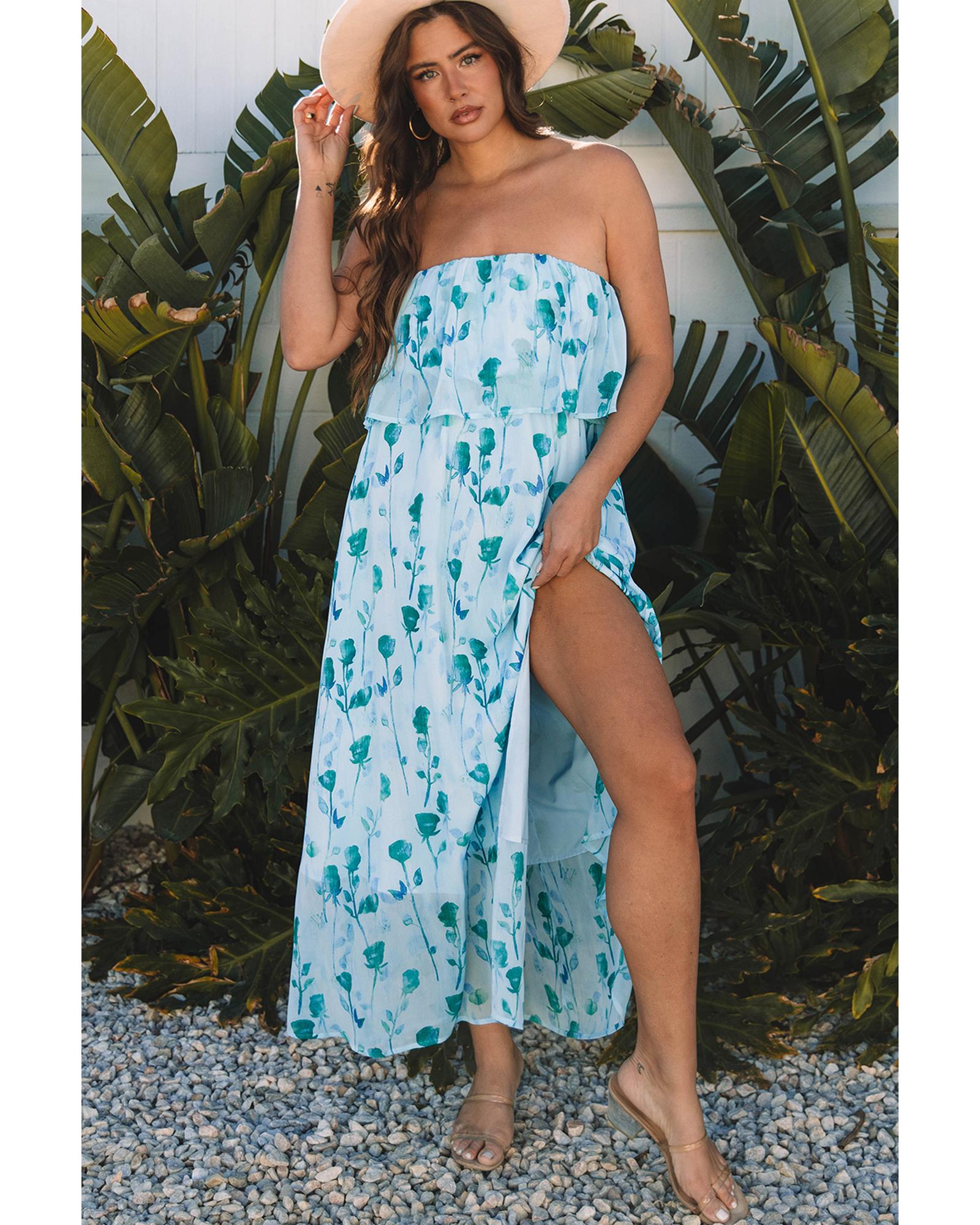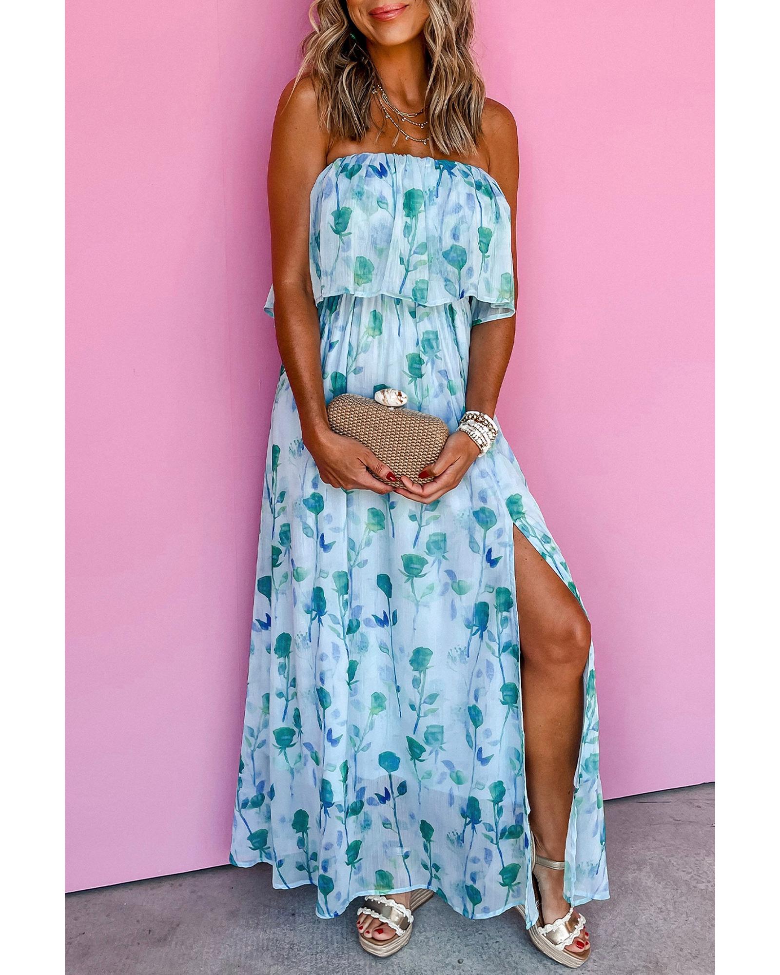 Green Floral Print Ruffled Side Slit Tube Top Maxi Dress – XL