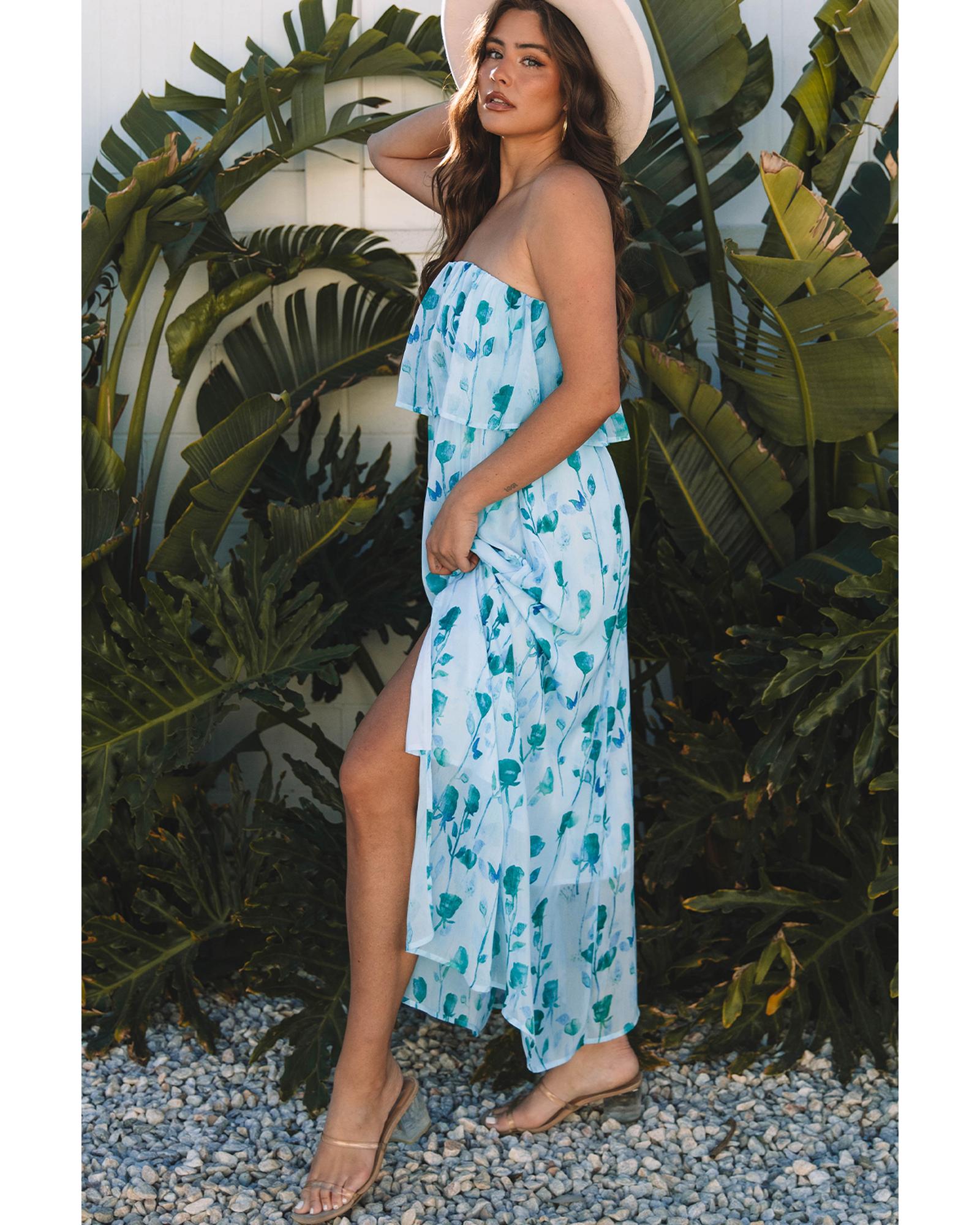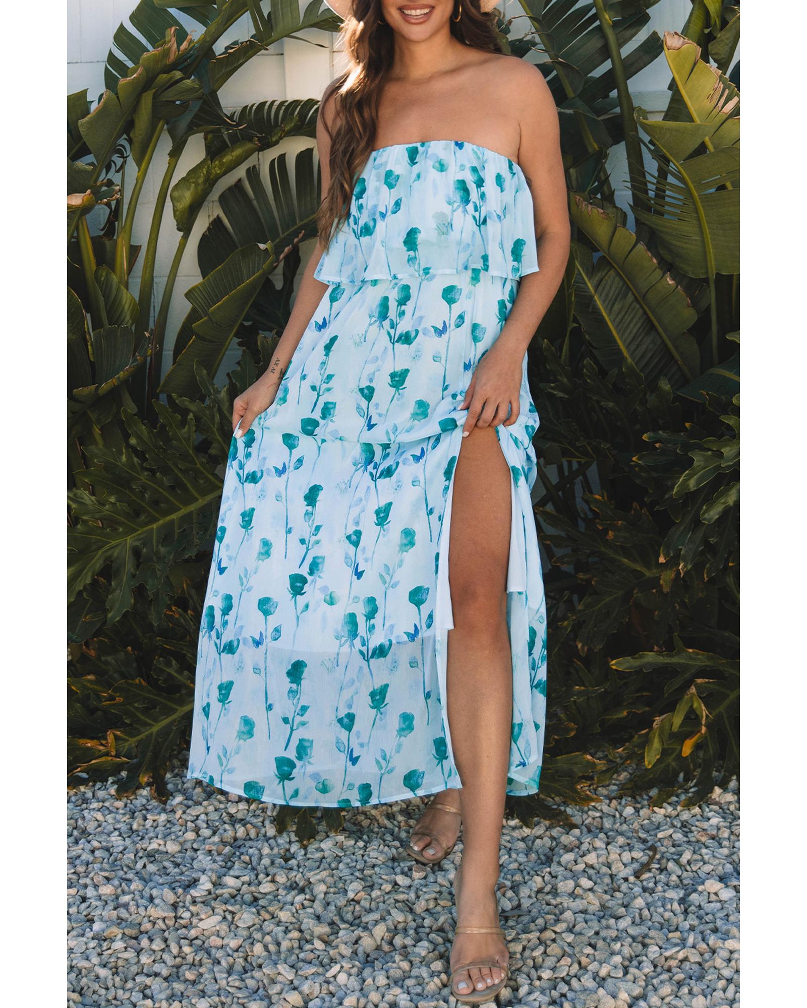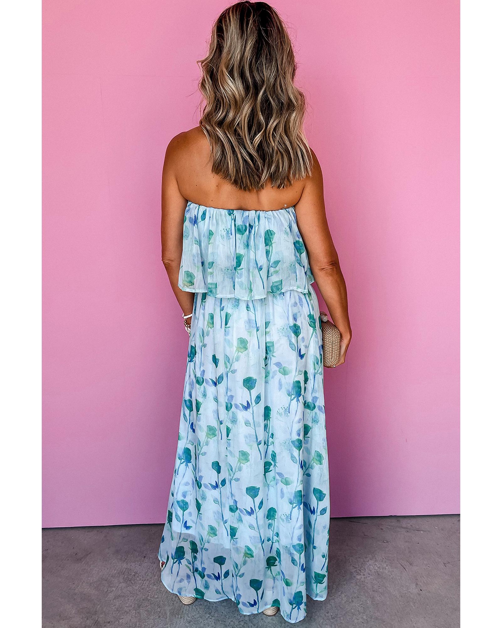 Green Floral Print Ruffled Side Slit Tube Top Maxi Dress – XL