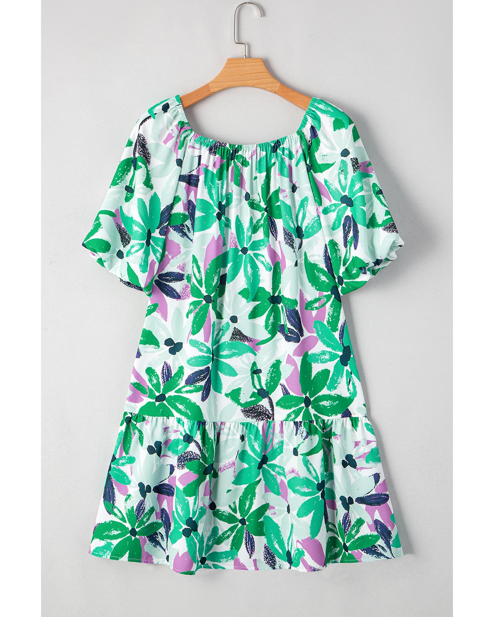 Green Floral Print Shirred Square Neck Loose Fit Mini Dress – M