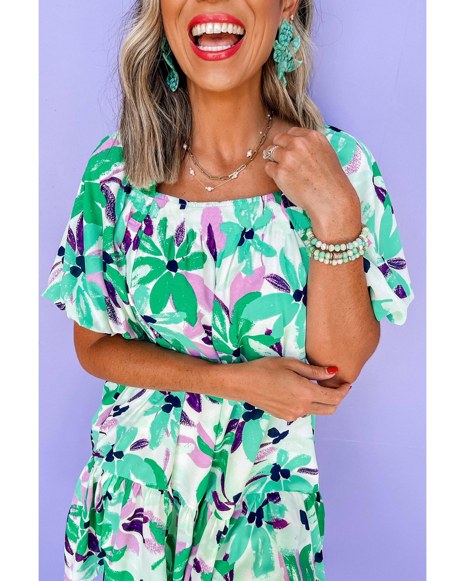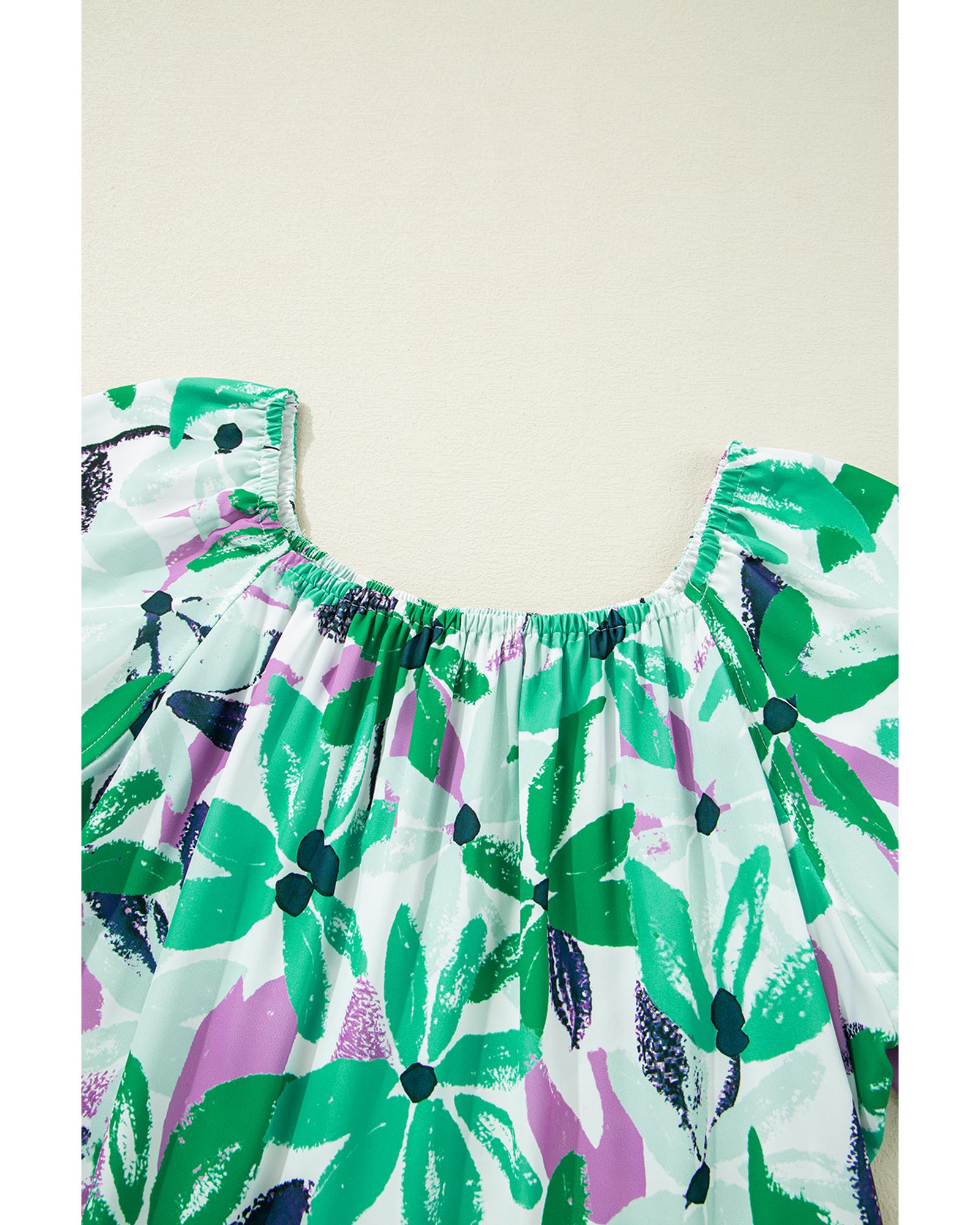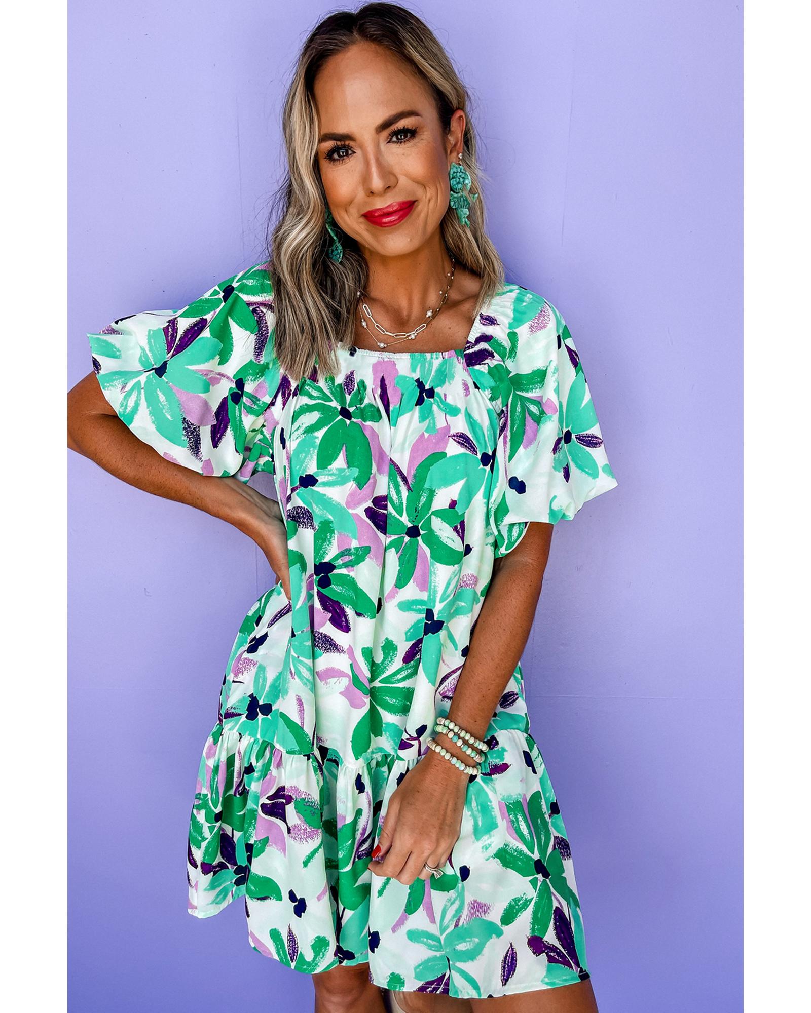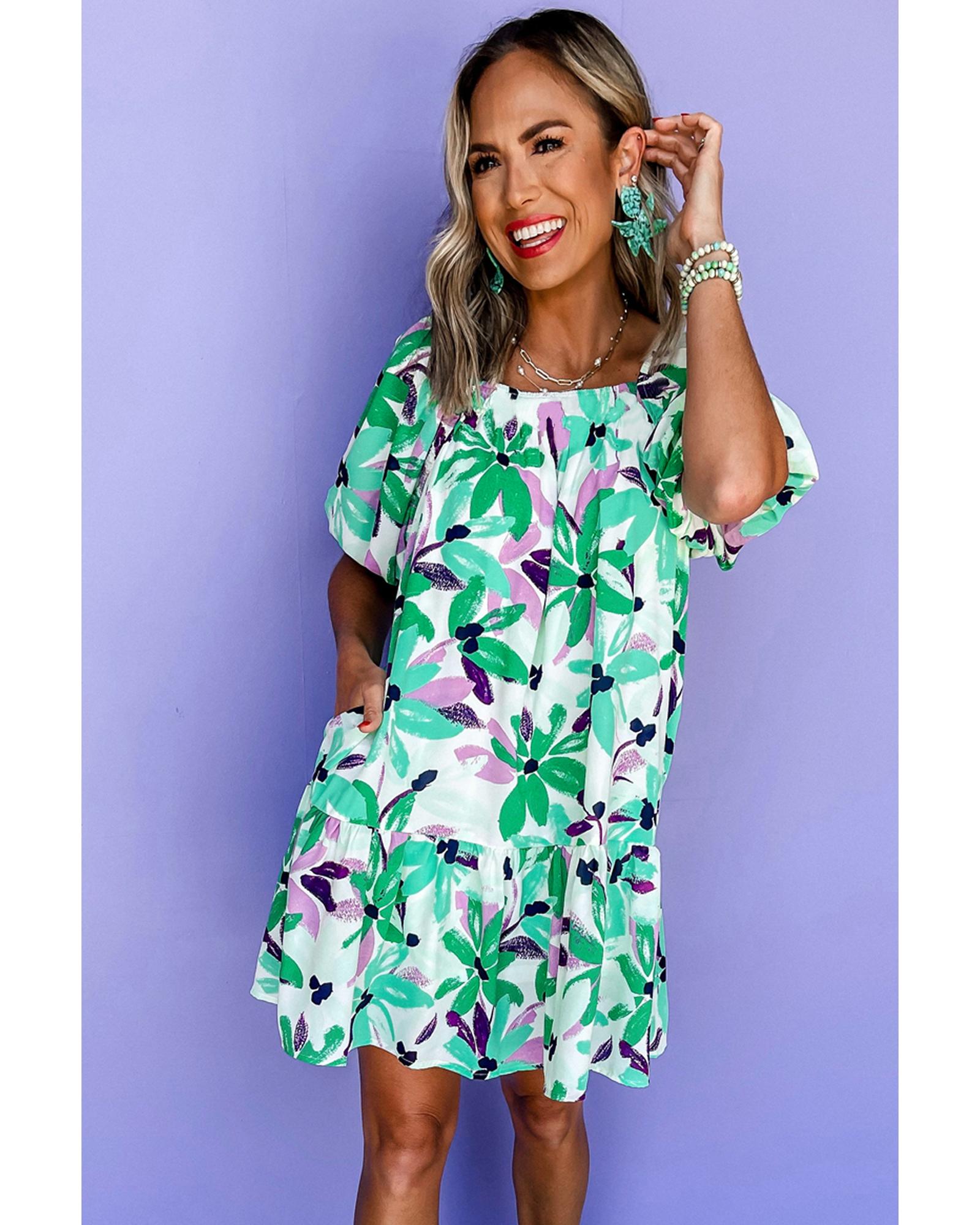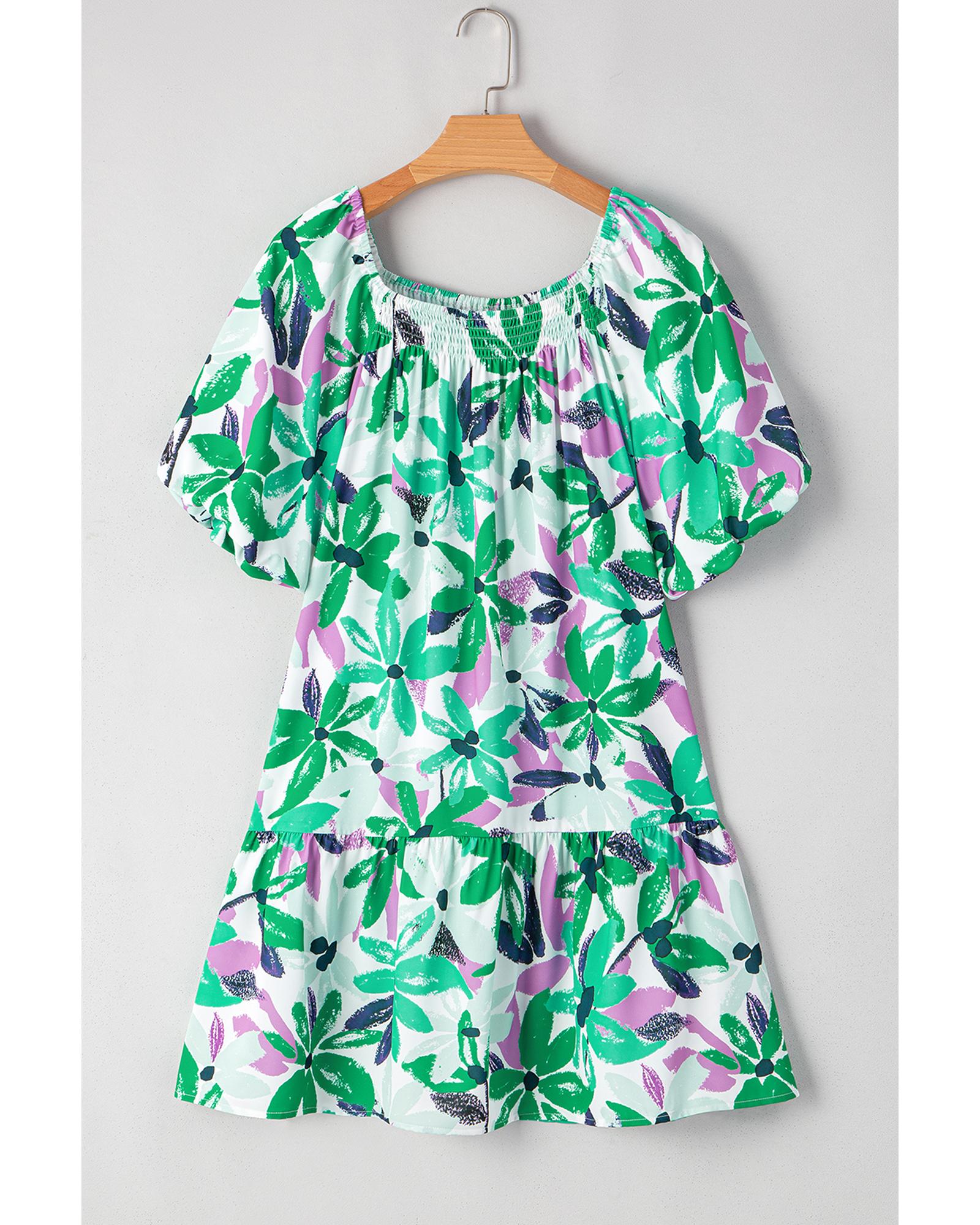 Green Floral Print Shirred Square Neck Loose Fit Mini Dress – XL