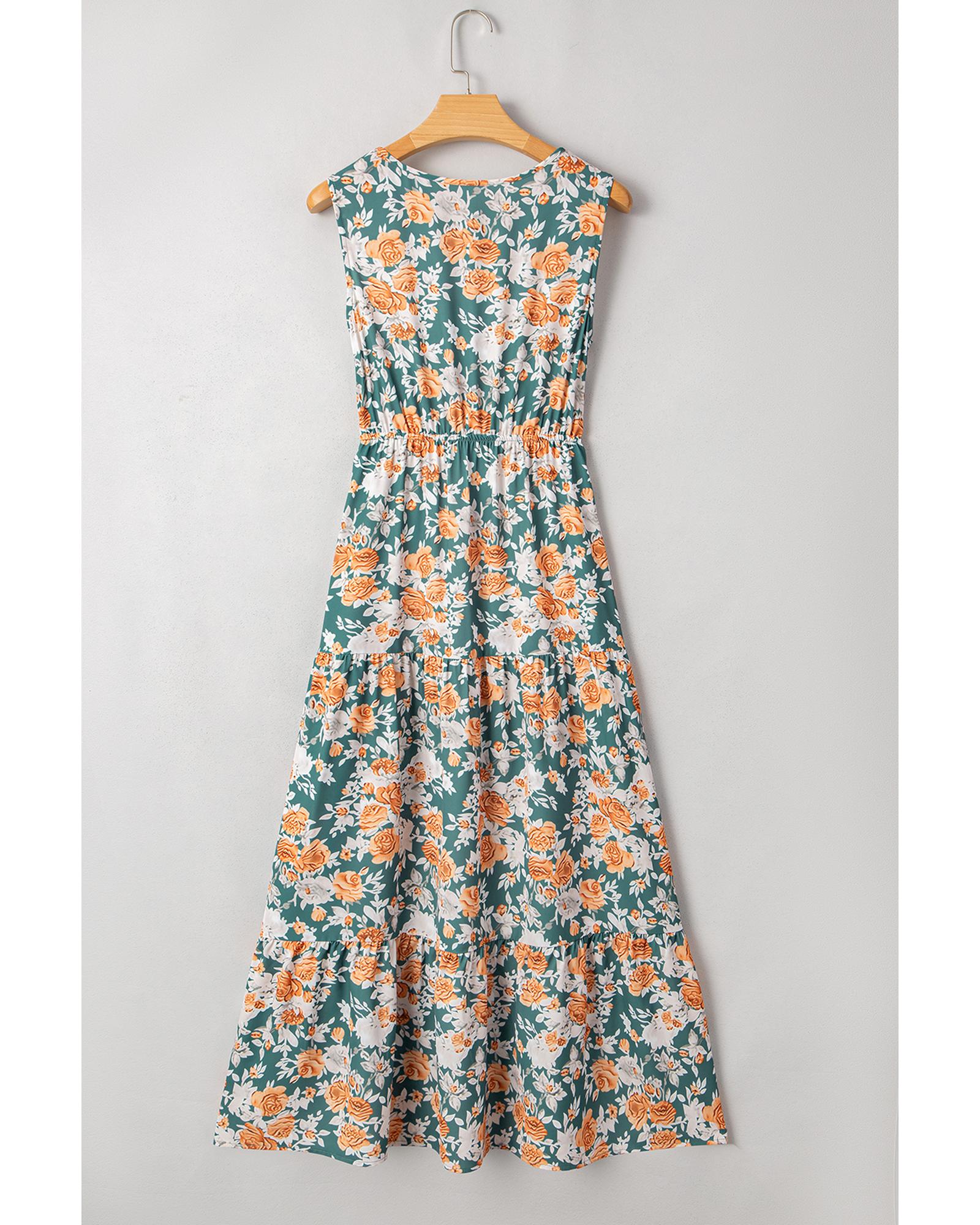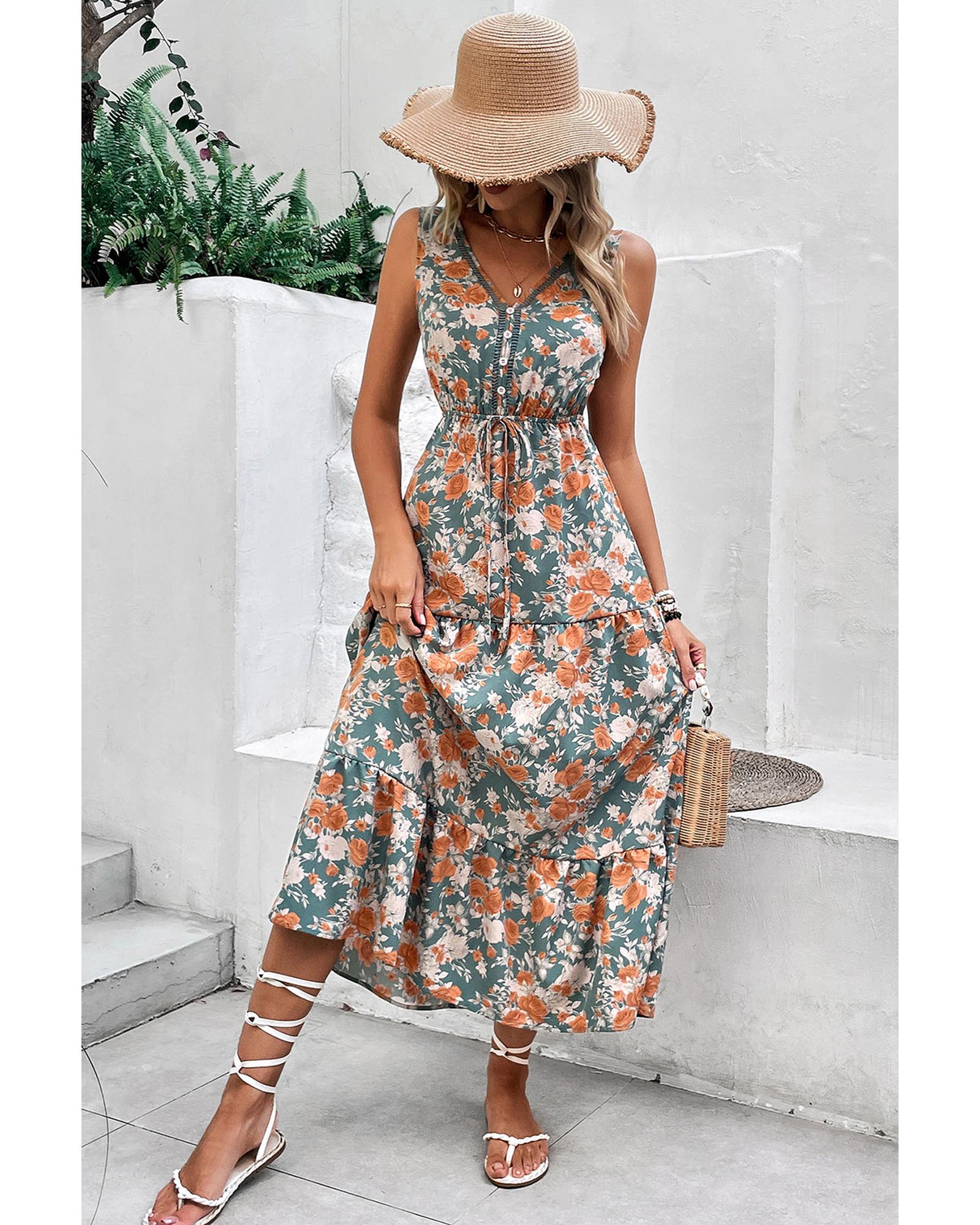 Green Floral Print Trimmed V Neck Tie Waist Sleeveless Holiday Long Dress – S