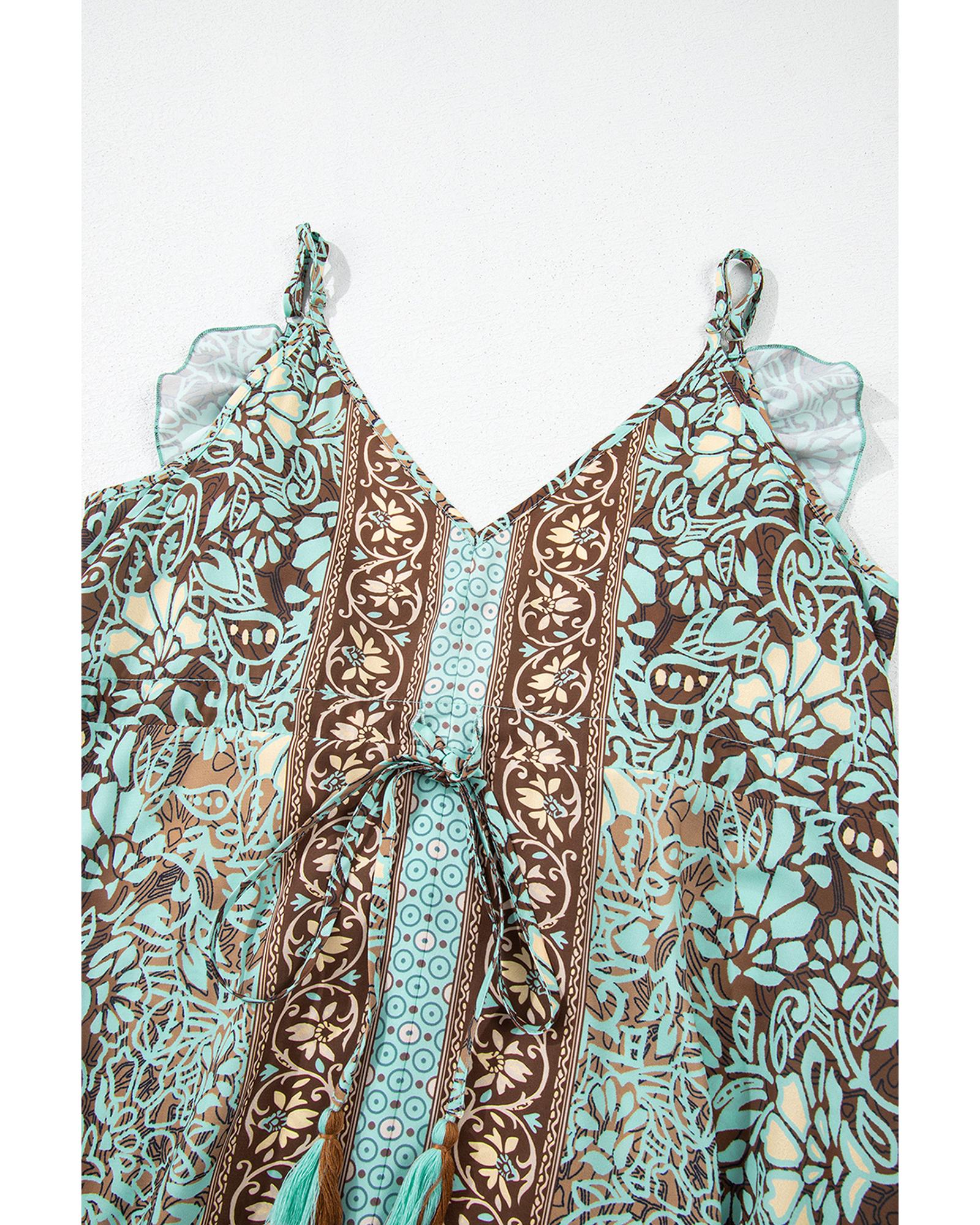 Green Floral Print V Neck Ruffled Trim Backless Tassel Waist Maxi Dress – L