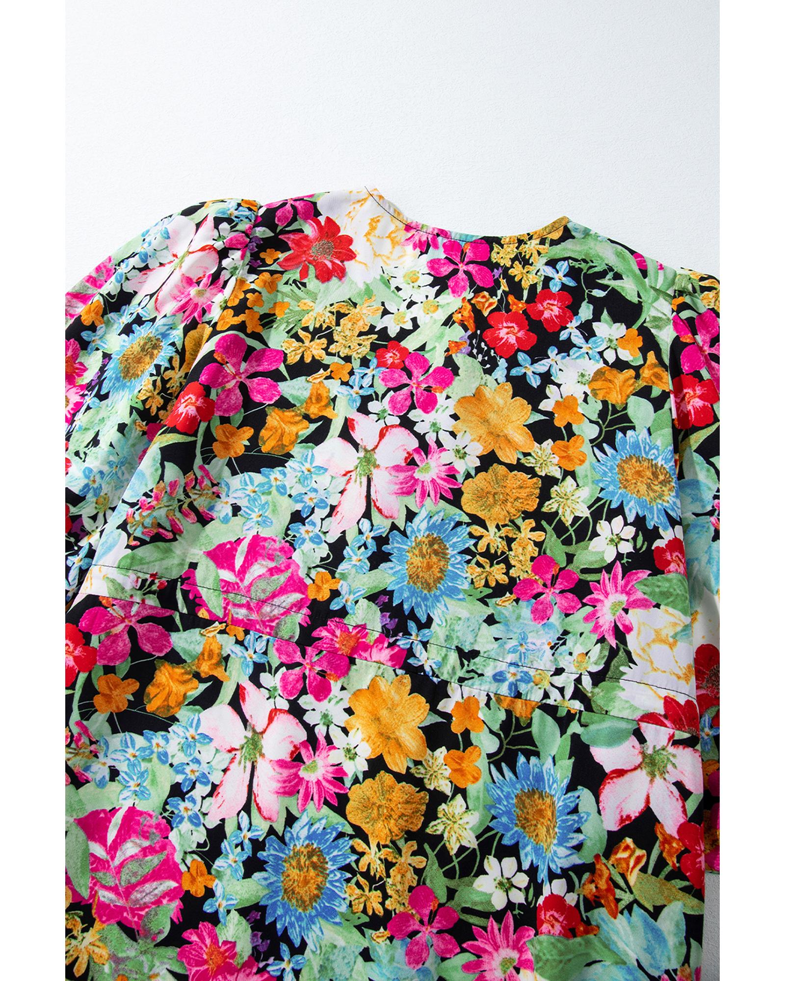 Green Floral Puff Sleeve V Neck Tassel Drawstring Dress – M