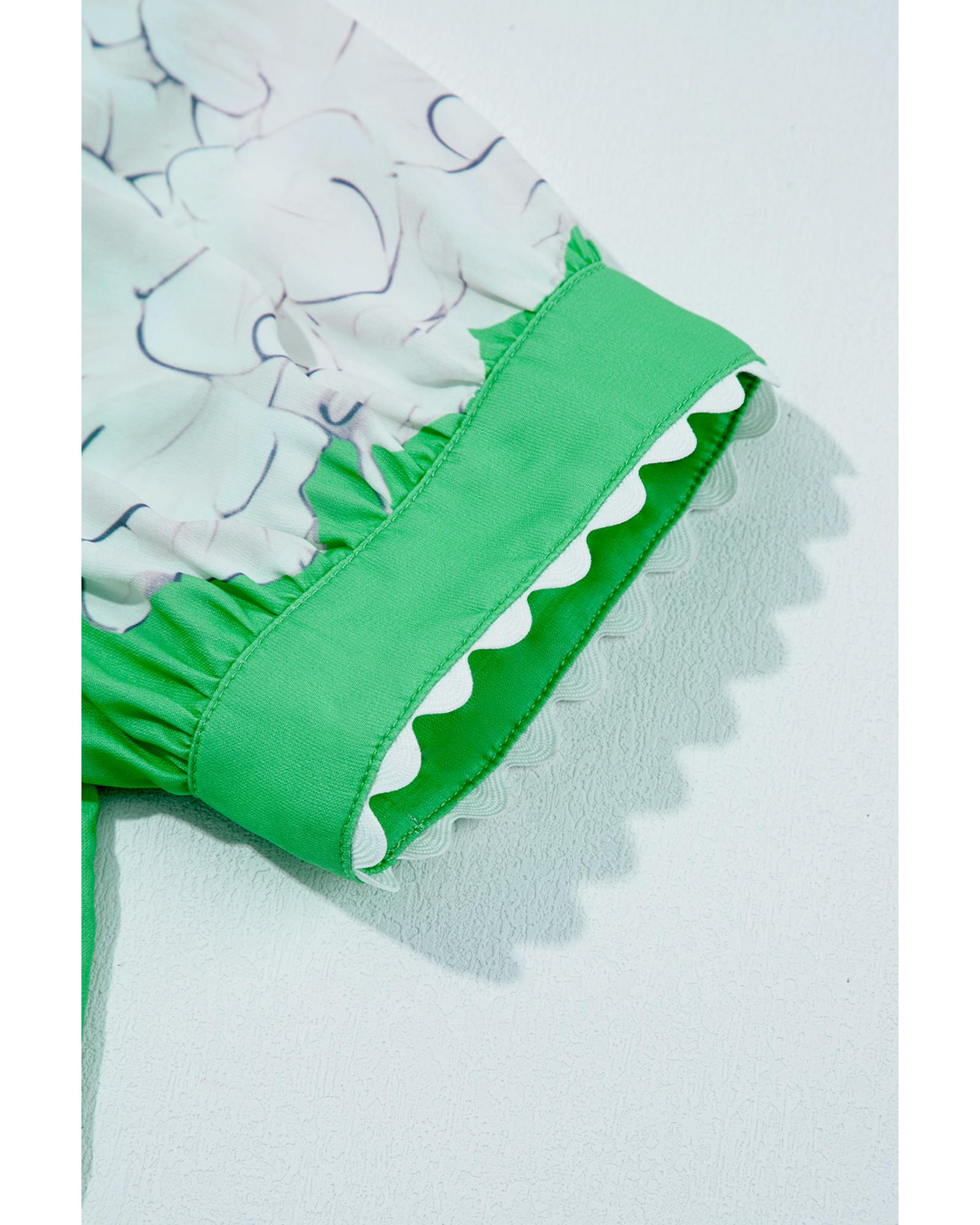 - Green Floral Ric Rac Edge Puff Sleeve Button Up Summer Shirt