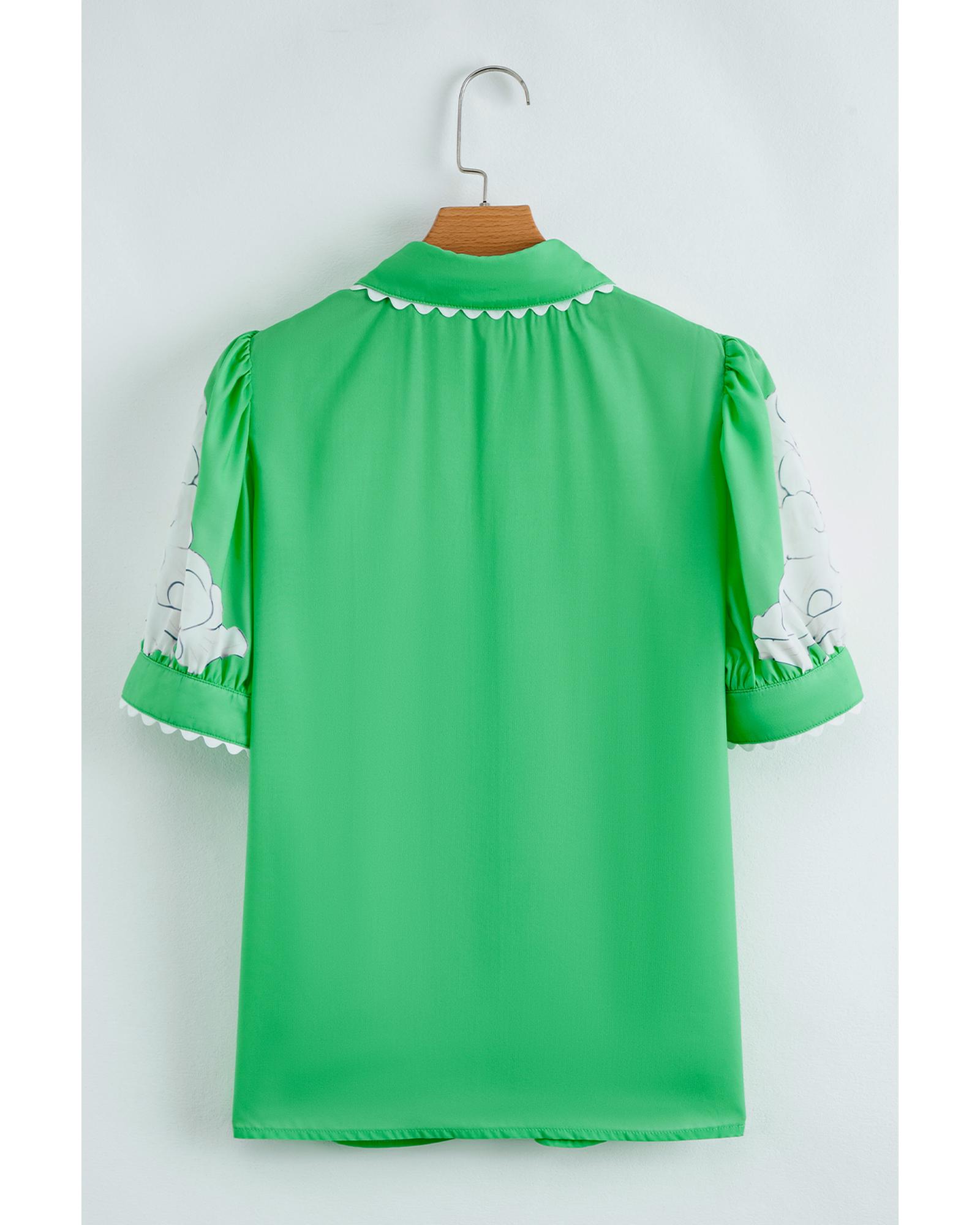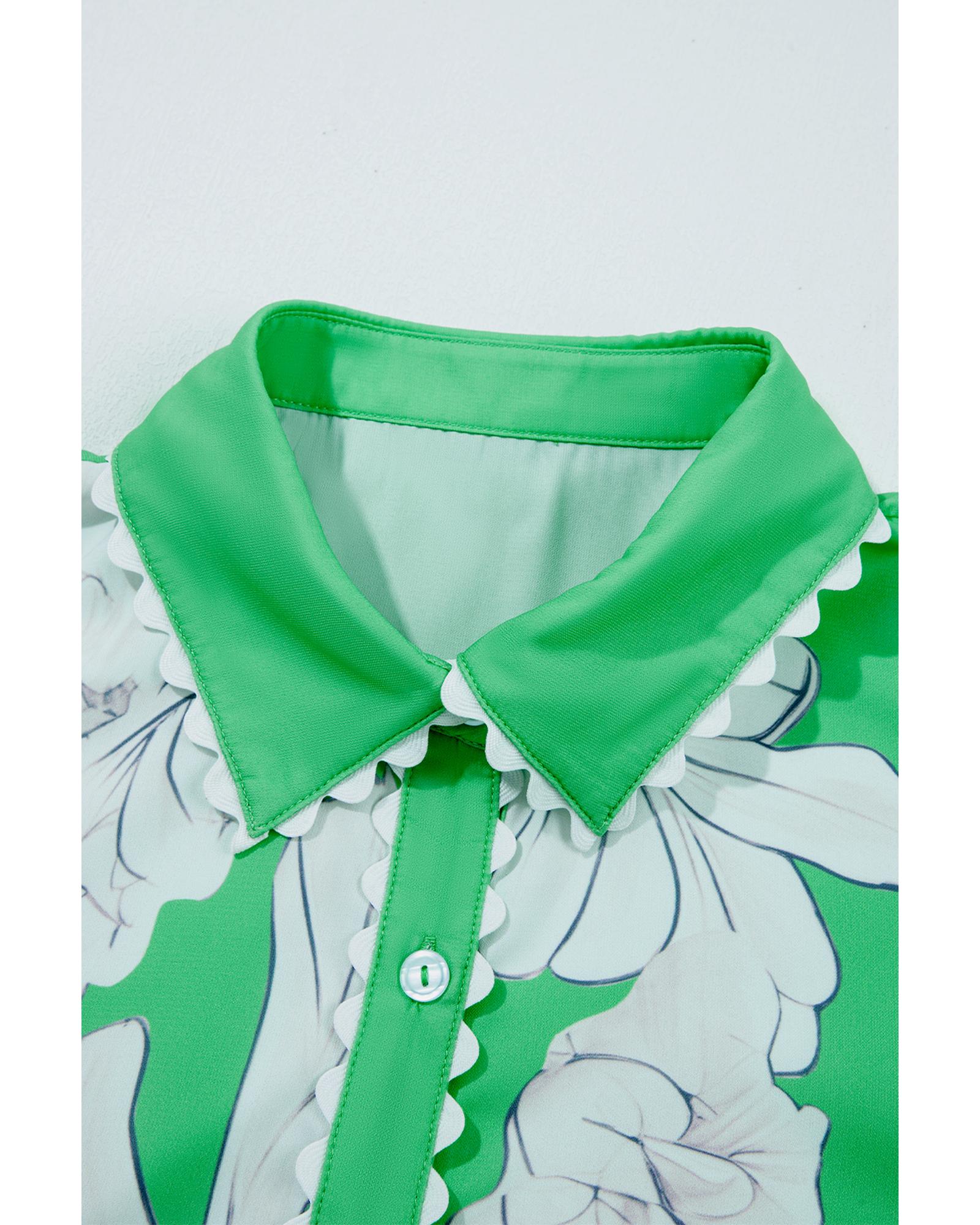 - Green Floral Ric Rac Edge Puff Sleeve Button Up Summer Shirt