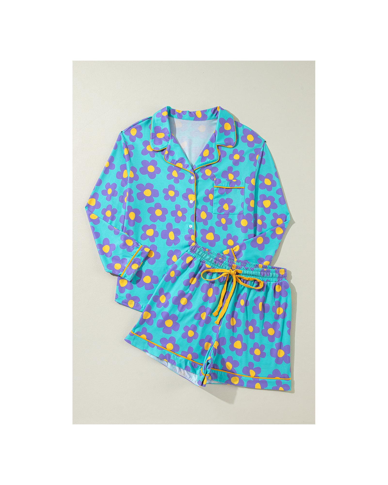 - Green Flower Print Long Sleeve Shirt Shorts Pajamas Set