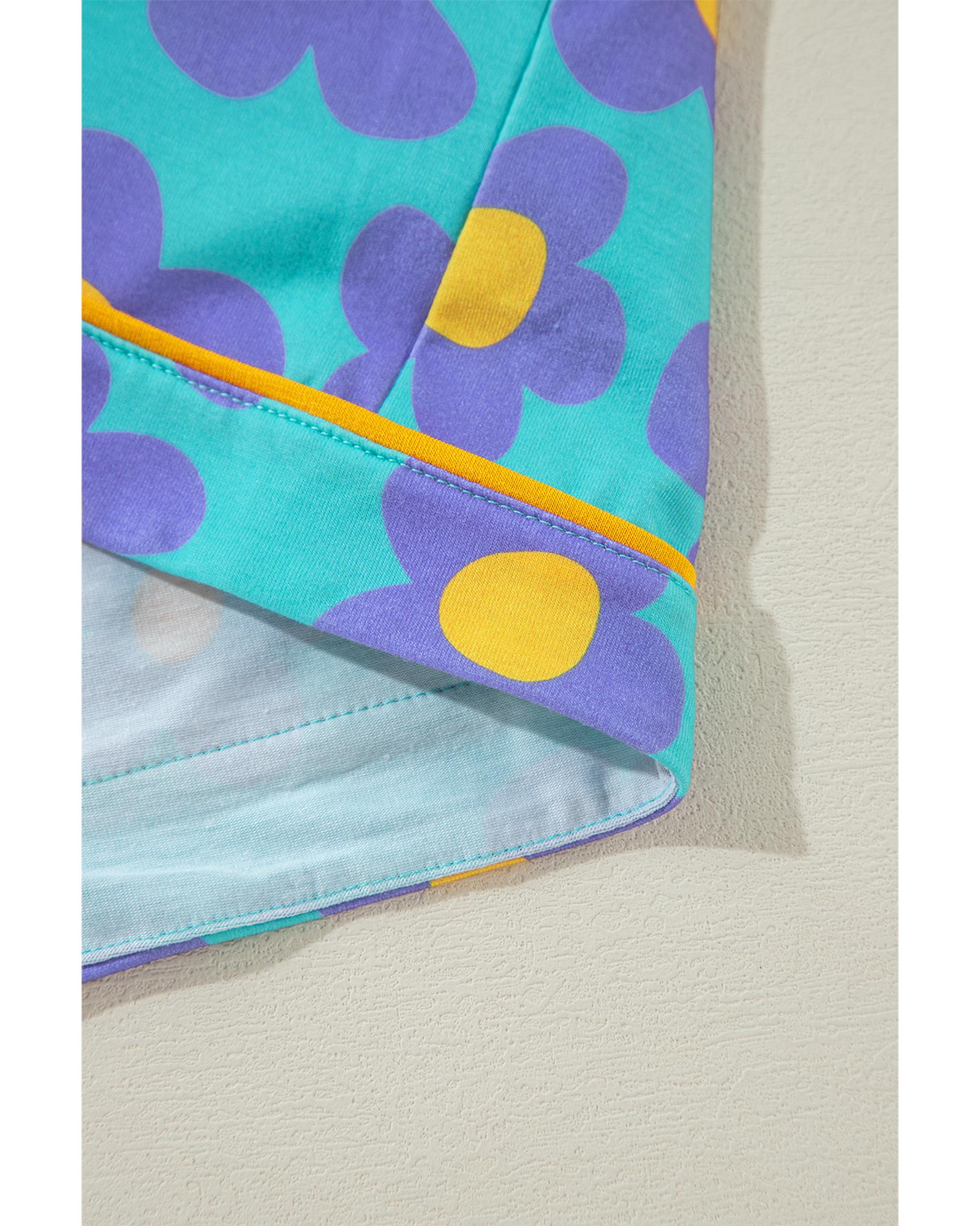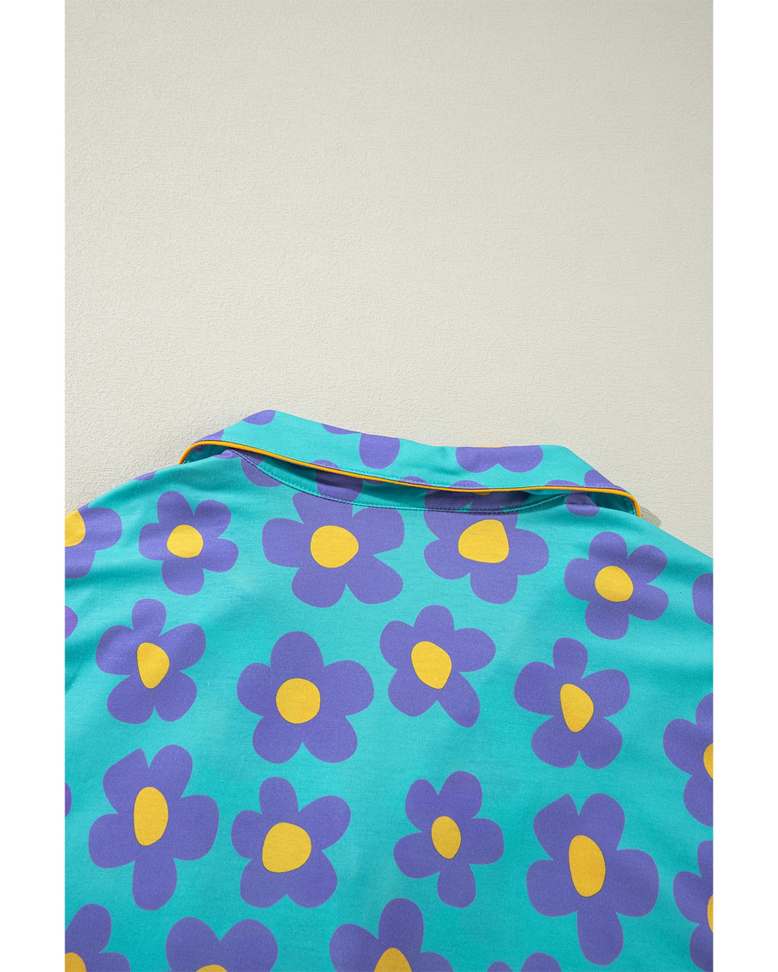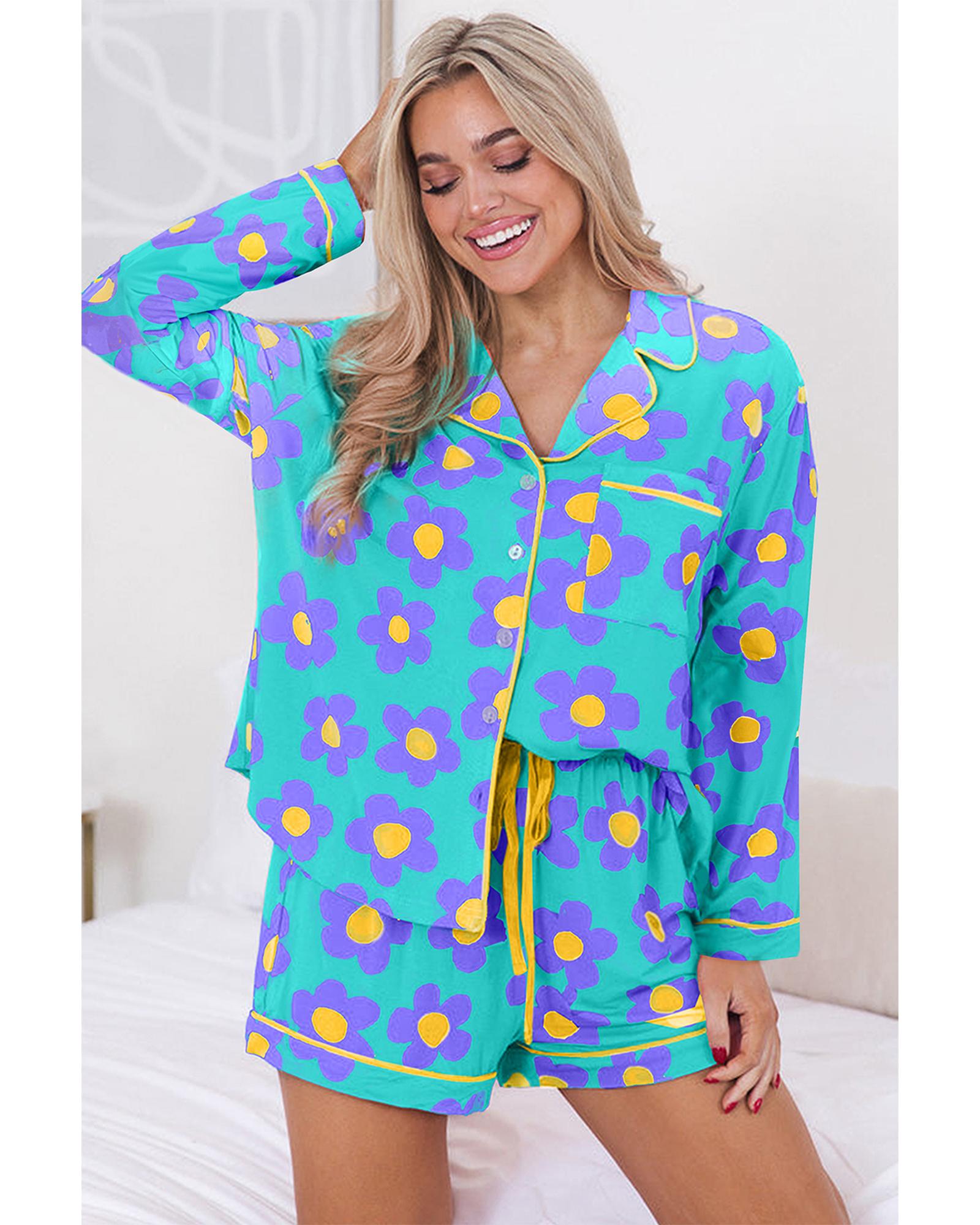 - Green Flower Print Long Sleeve Shirt Shorts Pajamas Set