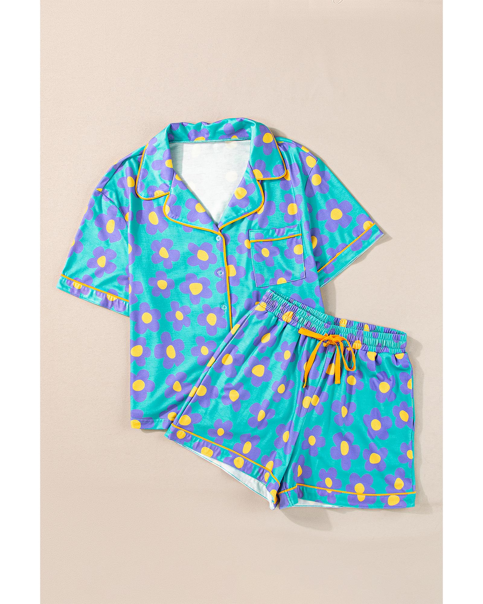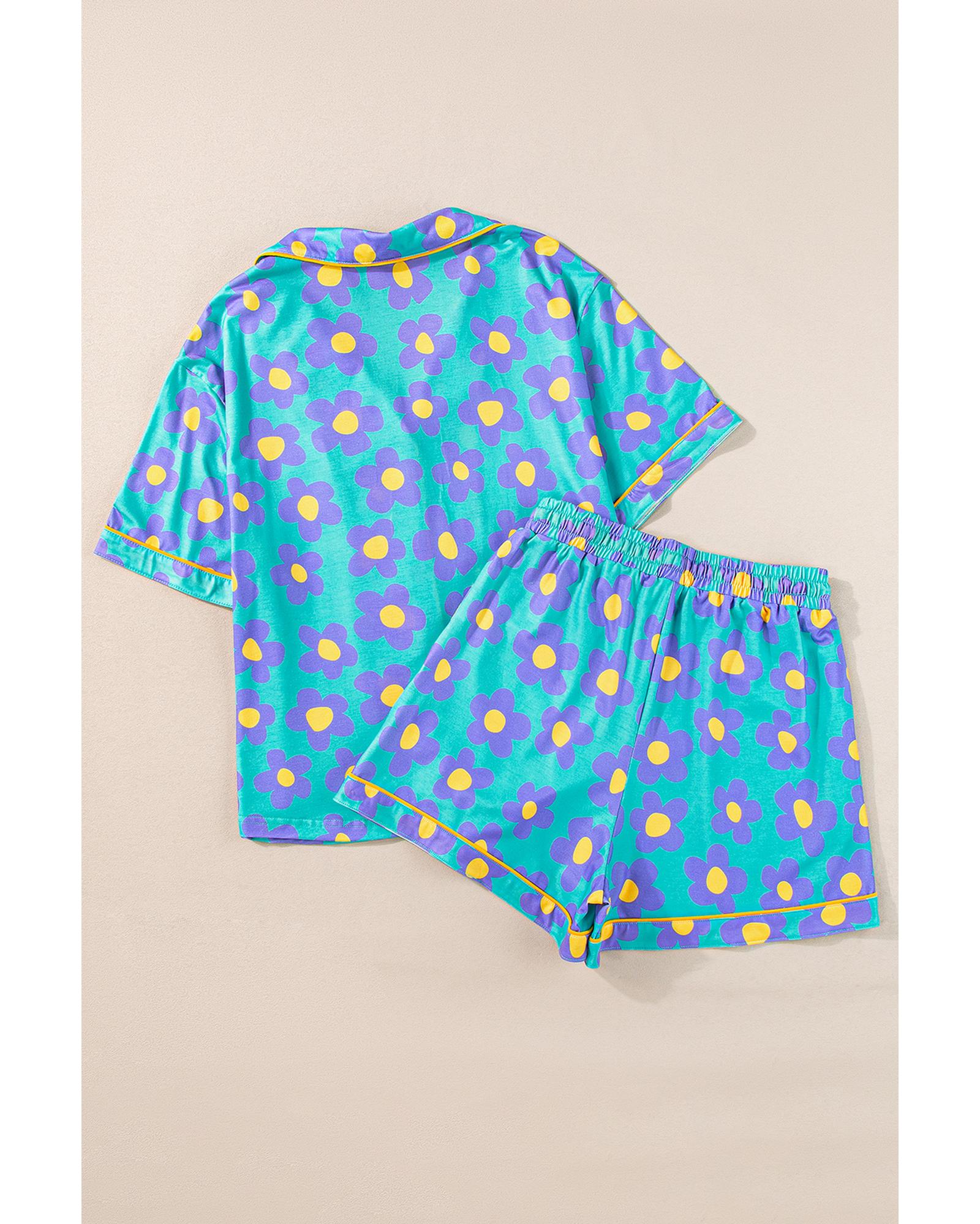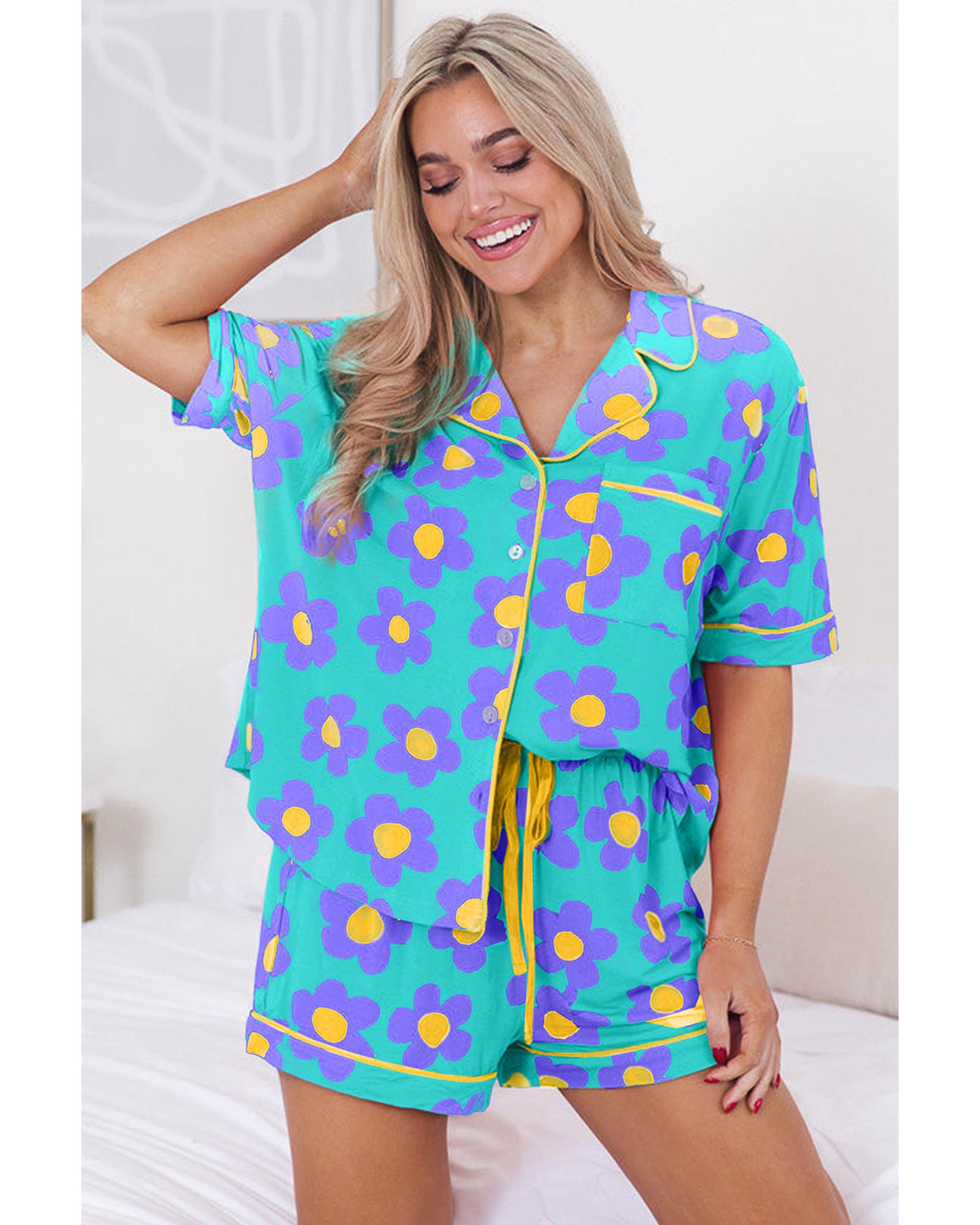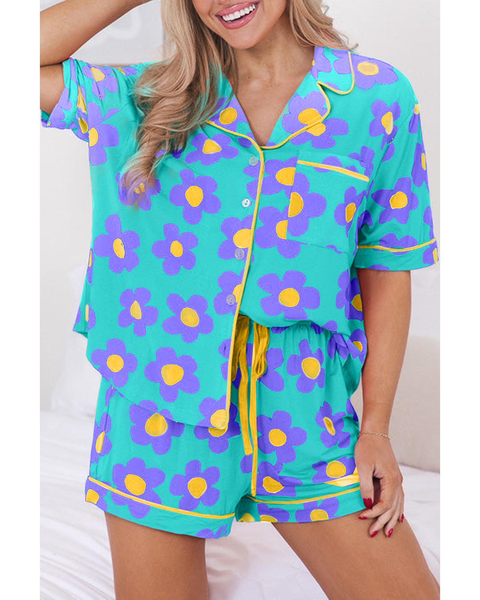 Green Flower Print Short Sleeve Shirt Pajamas Set – L