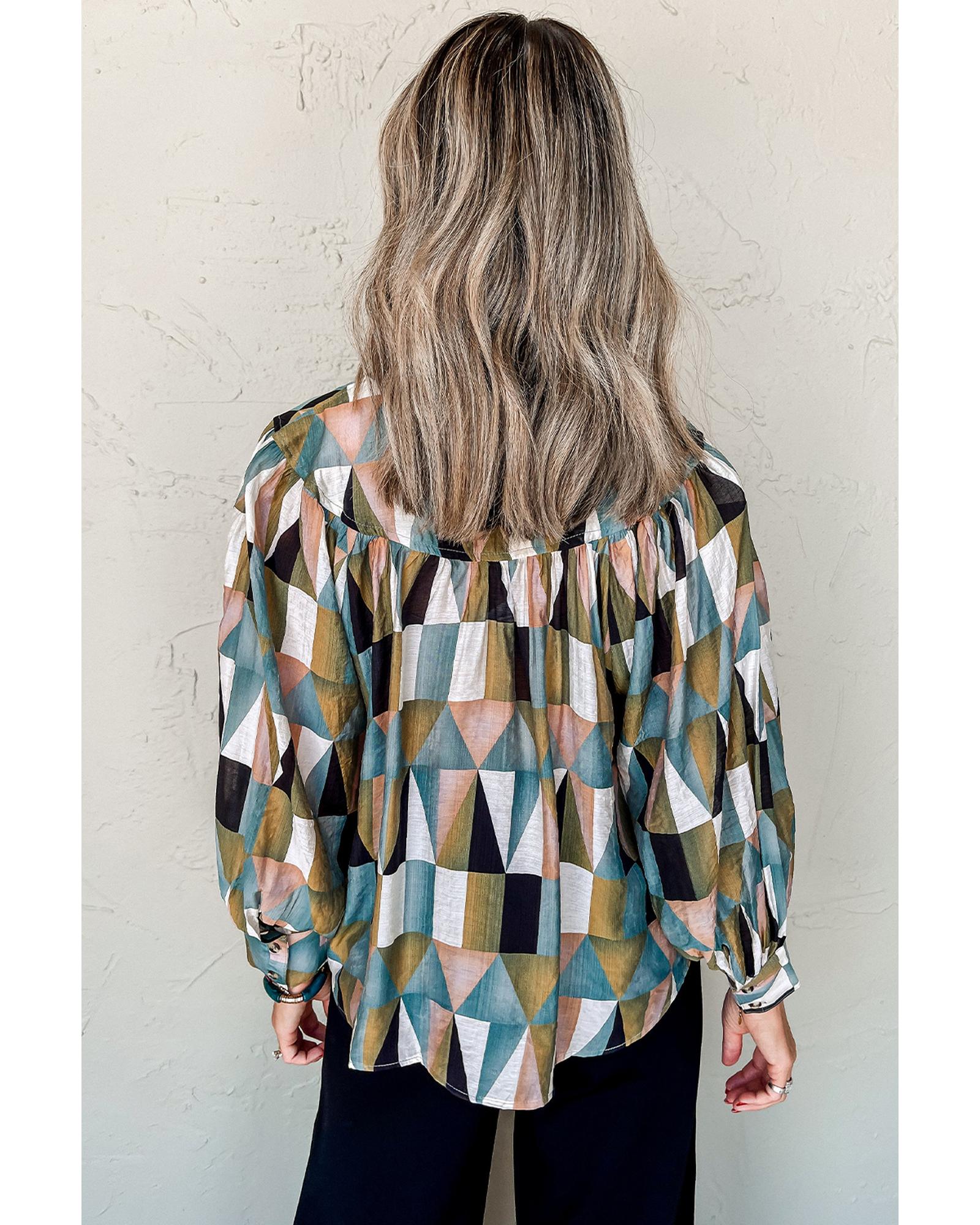 Green Geometric Print Buttoned Balloon Sleeve Loose Fit Shirt – S