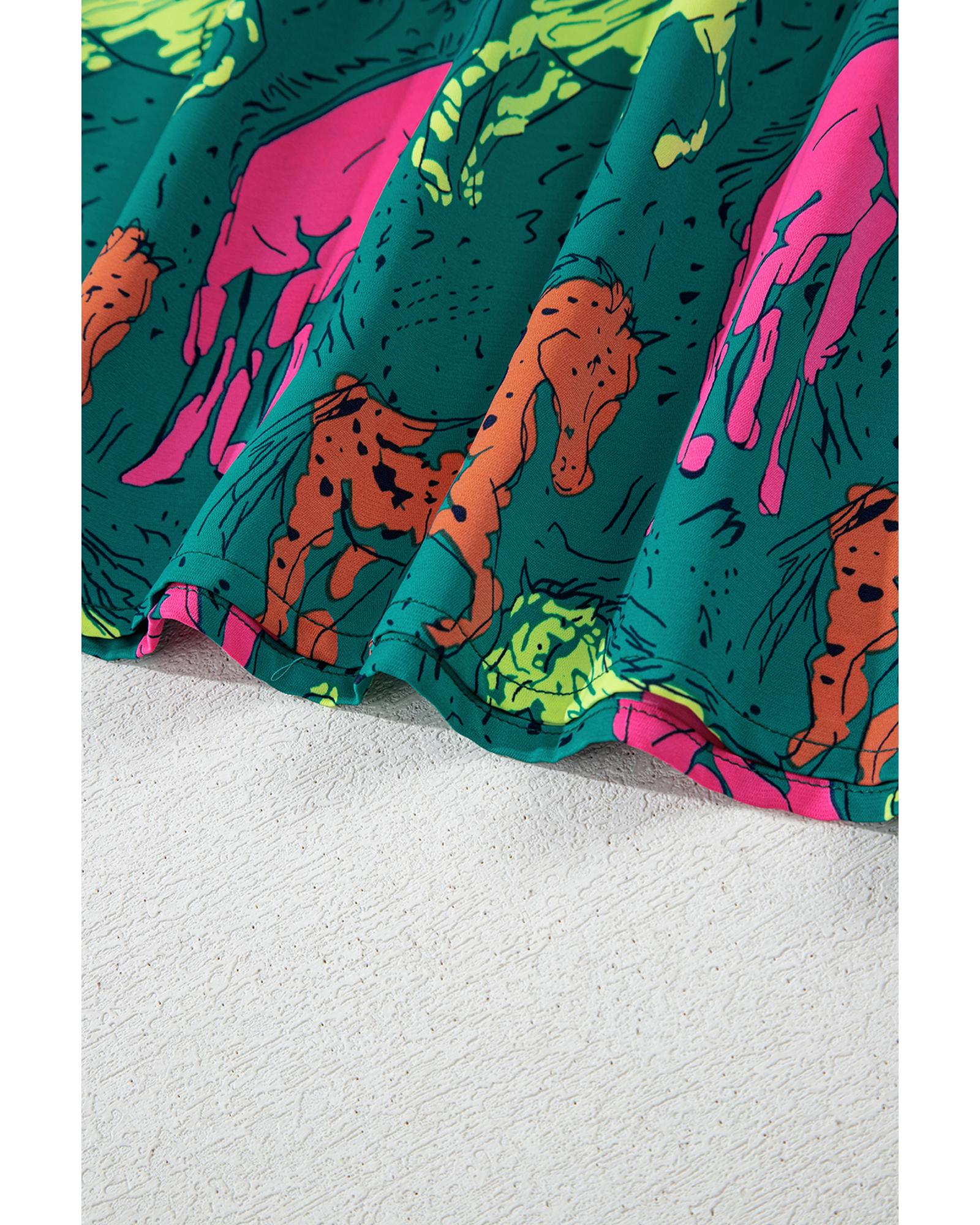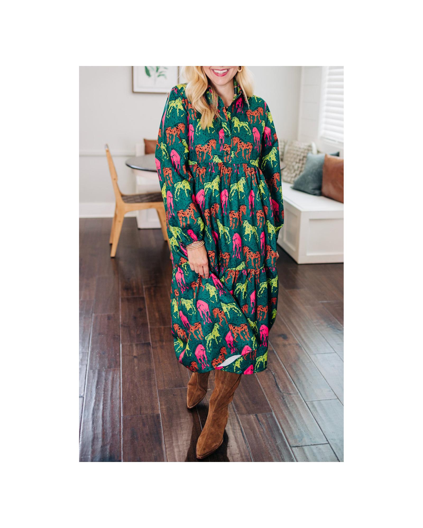 Green Horse Printed Long Sleeve Collared Buttoned Plus Size Midi Dress – 2X