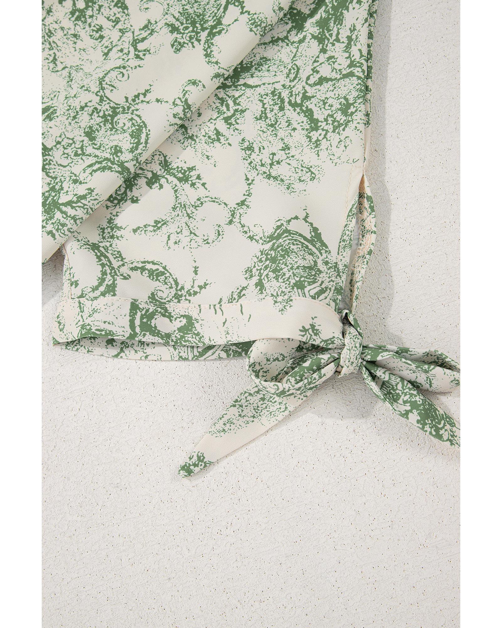 Green Landscape Print Tied 3/4 Sleeve Shirt with Sash – M