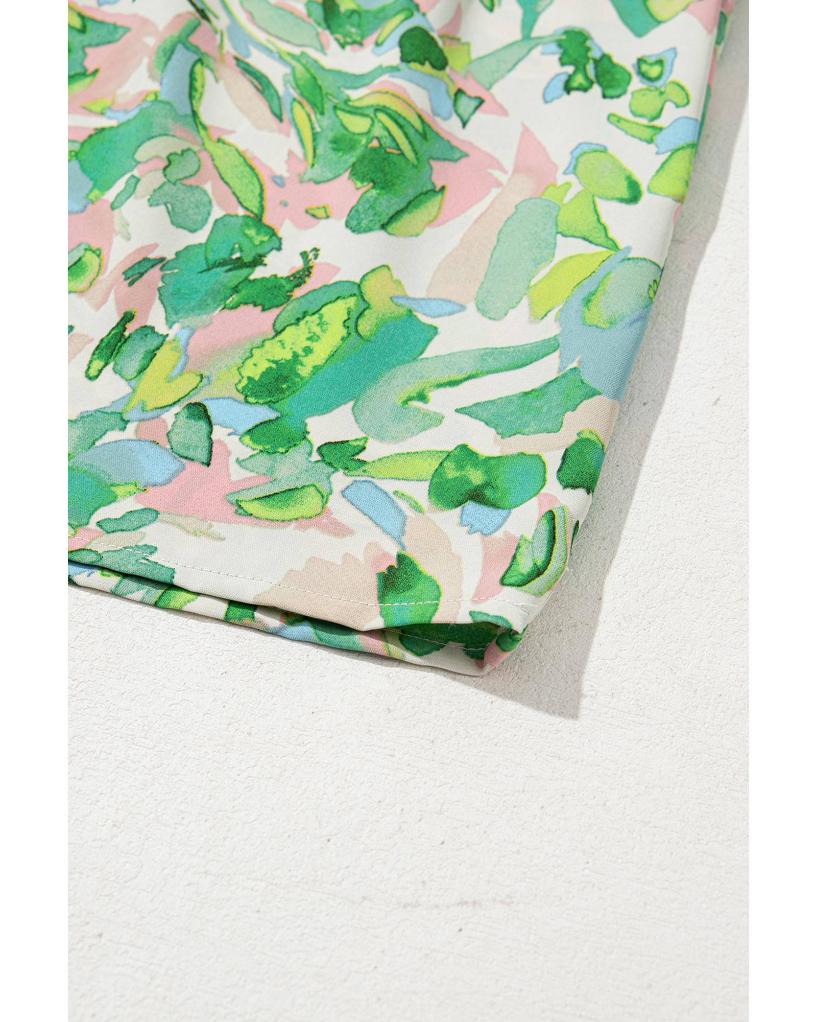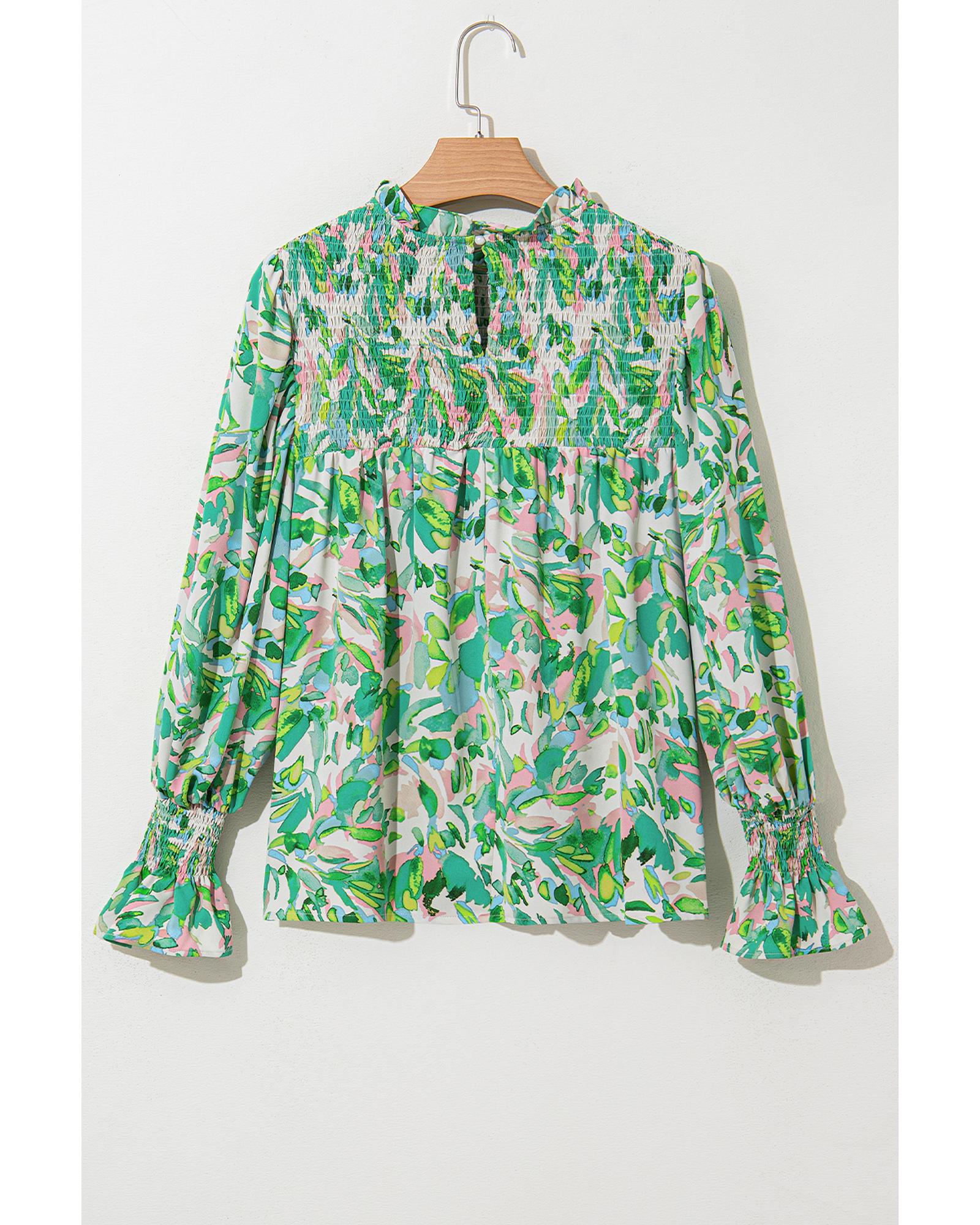 Green Leafy Printed Flounce Sleeve Shirred Mock Neck Blouse – L