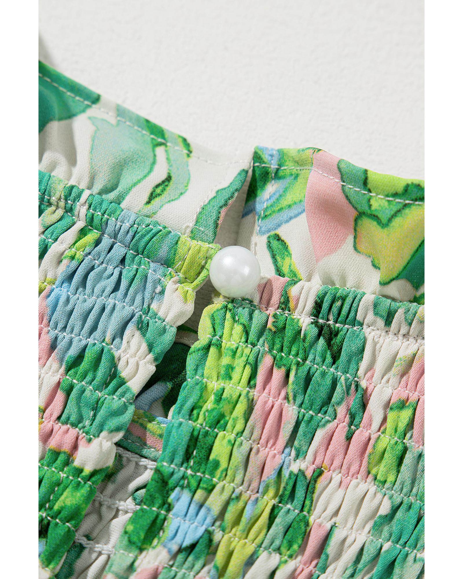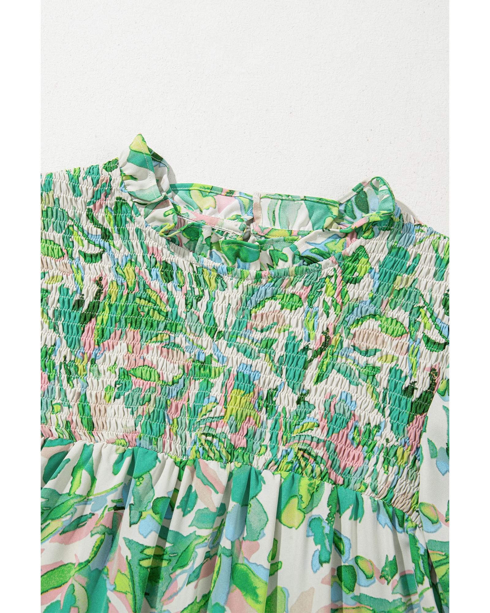 Green Leafy Printed Flounce Sleeve Shirred Mock Neck Blouse – S