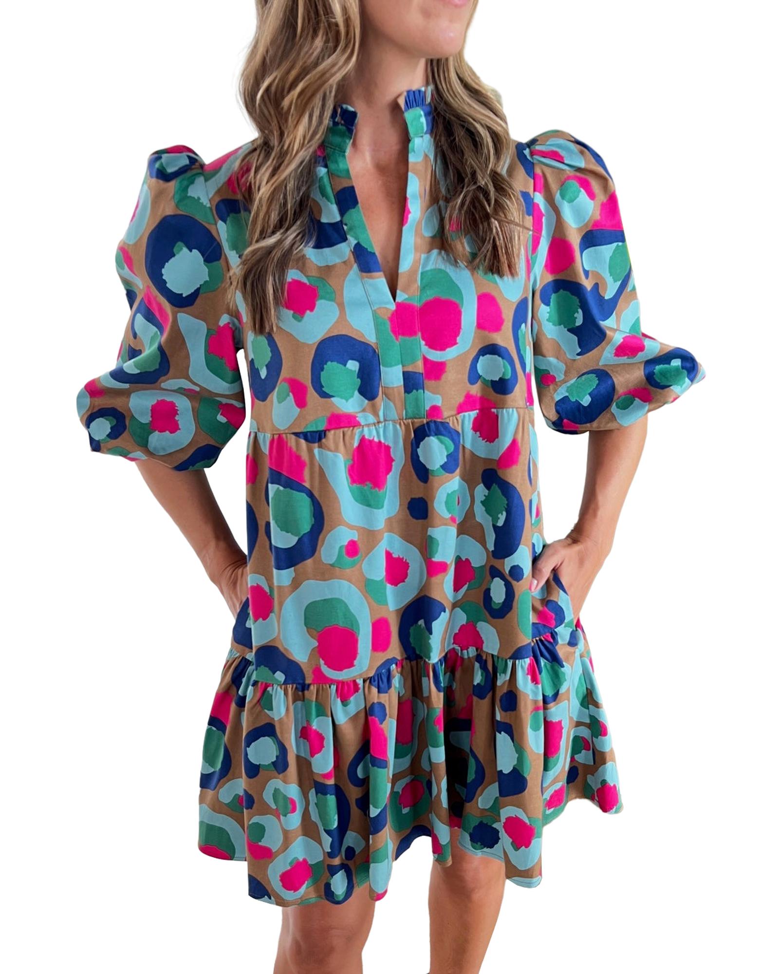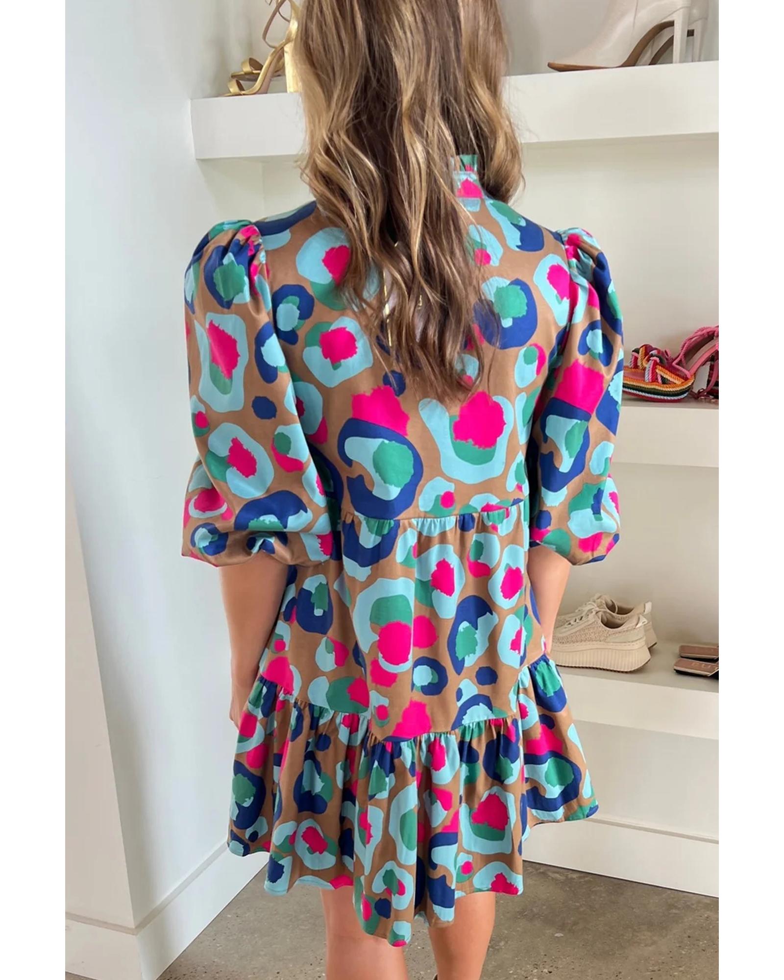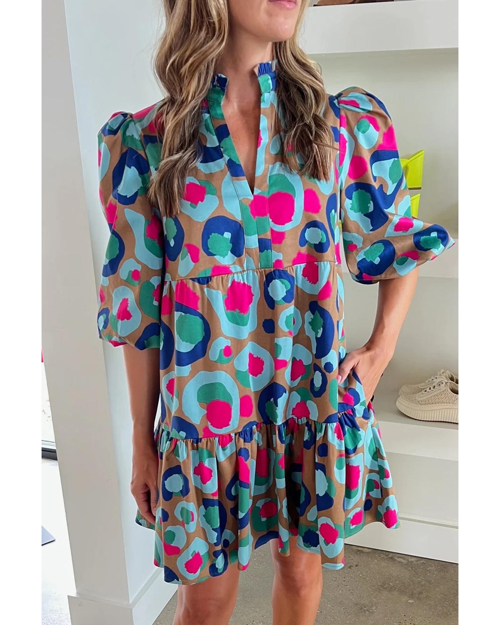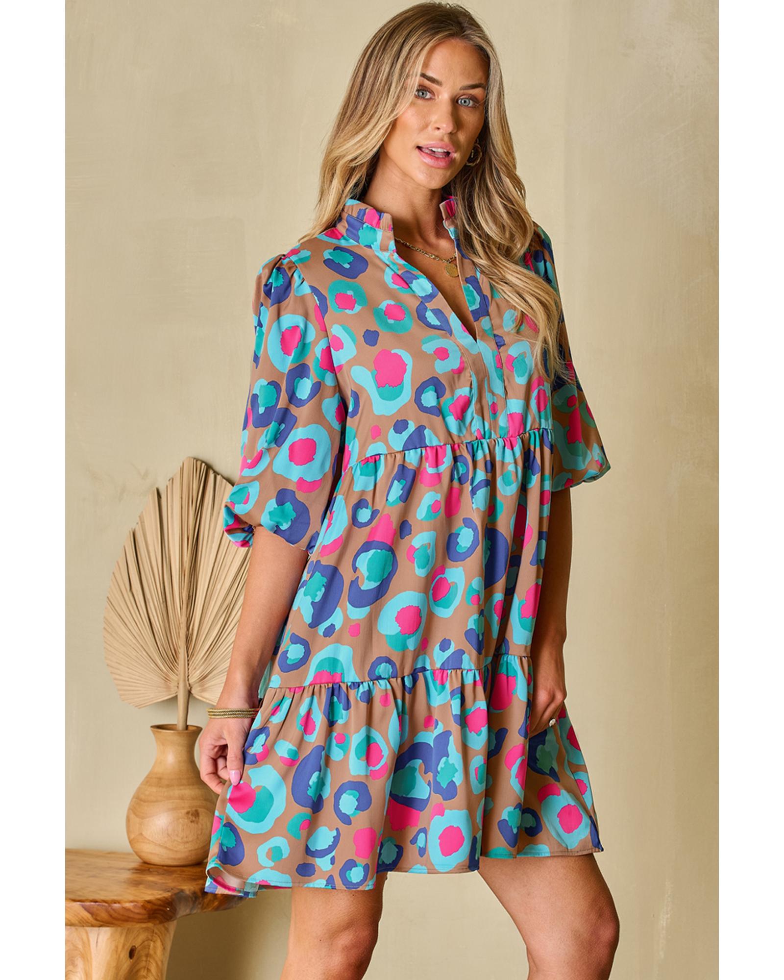 Green Leopard Print Bubble Sleeve Slit Neck Ruffled Dress – L
