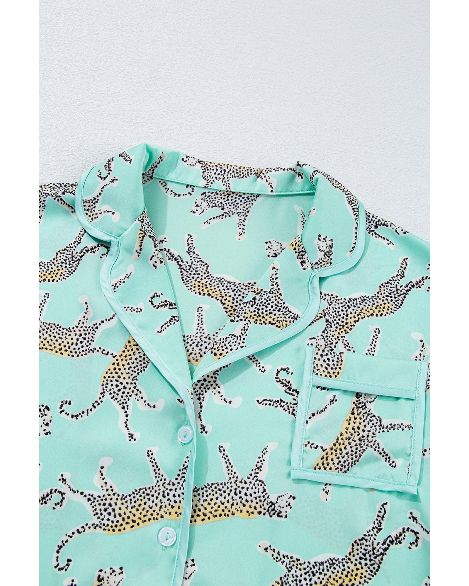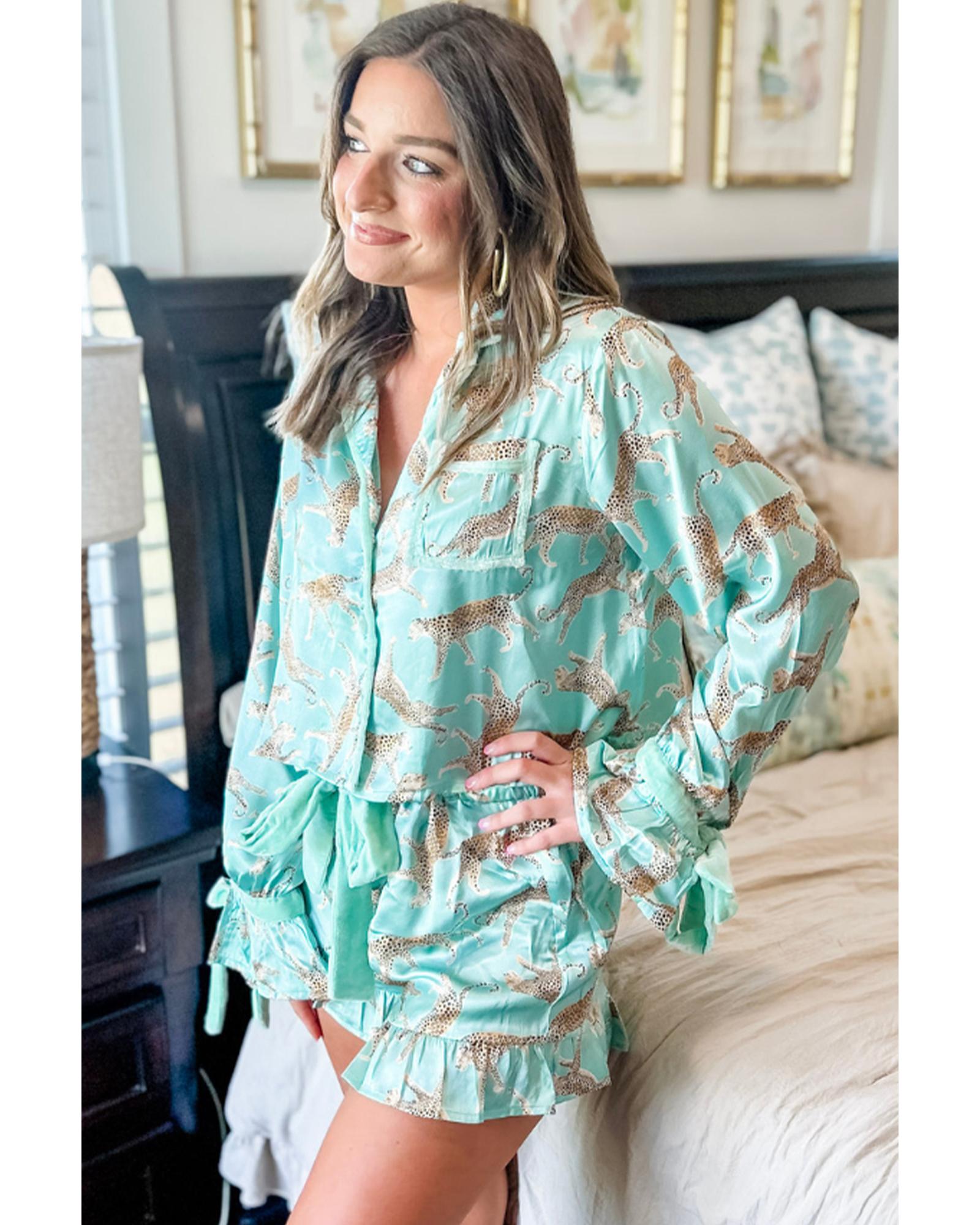 Green Leopard Satin Ruffle Pajama Short Set – XL