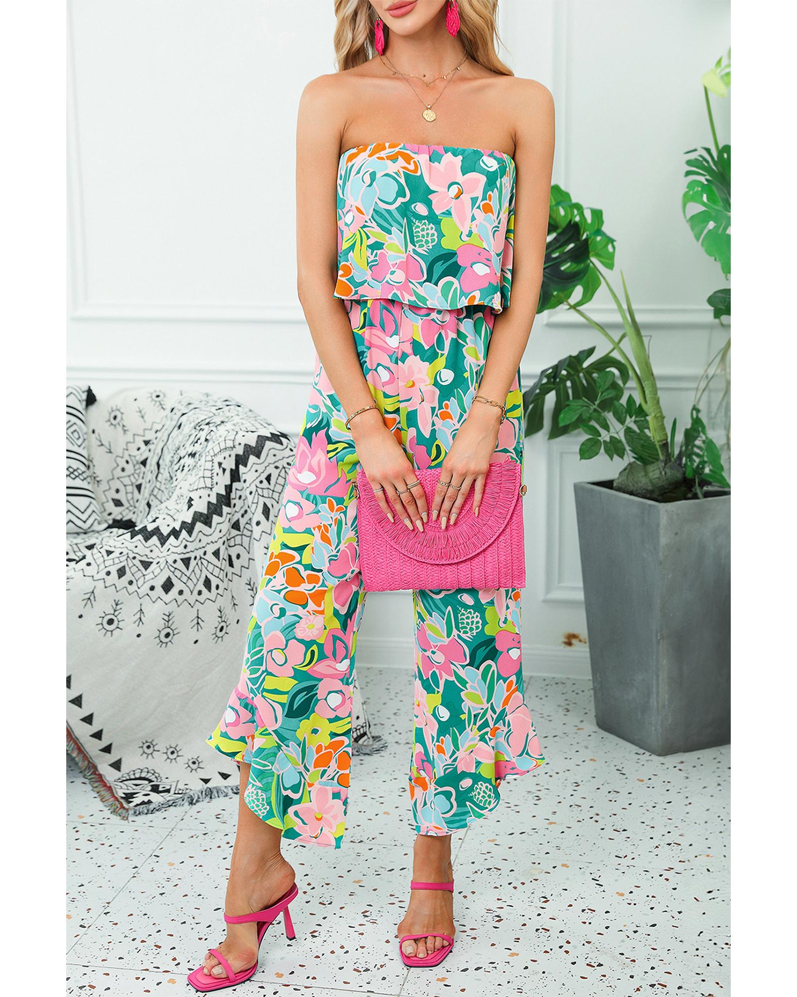 Green Mix Tropical Print Strapless Ruffled Jumpsuit – XL