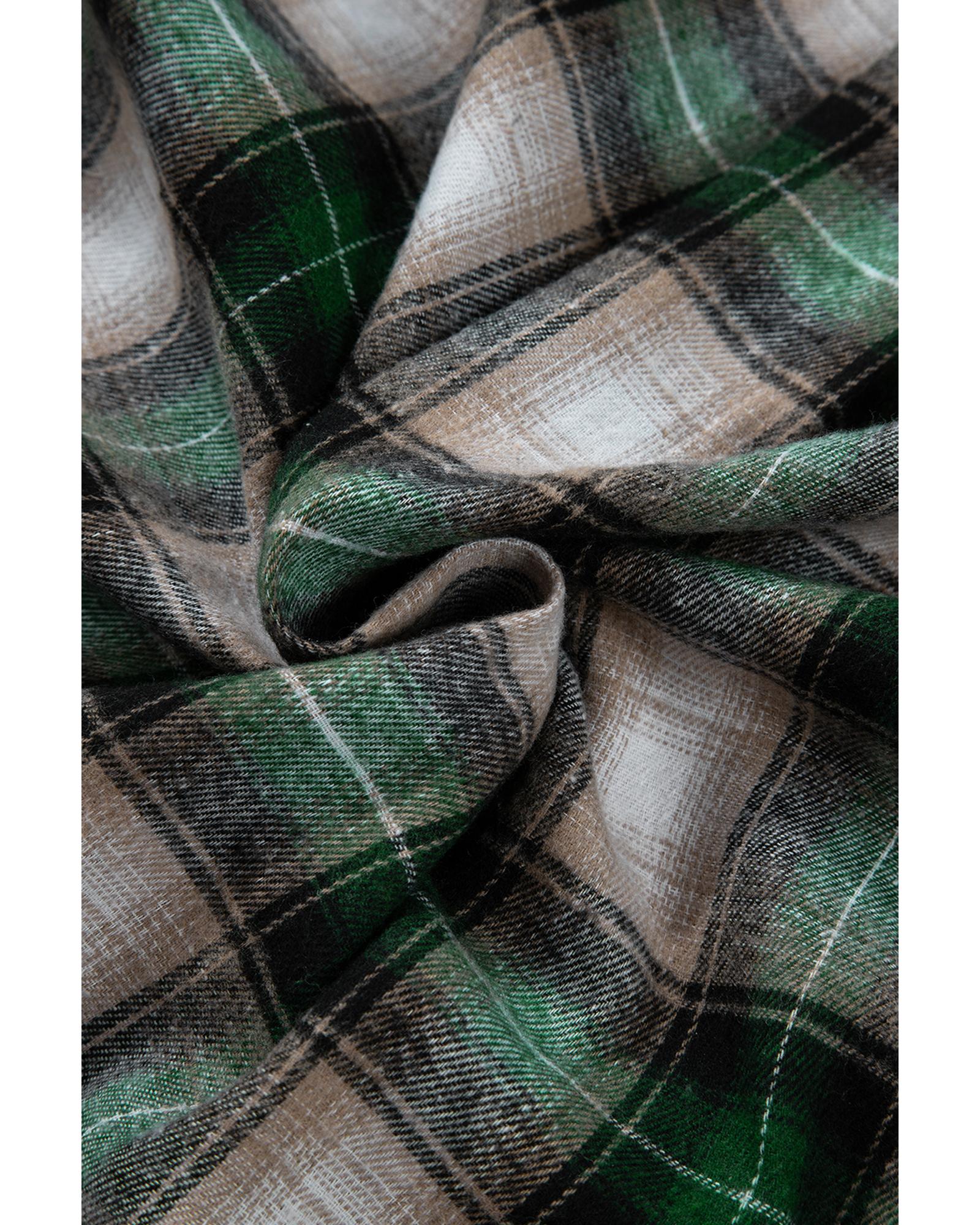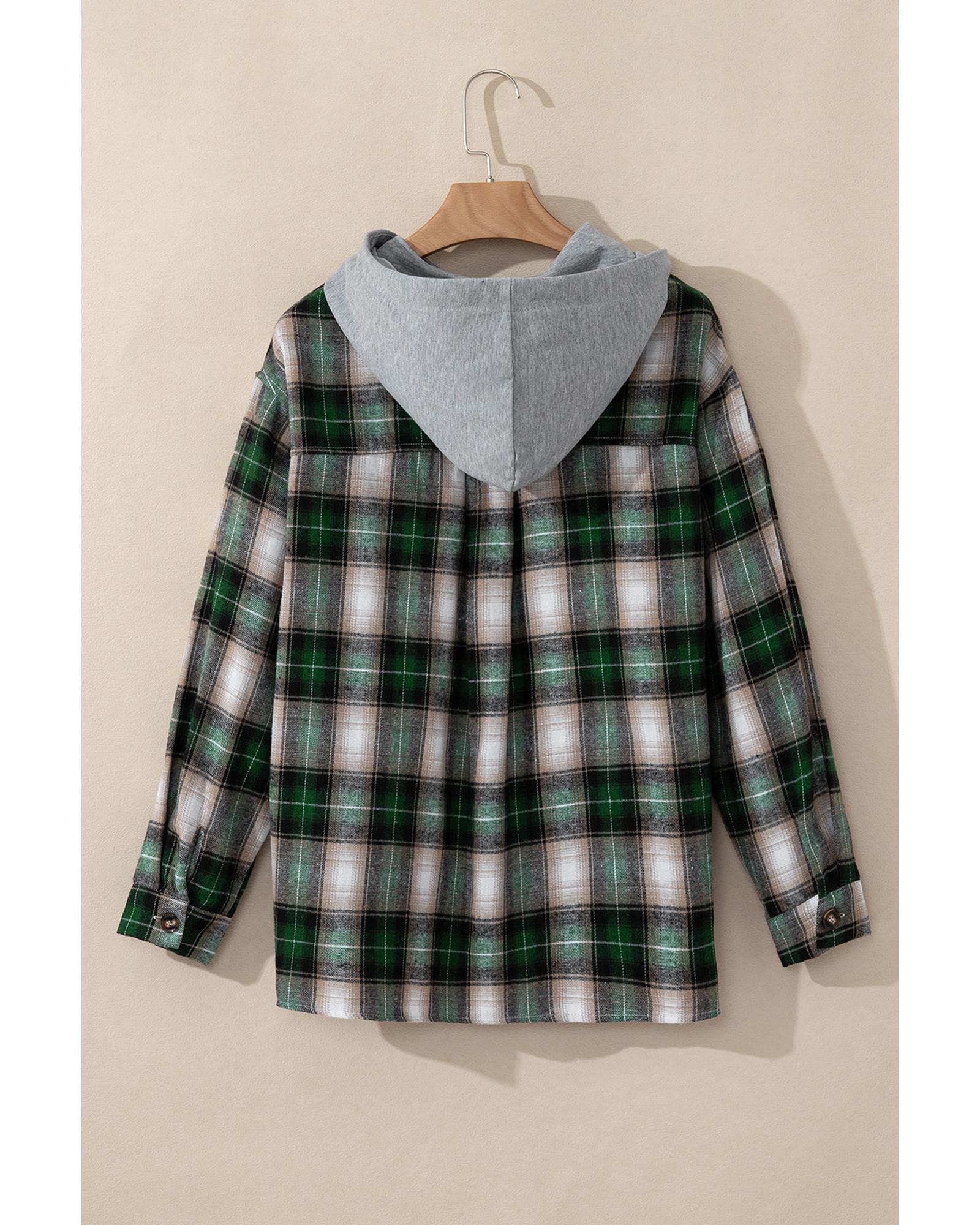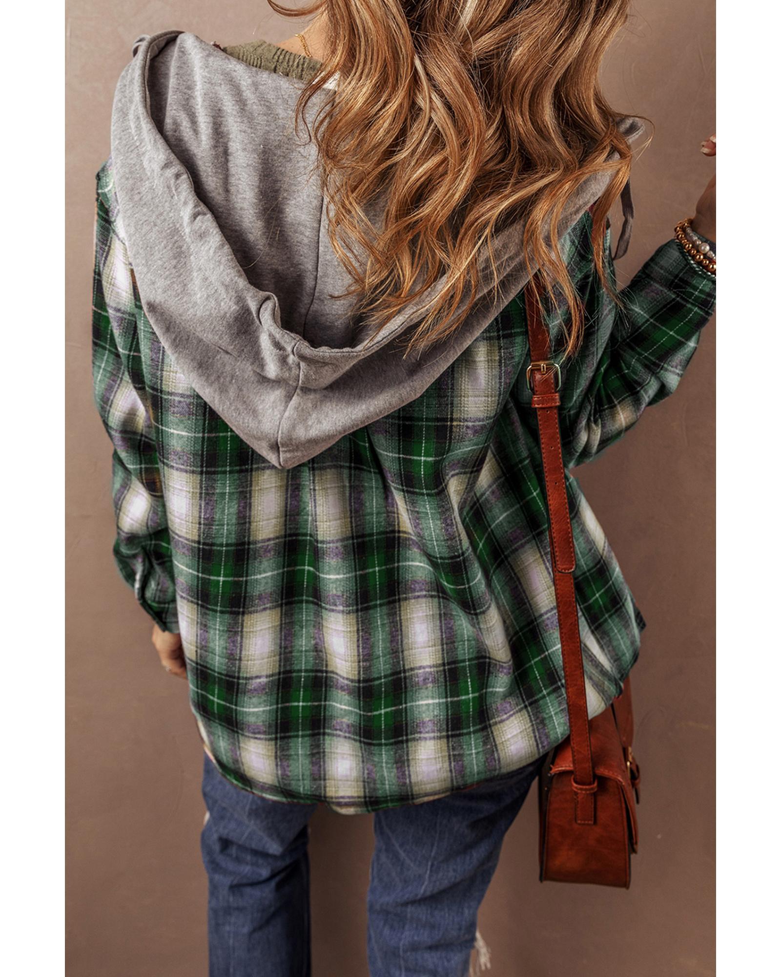 Green Plaid Print Chest Pocket Buttoned Hooded Shacket – L