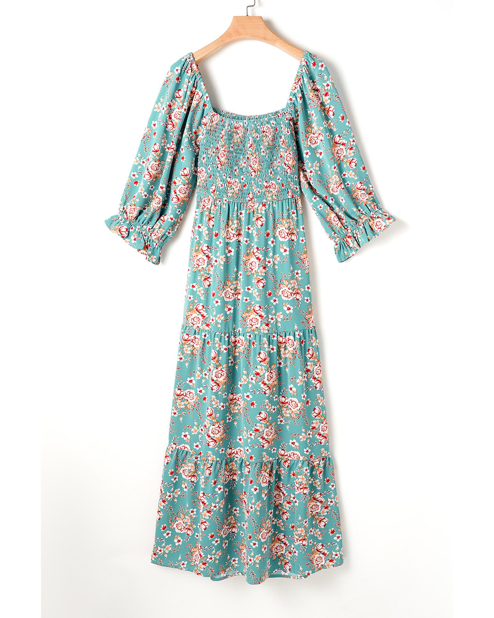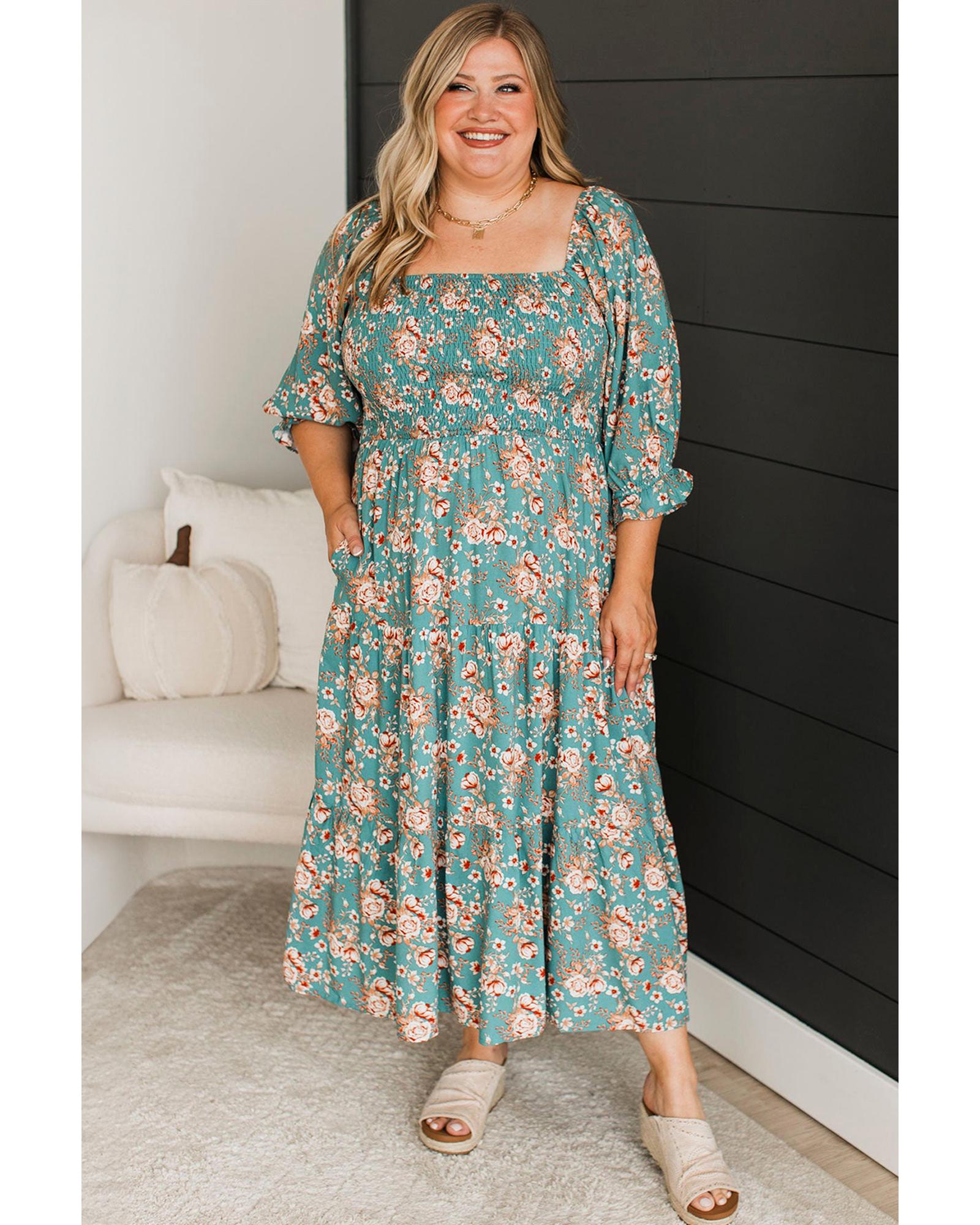 - Green Plus Size Floral Print Square Neck Smocked Maxi Dress
