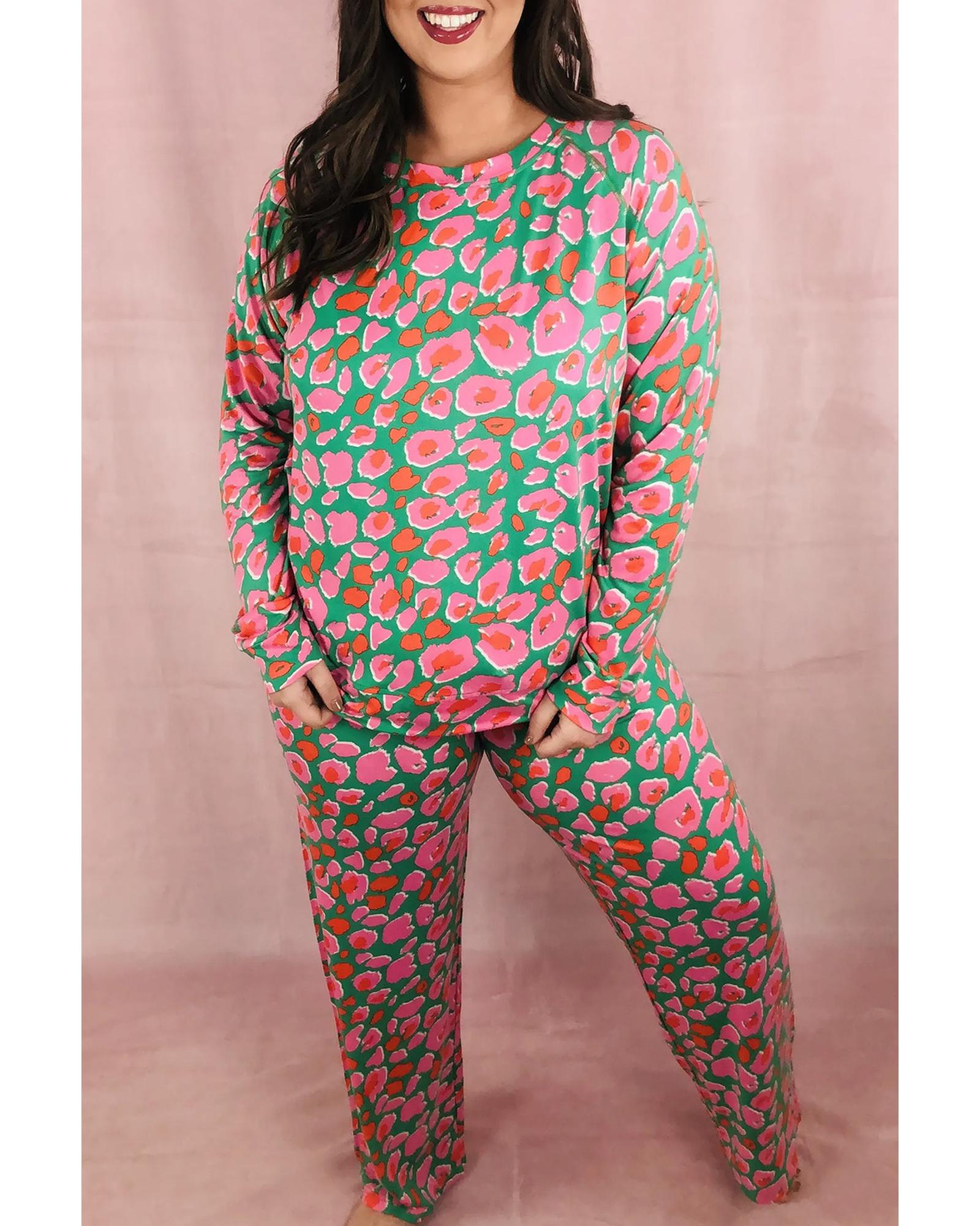 Green Plus Size Printed Long Sleeve and Pants Lounge Set – 2X