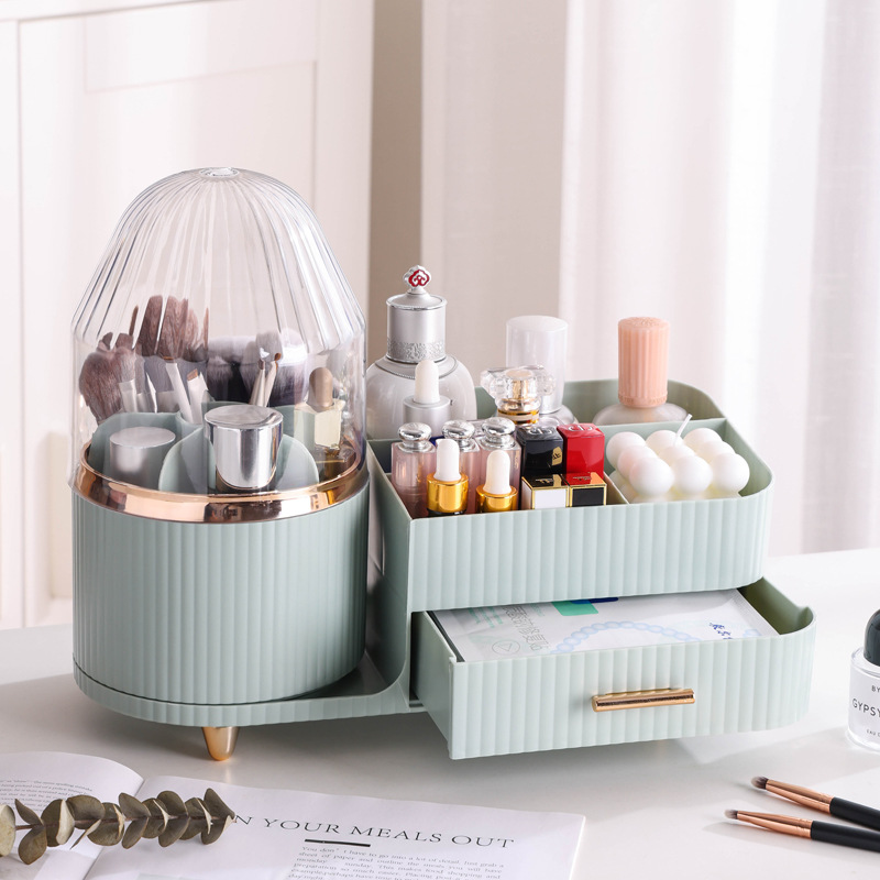 Green Rotating Makeup Organizer Box – Multi-Compartment Cosmetic Storage with Dustproof Cover