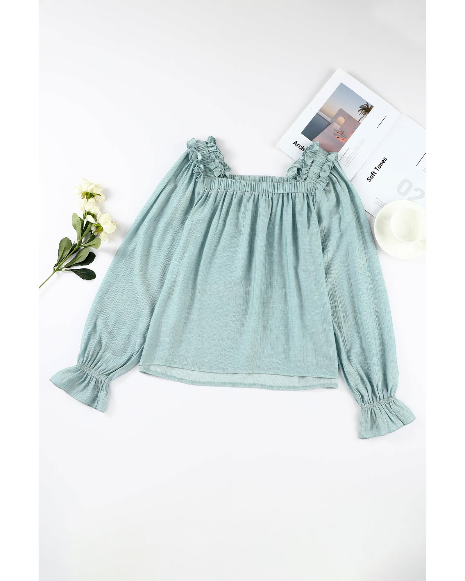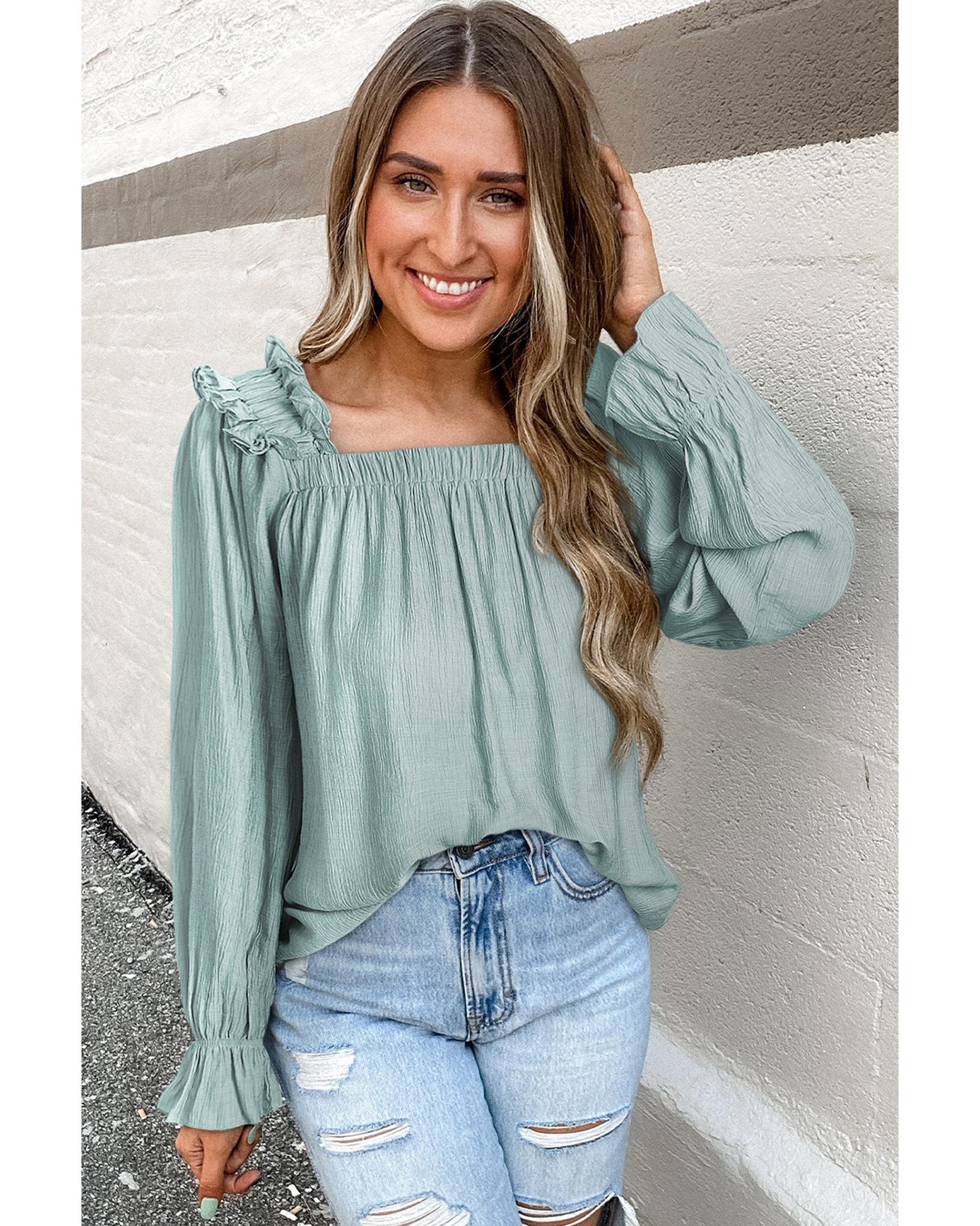 Green Ruffled Square Neck Cuffs Long Sleeve Blouse – M