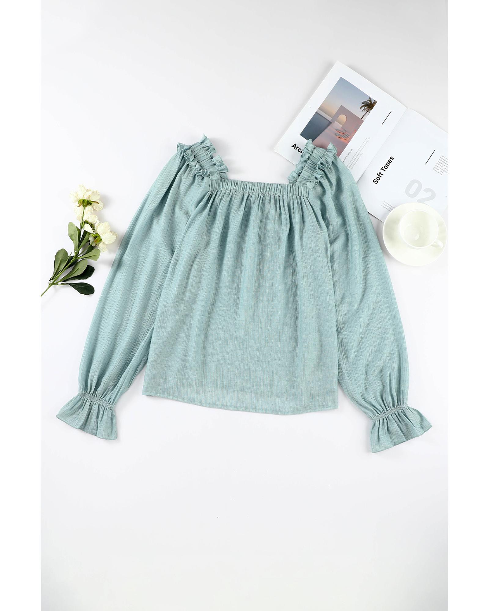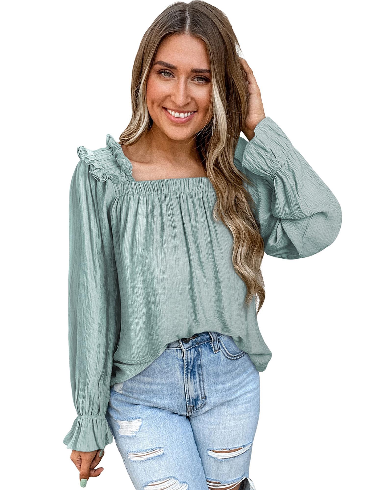 Green Ruffled Square Neck Cuffs Long Sleeve Blouse – S