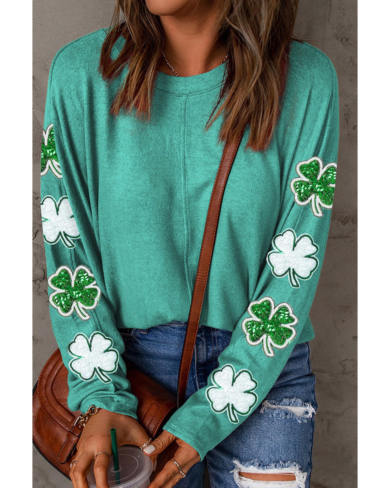 - Green sequined St Patrick clover patched long sleeve top