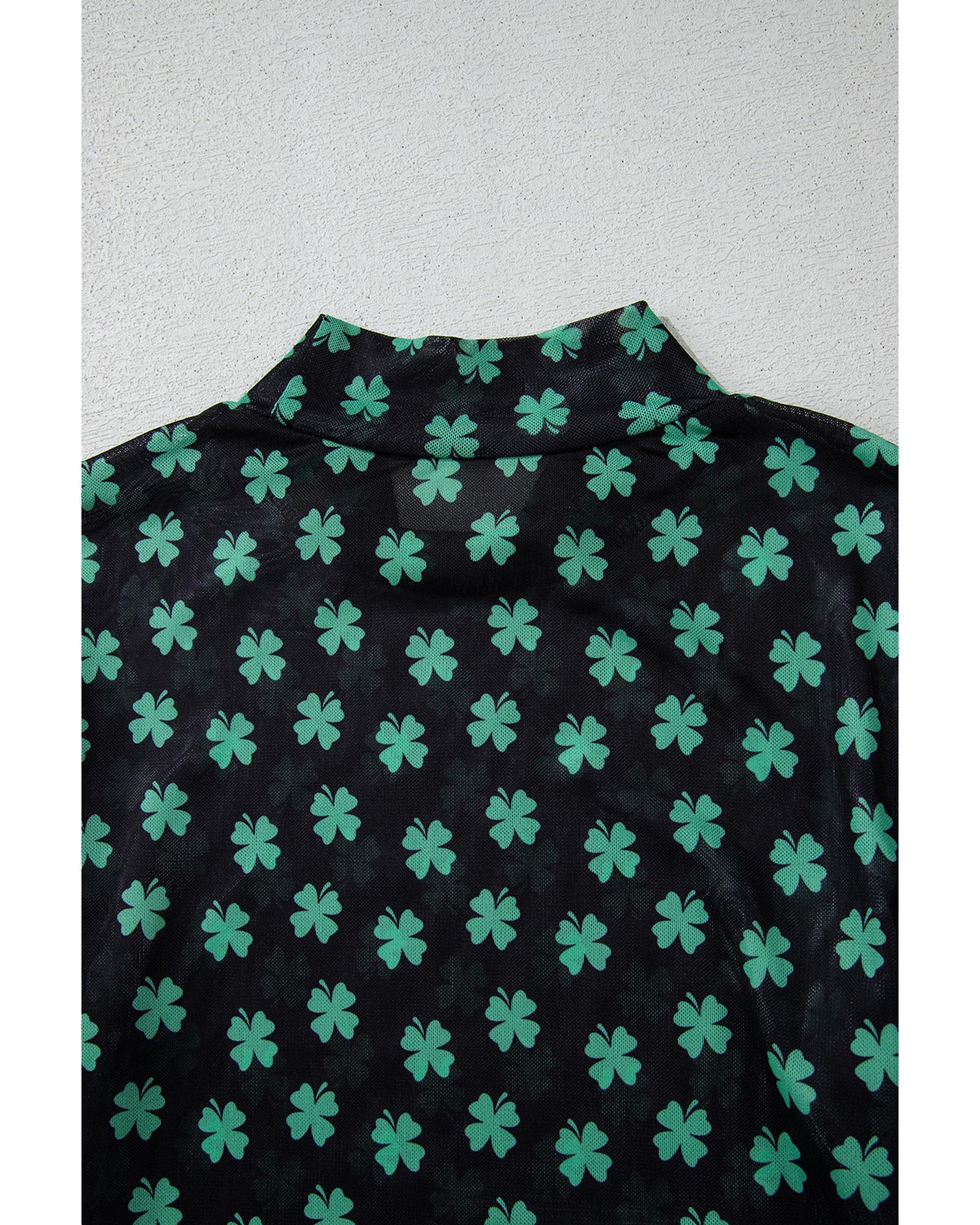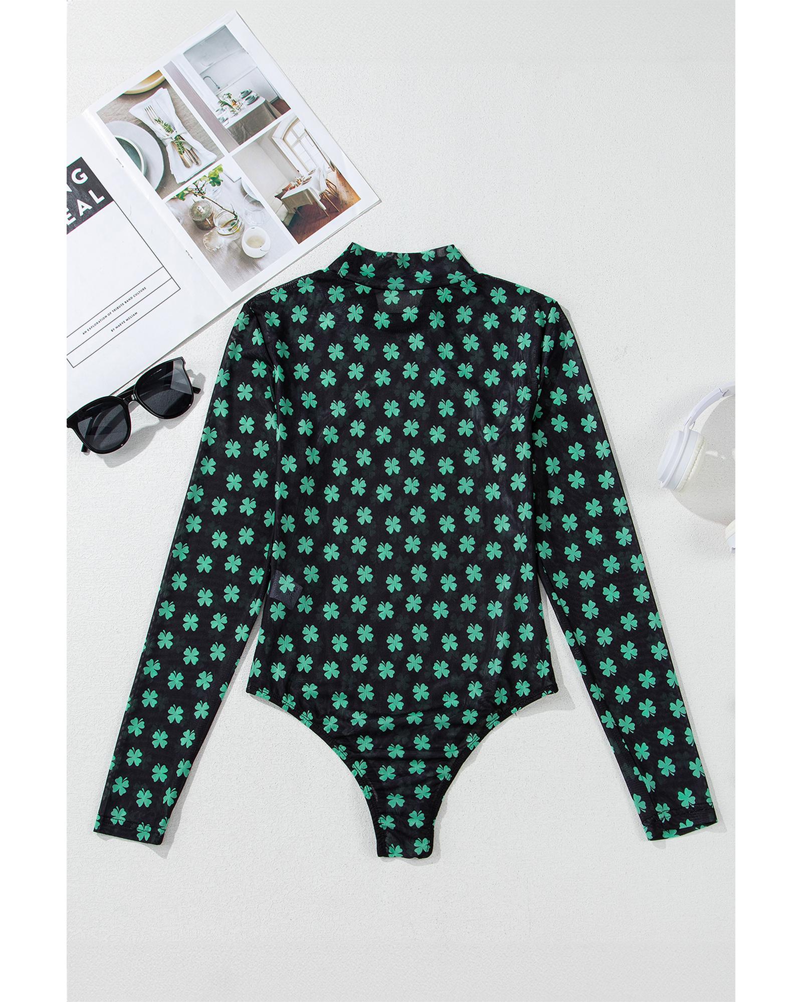 Green St Patrick Shamrock Printed Long Sleeve Mesh Bodysuit – XL
