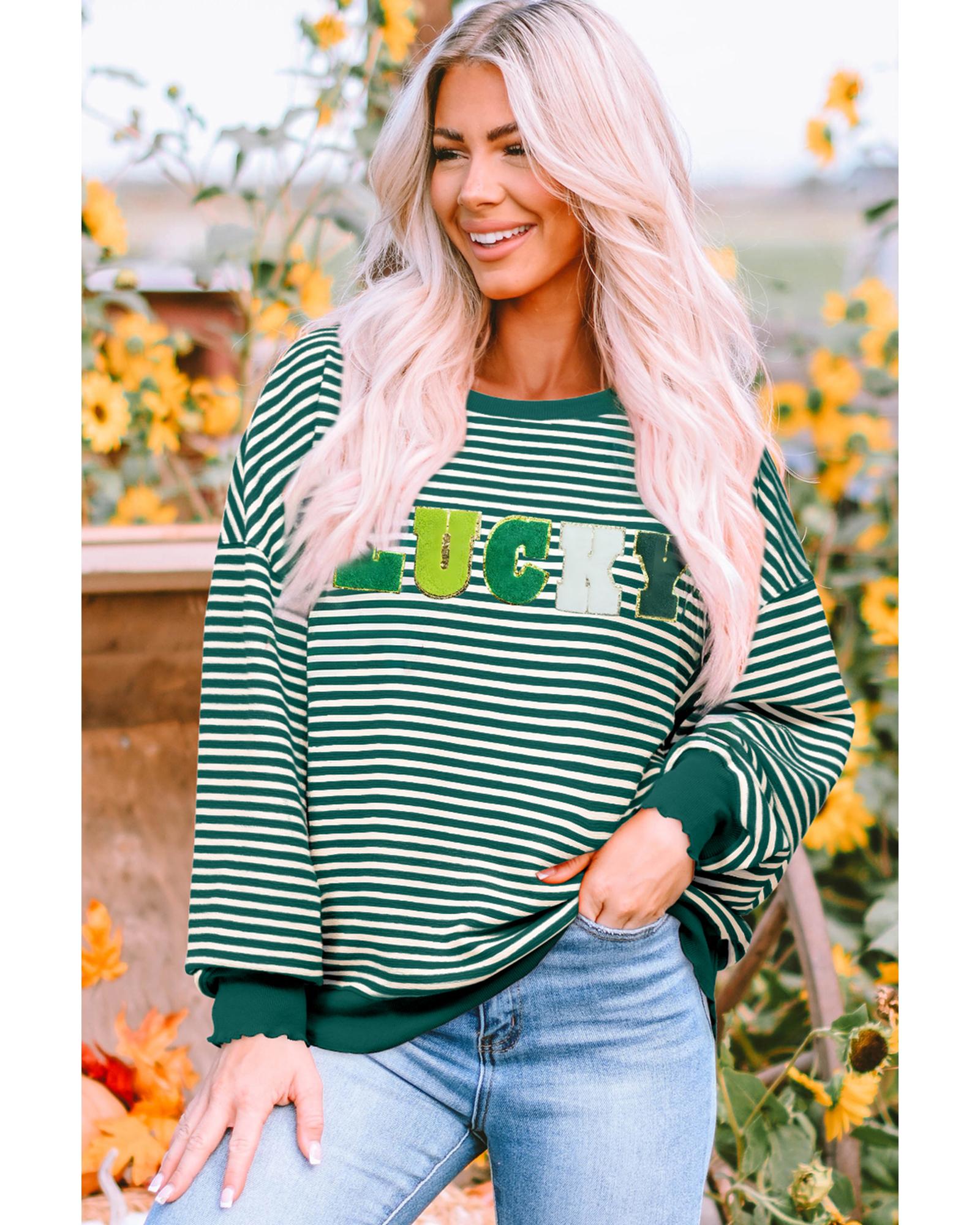 Green Stripe Chenille LUCKY Patched Pattern St Patrick Long Sleeve Top – M