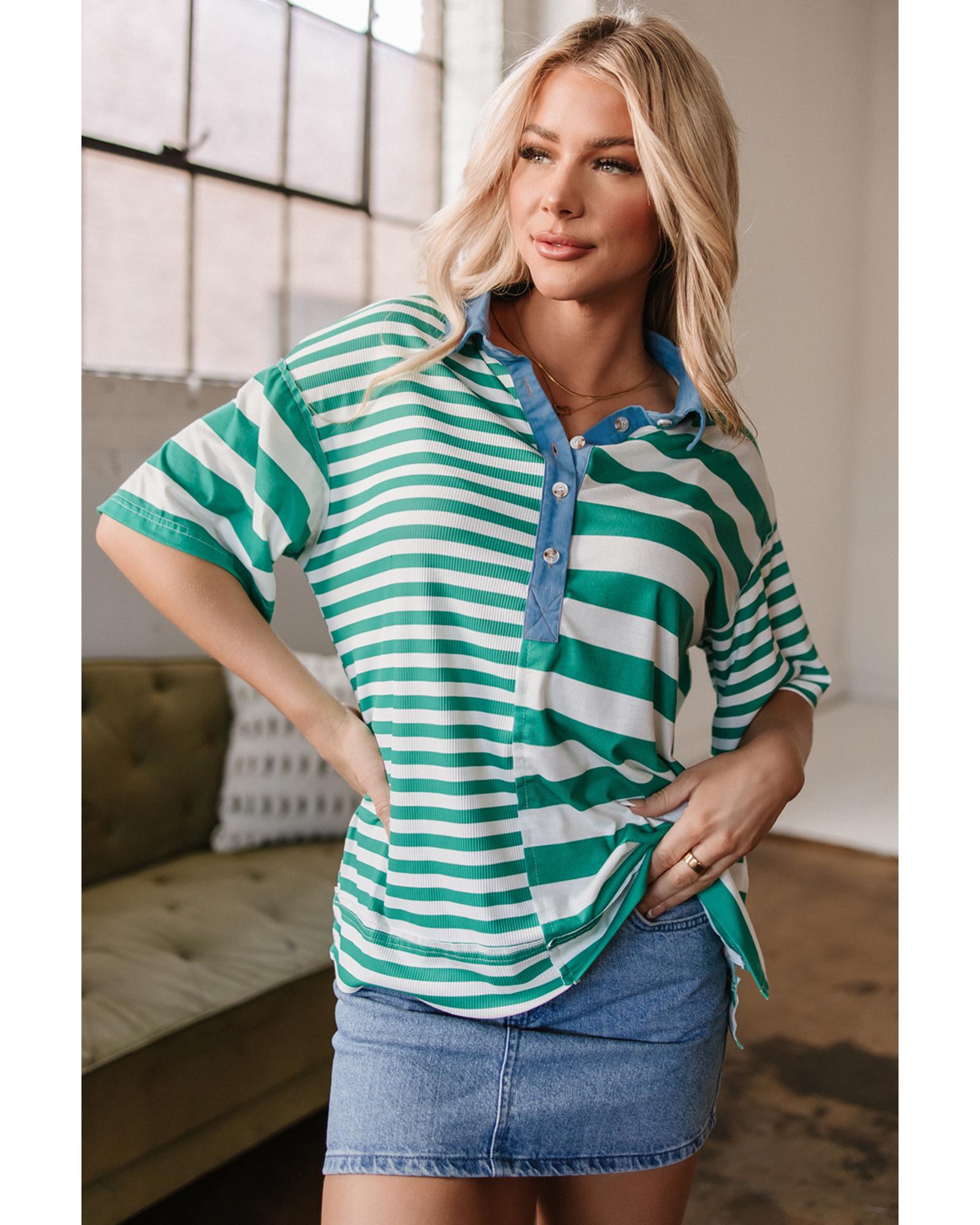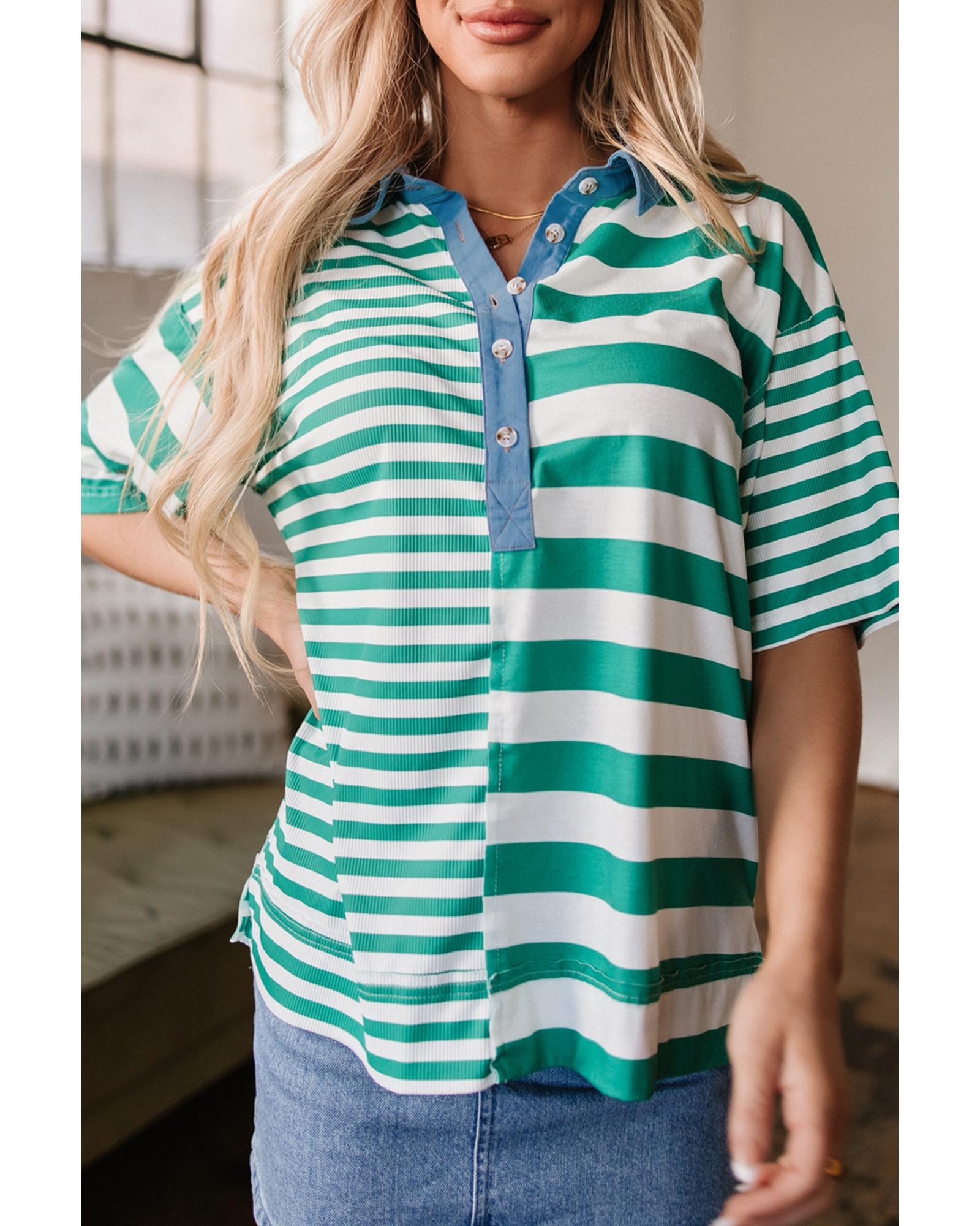 Green Stripe Colorblock Collar Half Buttons T Shirt – L