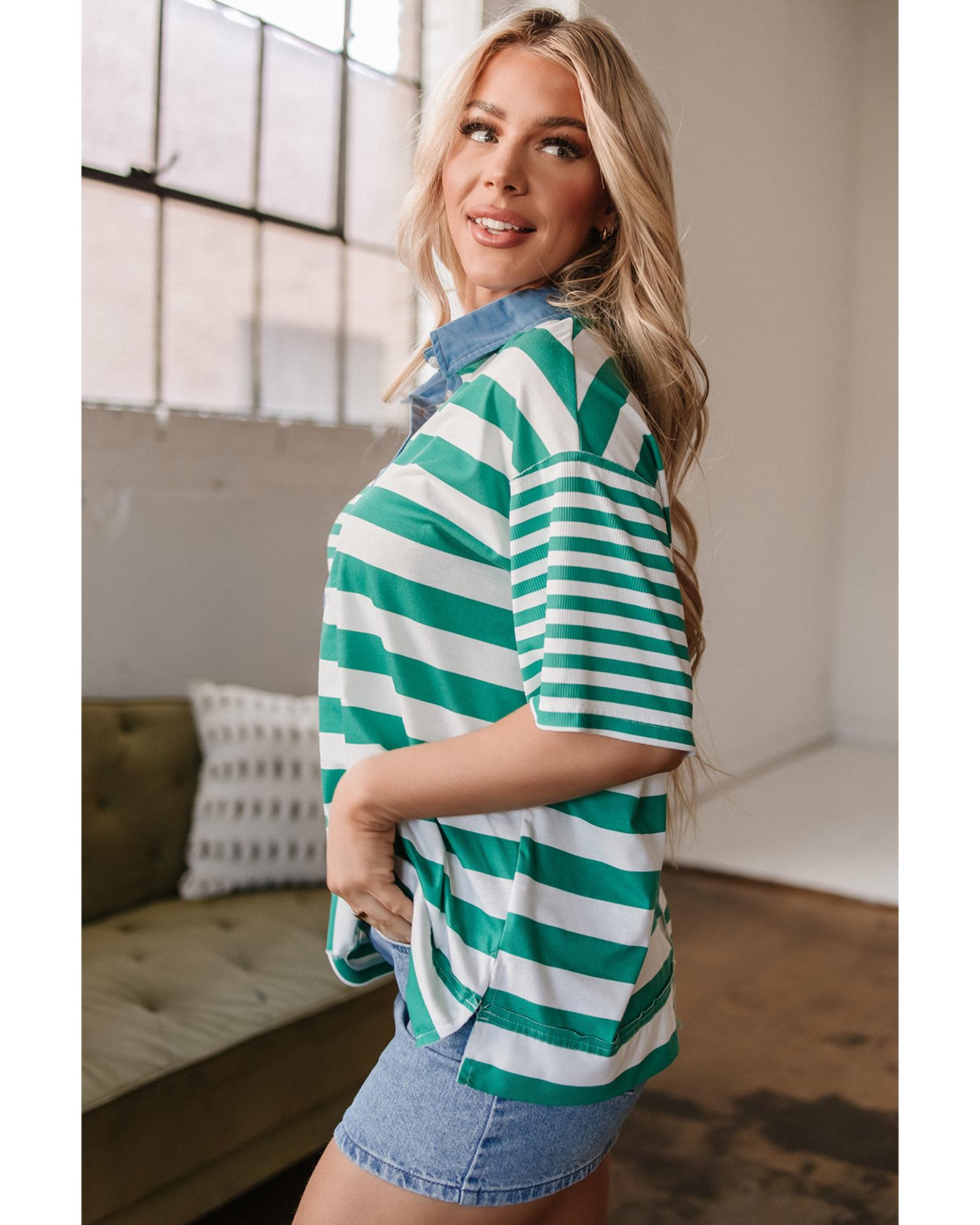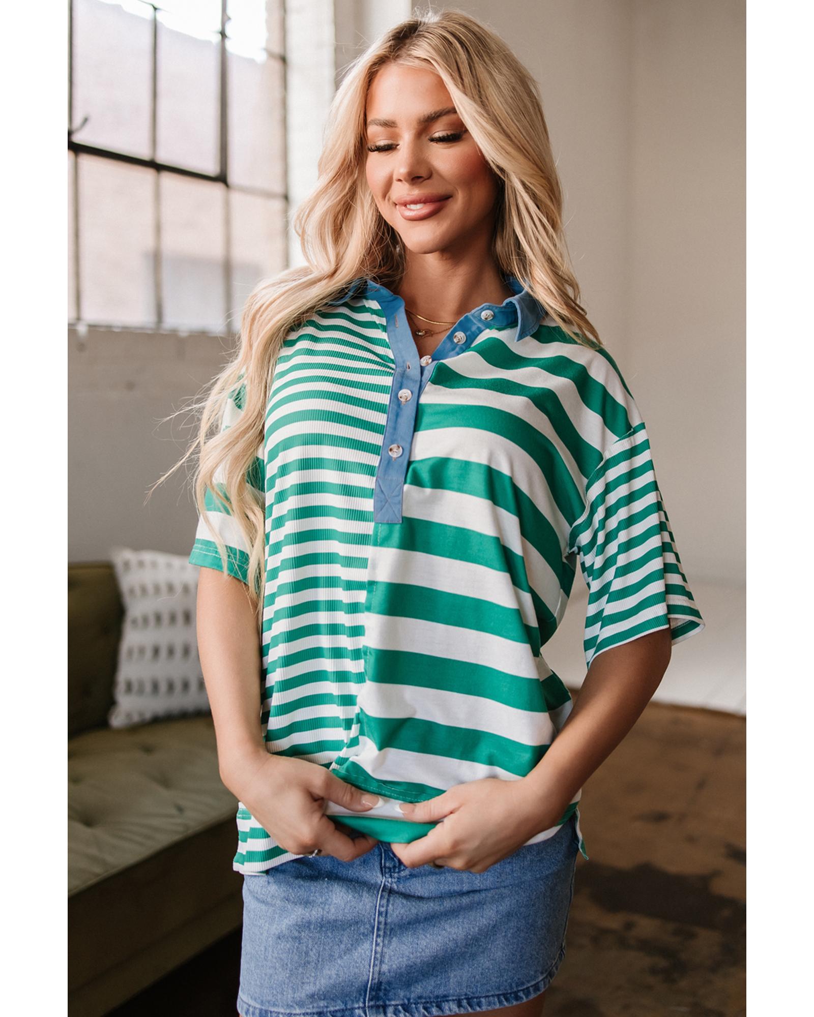 Green Stripe Colorblock Collar Half Buttons T Shirt – M