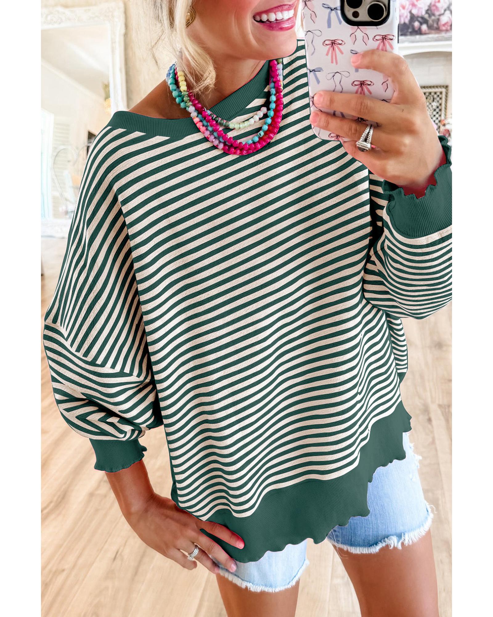 • Green Stripe Loose Drop Shoulder Long Sleeve Top