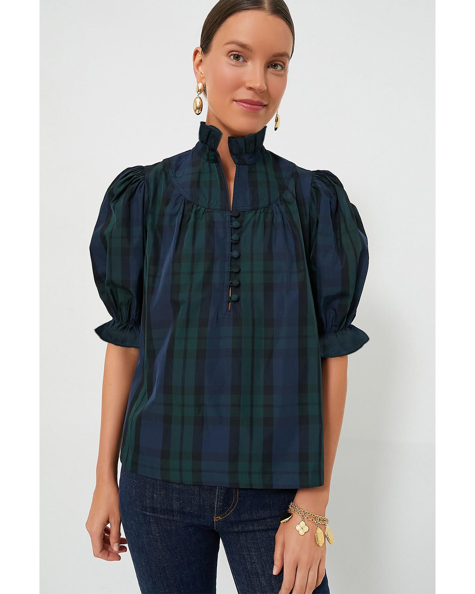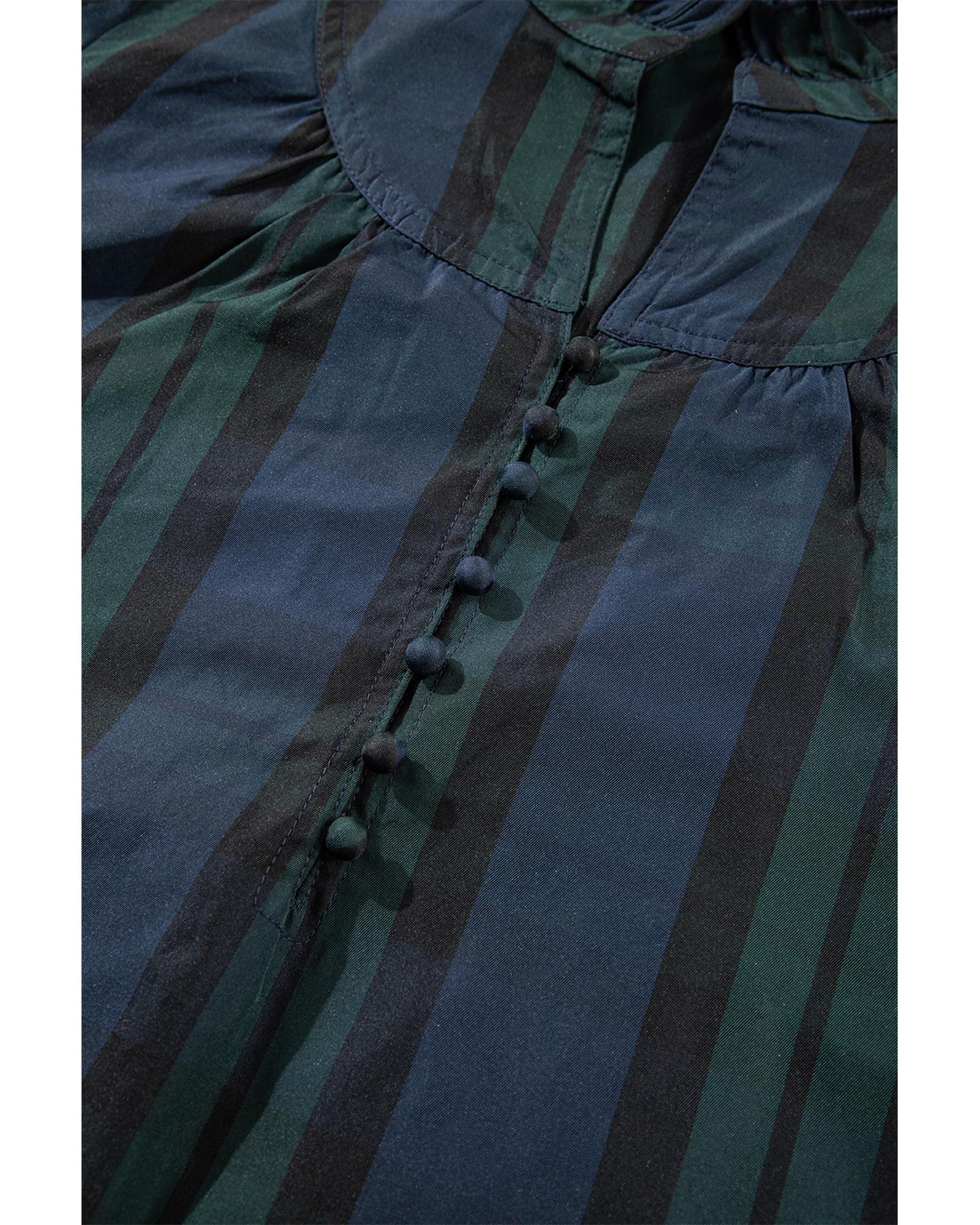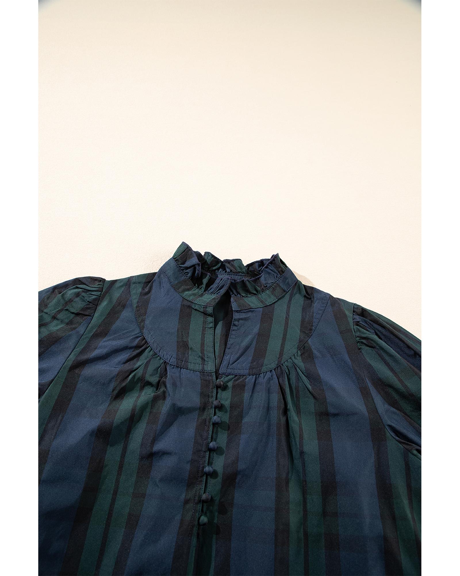 - Green Stripe Plaid Puff Sleeve Frilled Trim Elegant Blouse