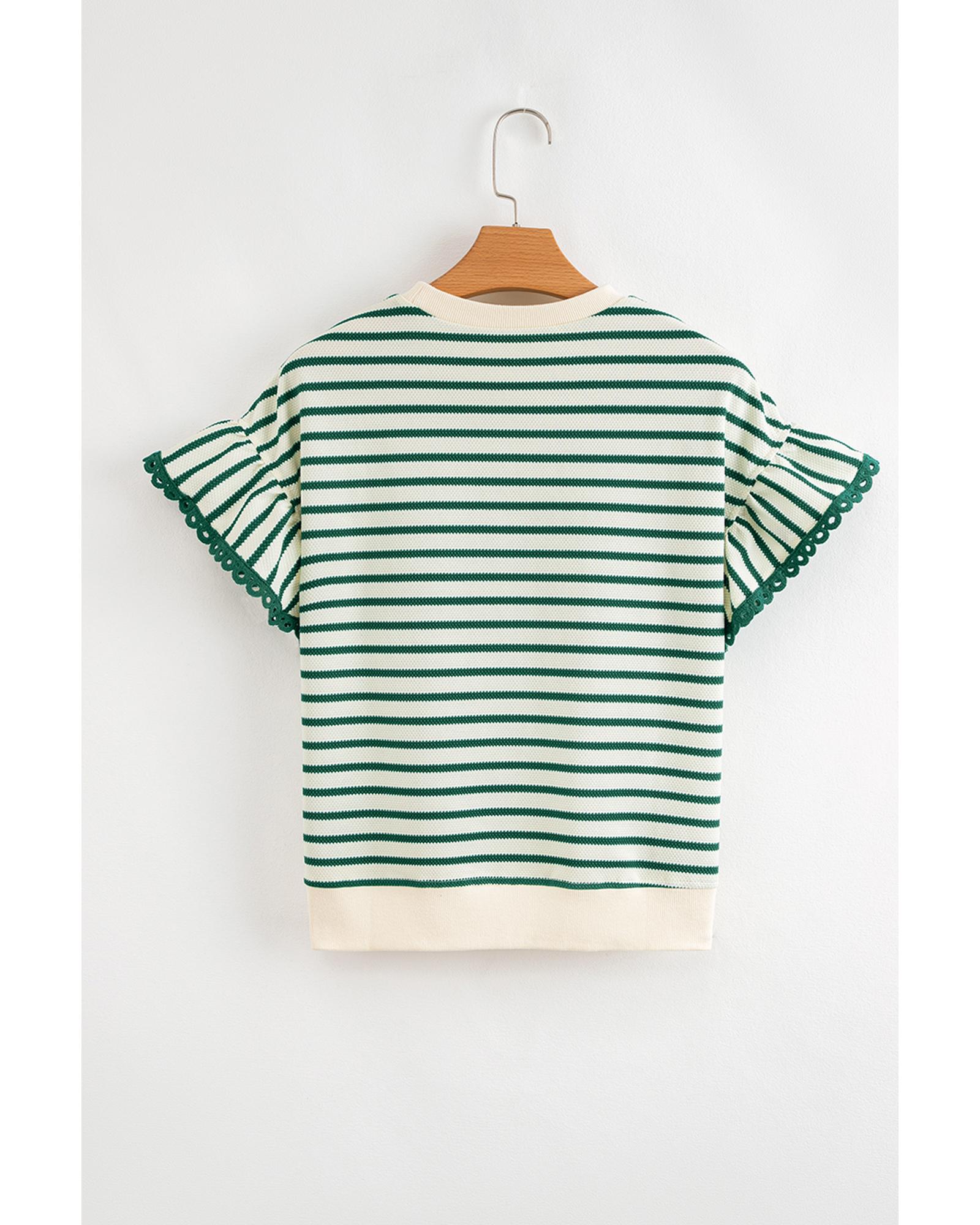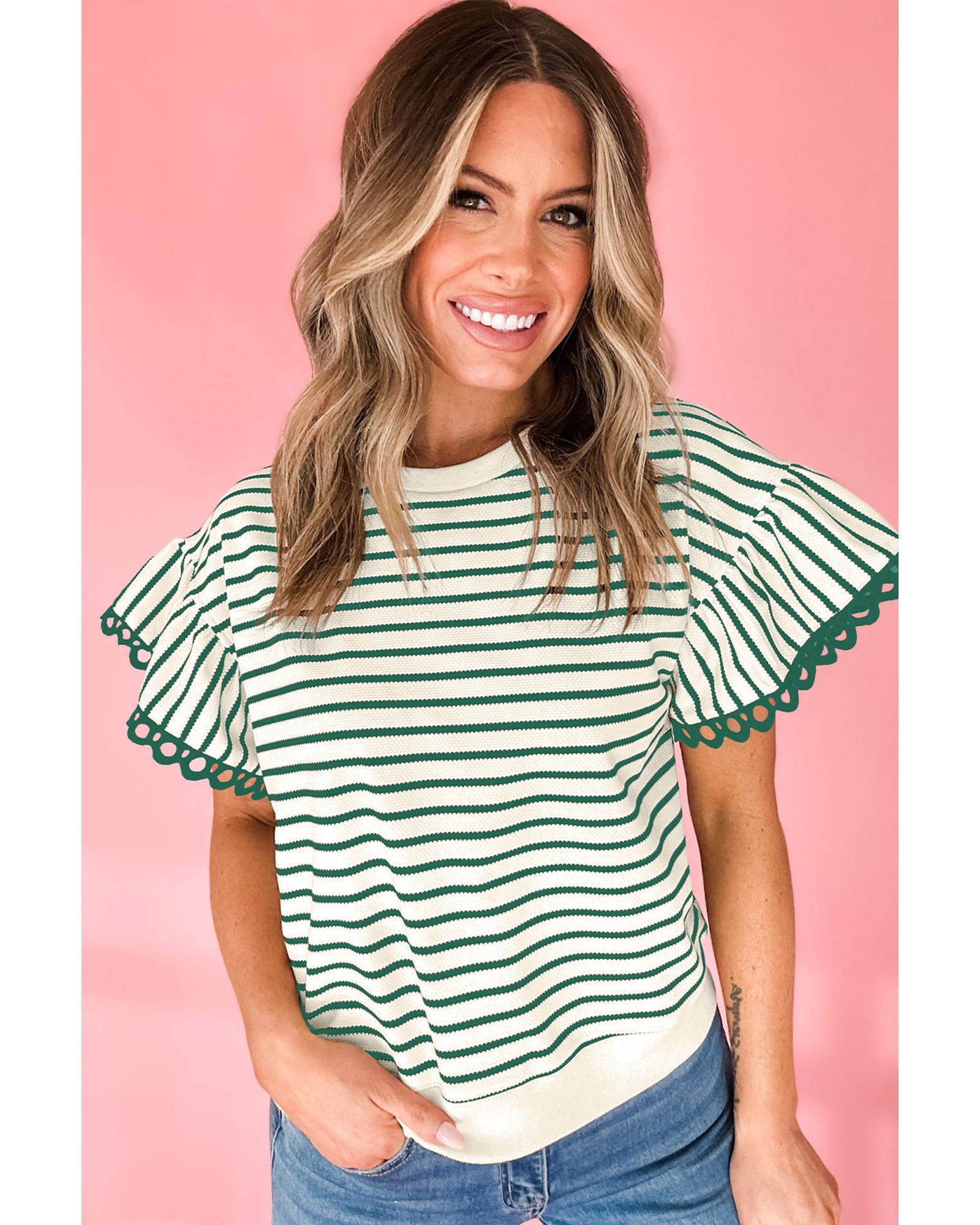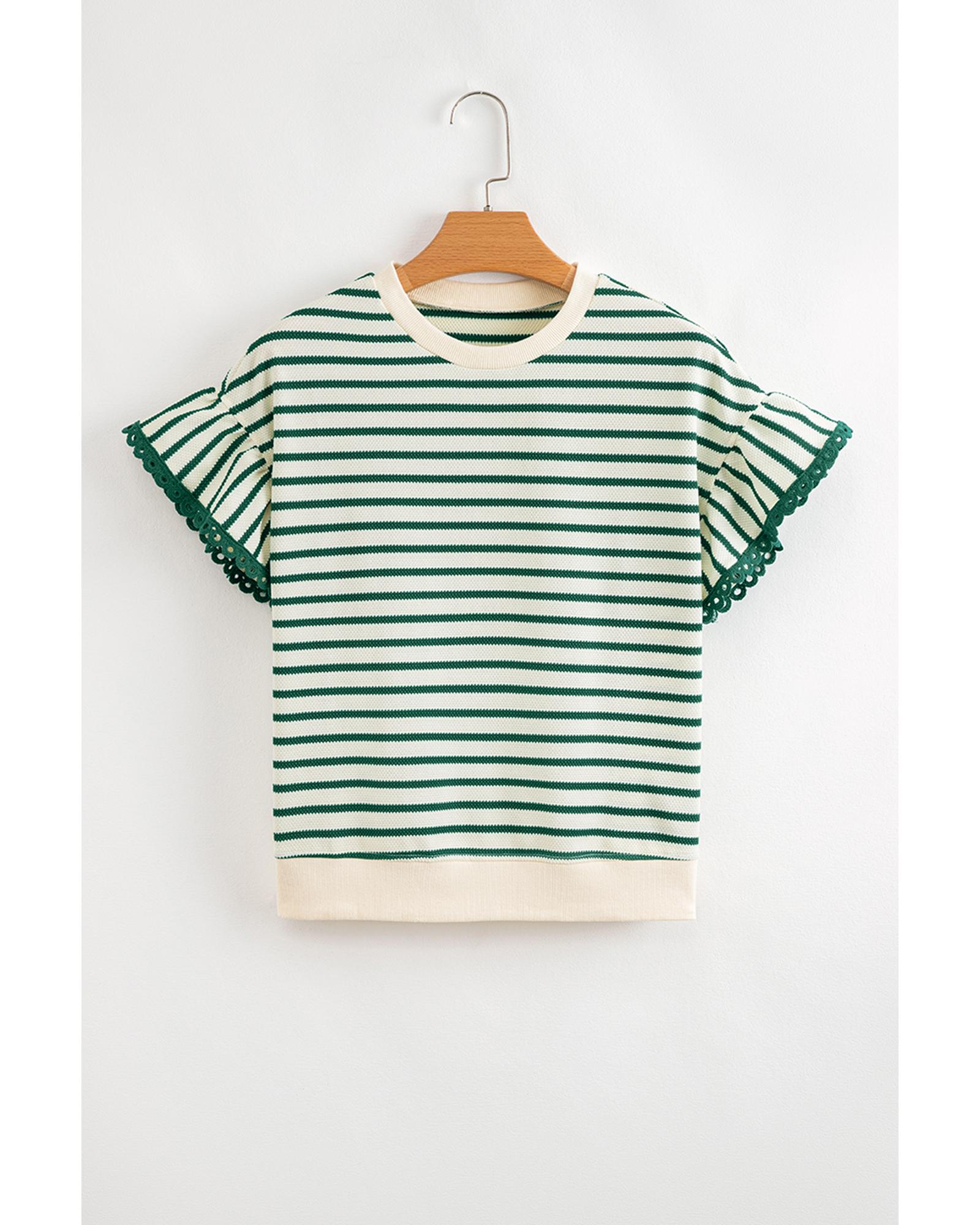 - Green Stripe Scallop Lace Trim Ruffle Short Sleeves Crewneck Top