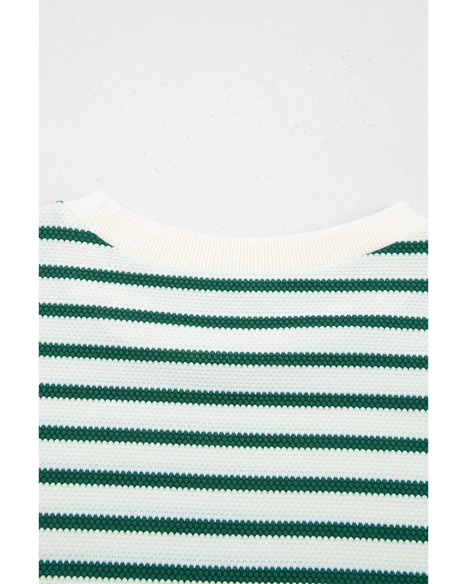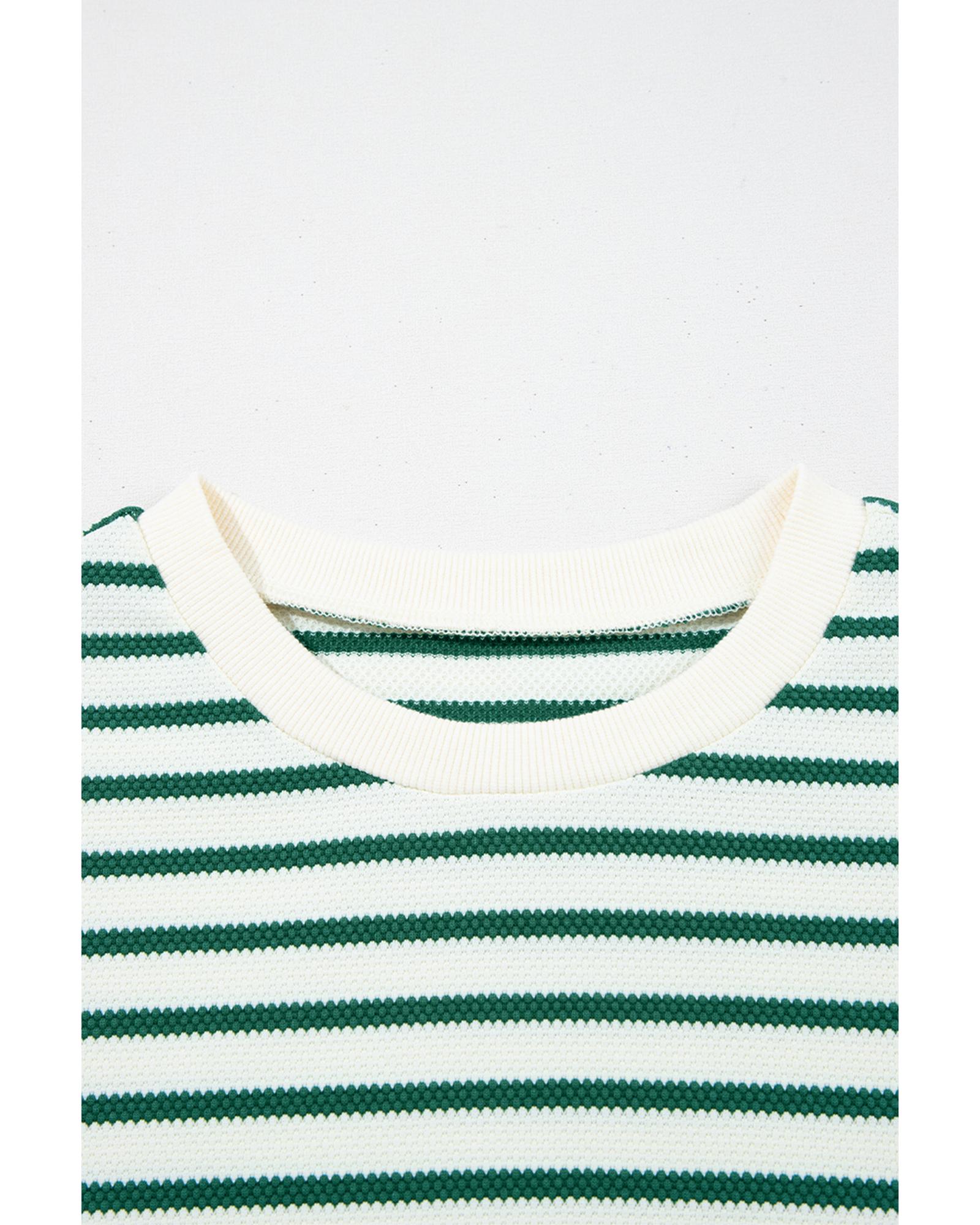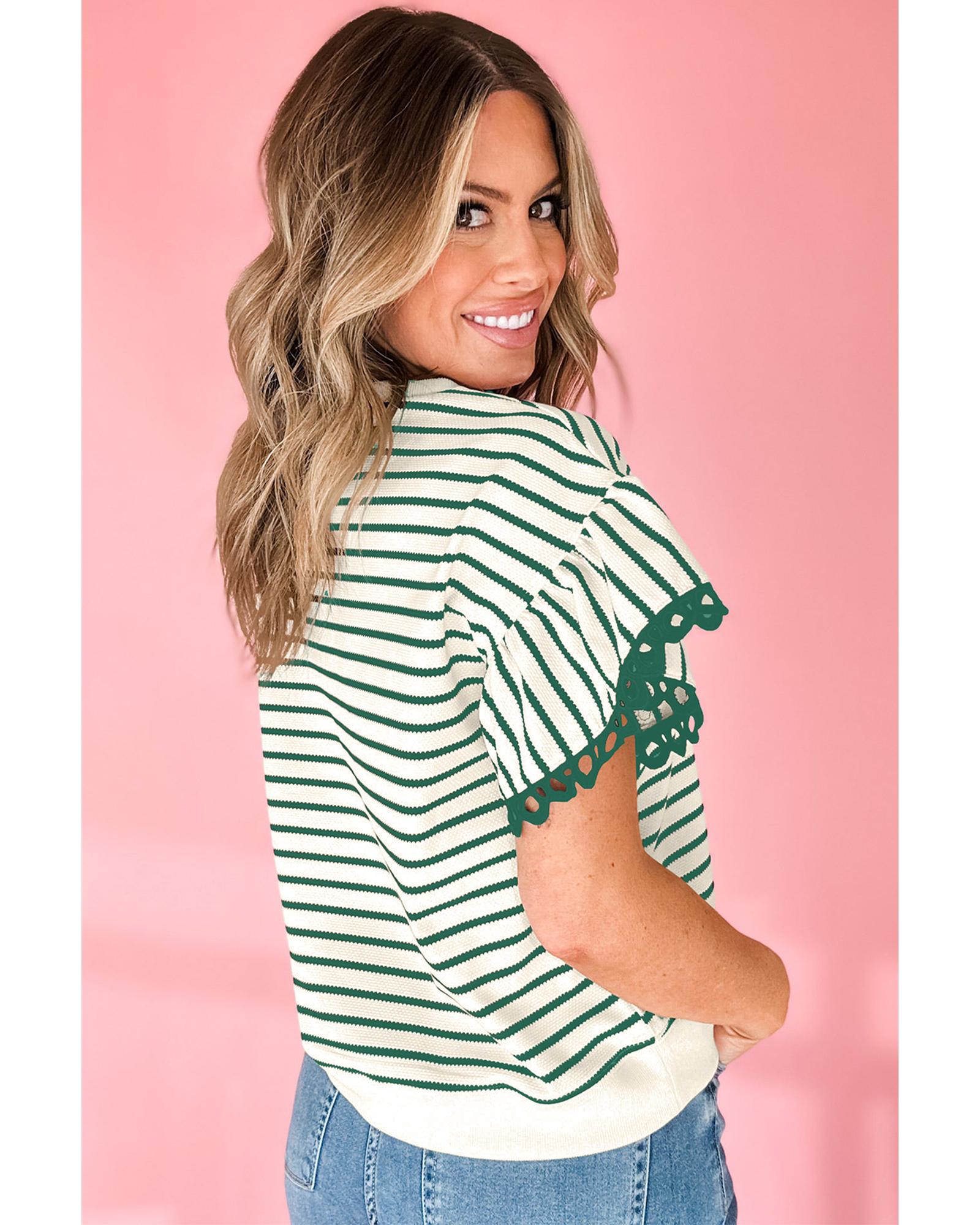 - Green Stripe Scallop Lace Trim Ruffle Short Sleeves Crewneck Top
