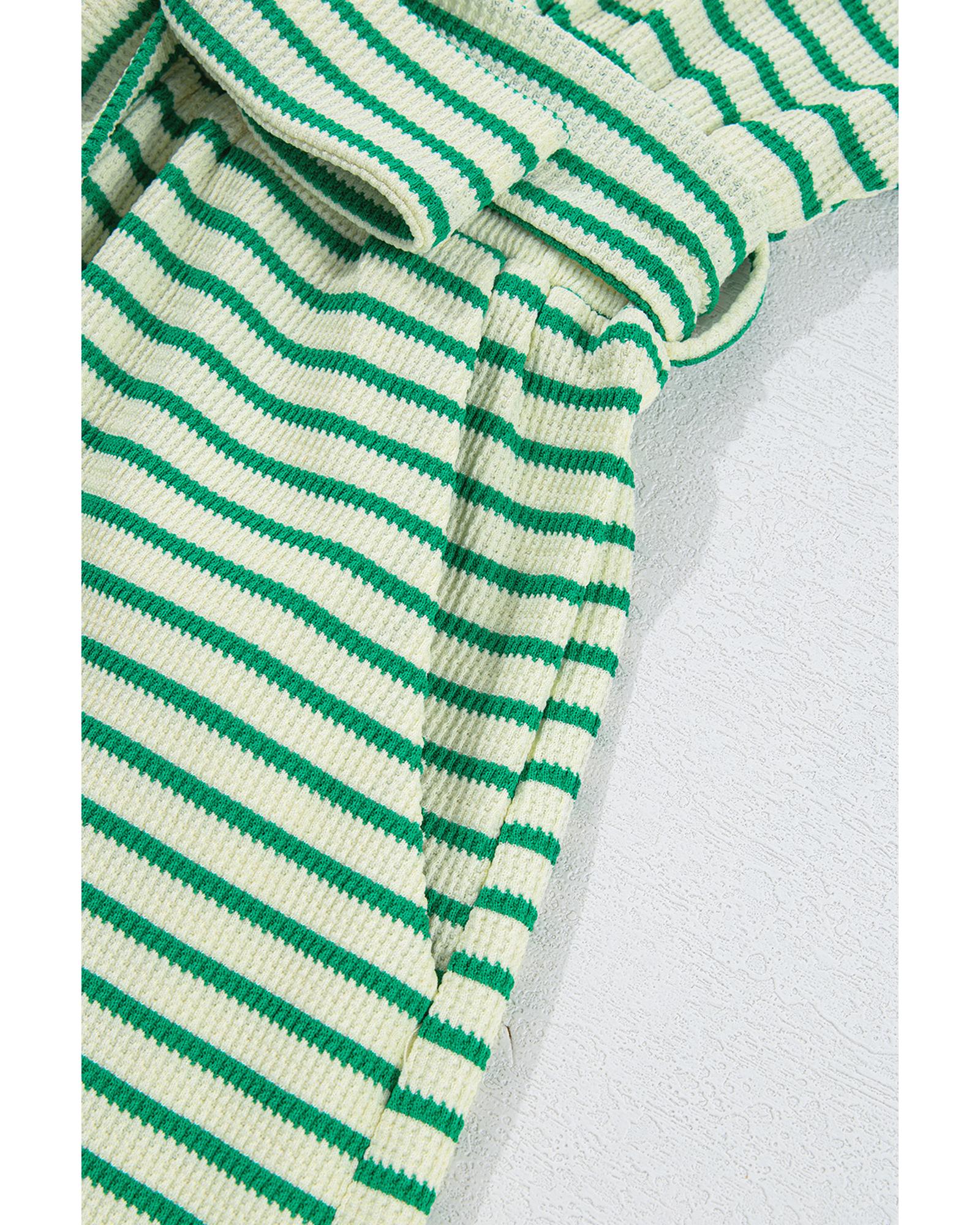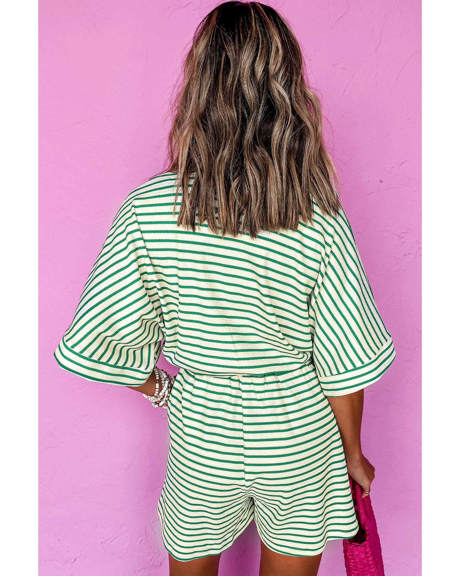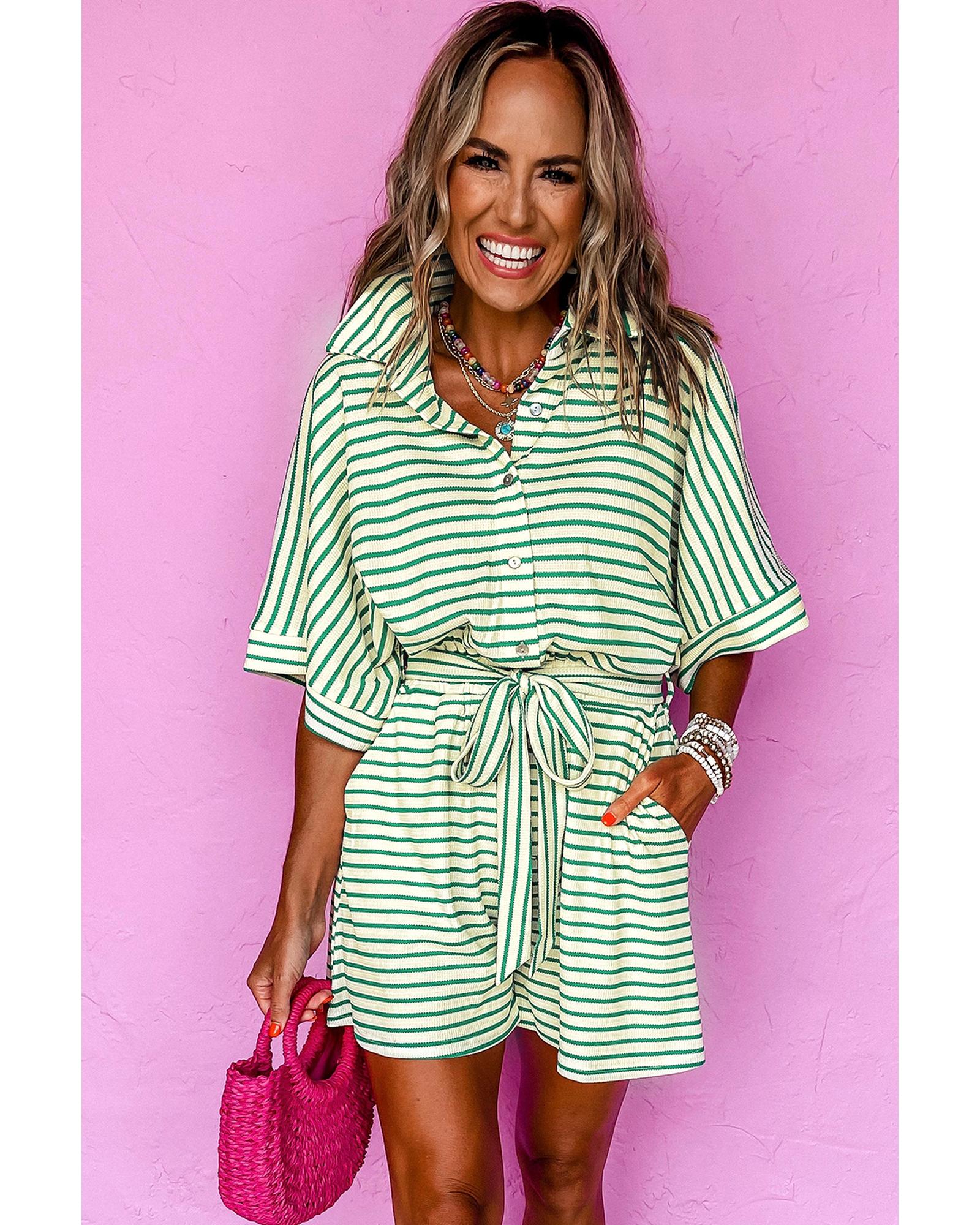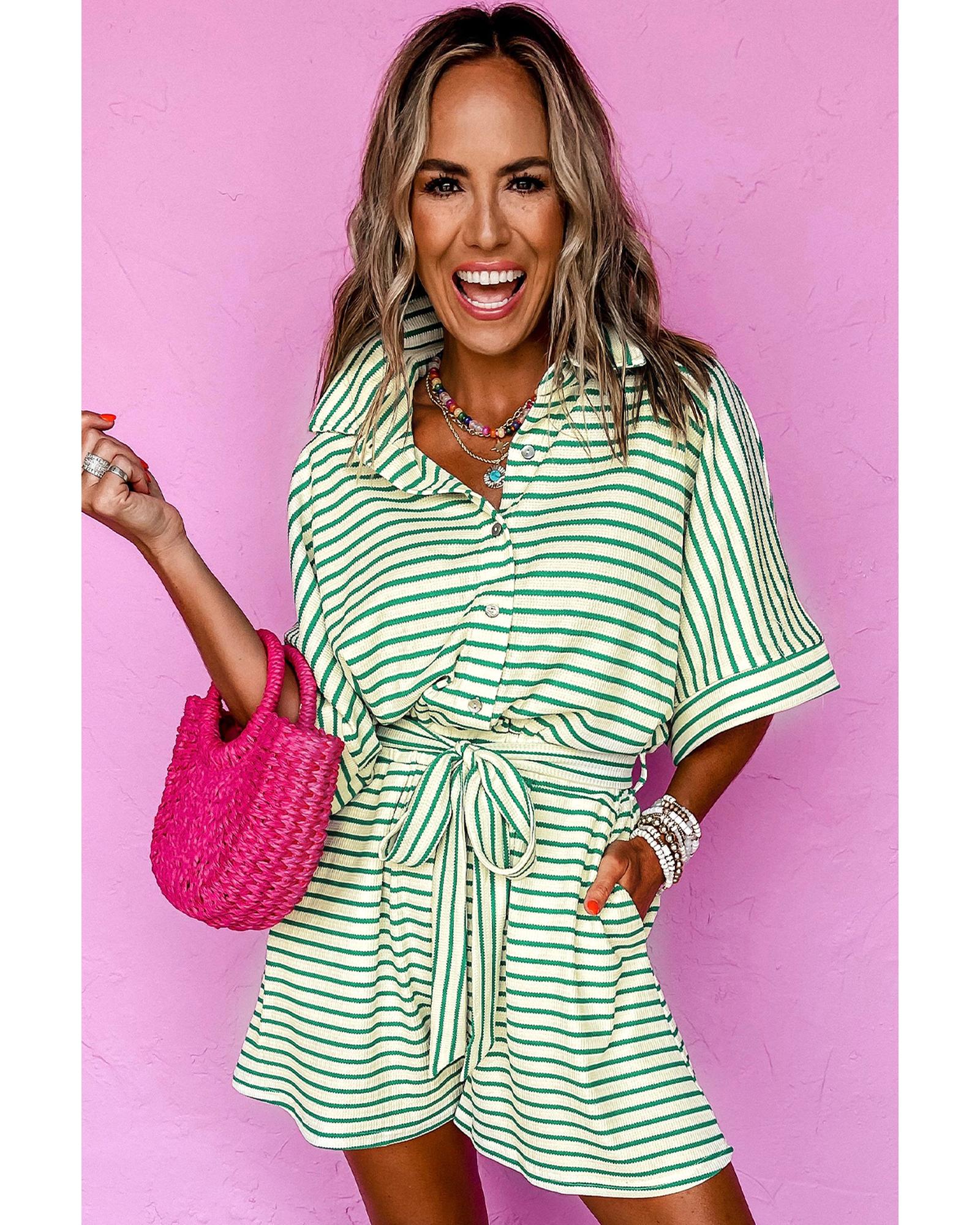 Green Stripe Textured Short Sleeve Collared Buttoned Waist Tie Romper – L