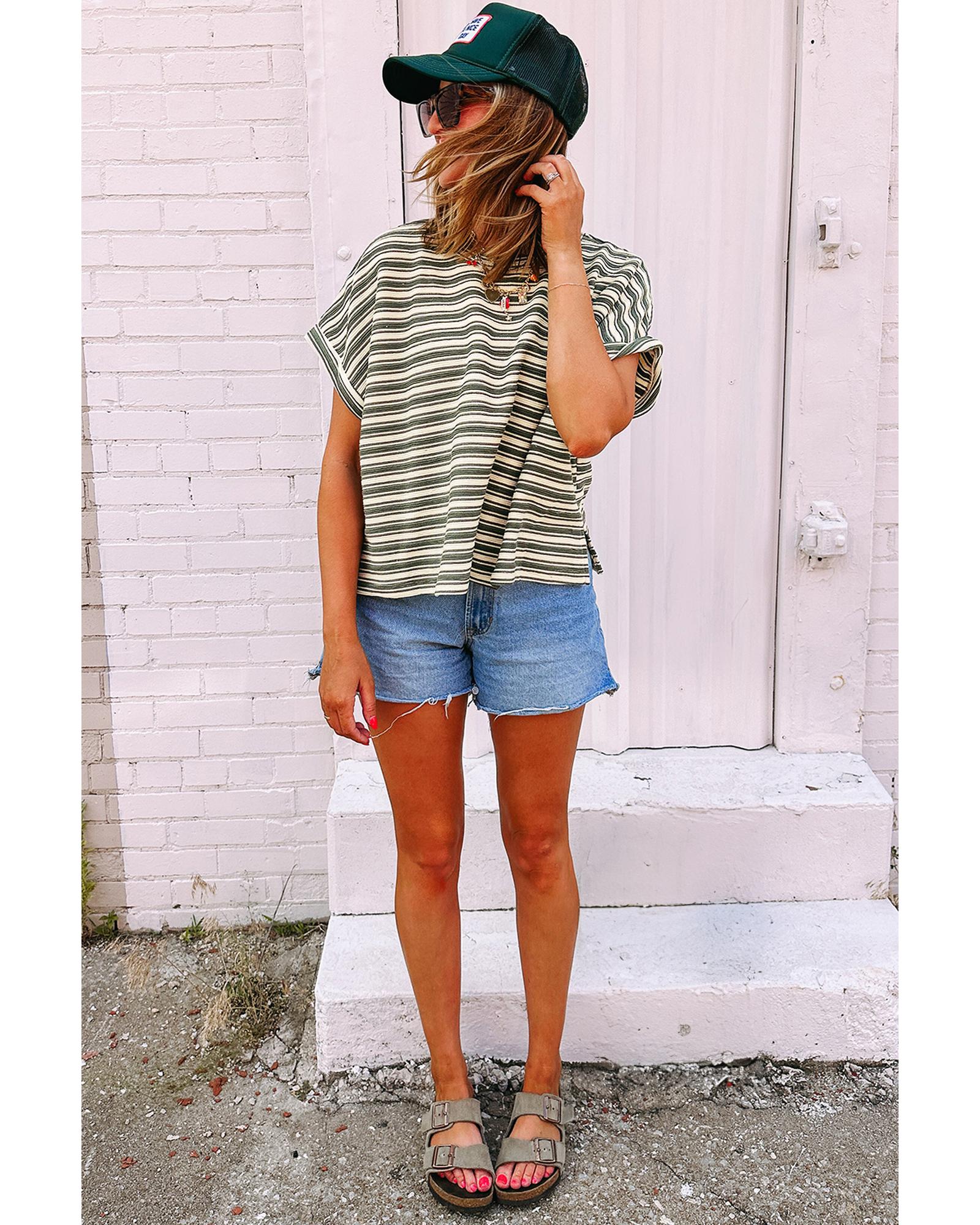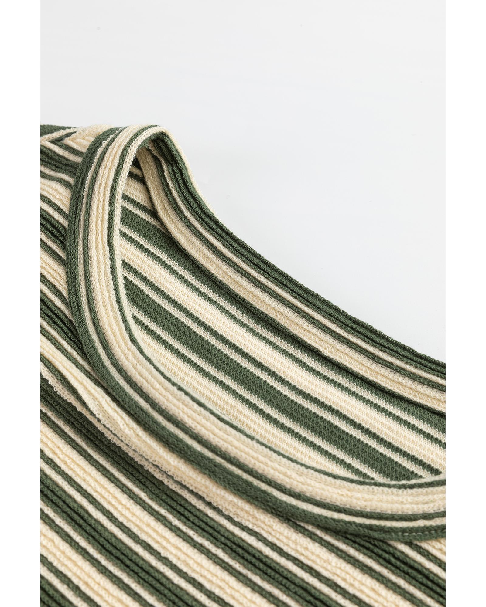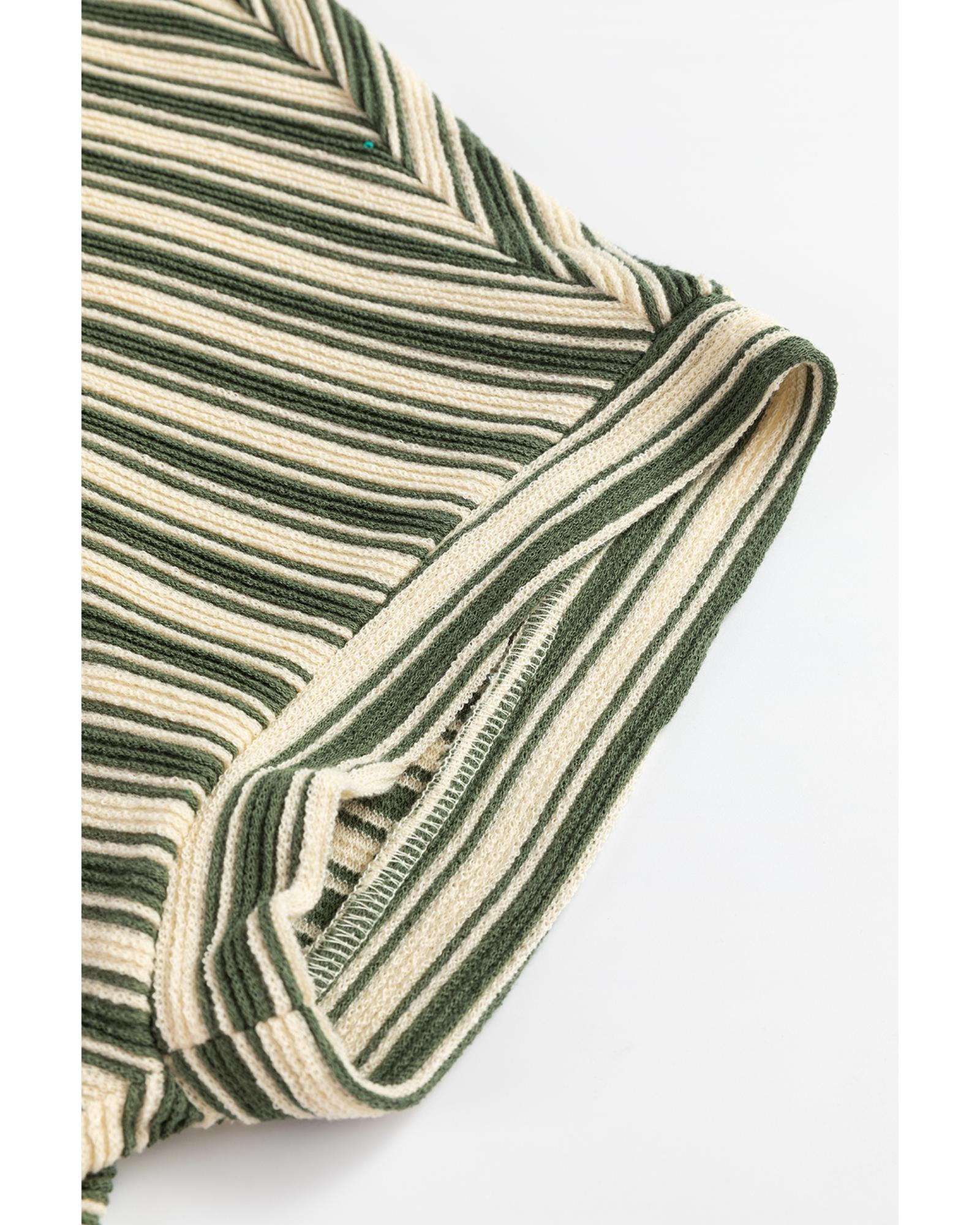 Green Stripe Textured Side Slits Crew Neck T Shirt – M