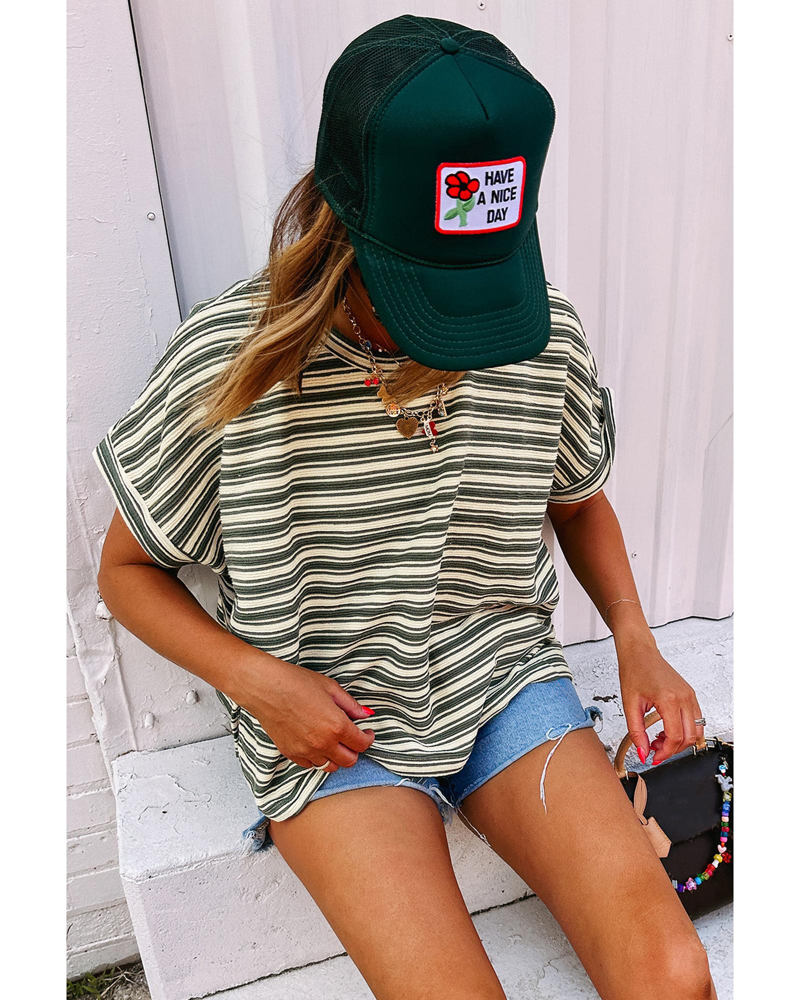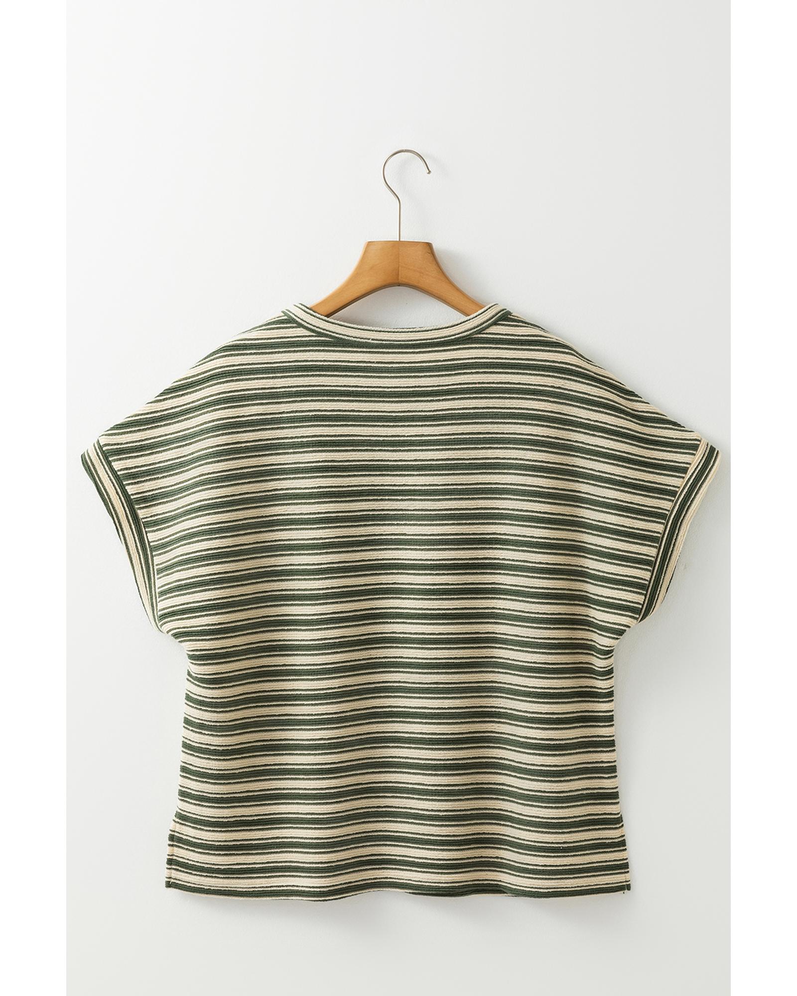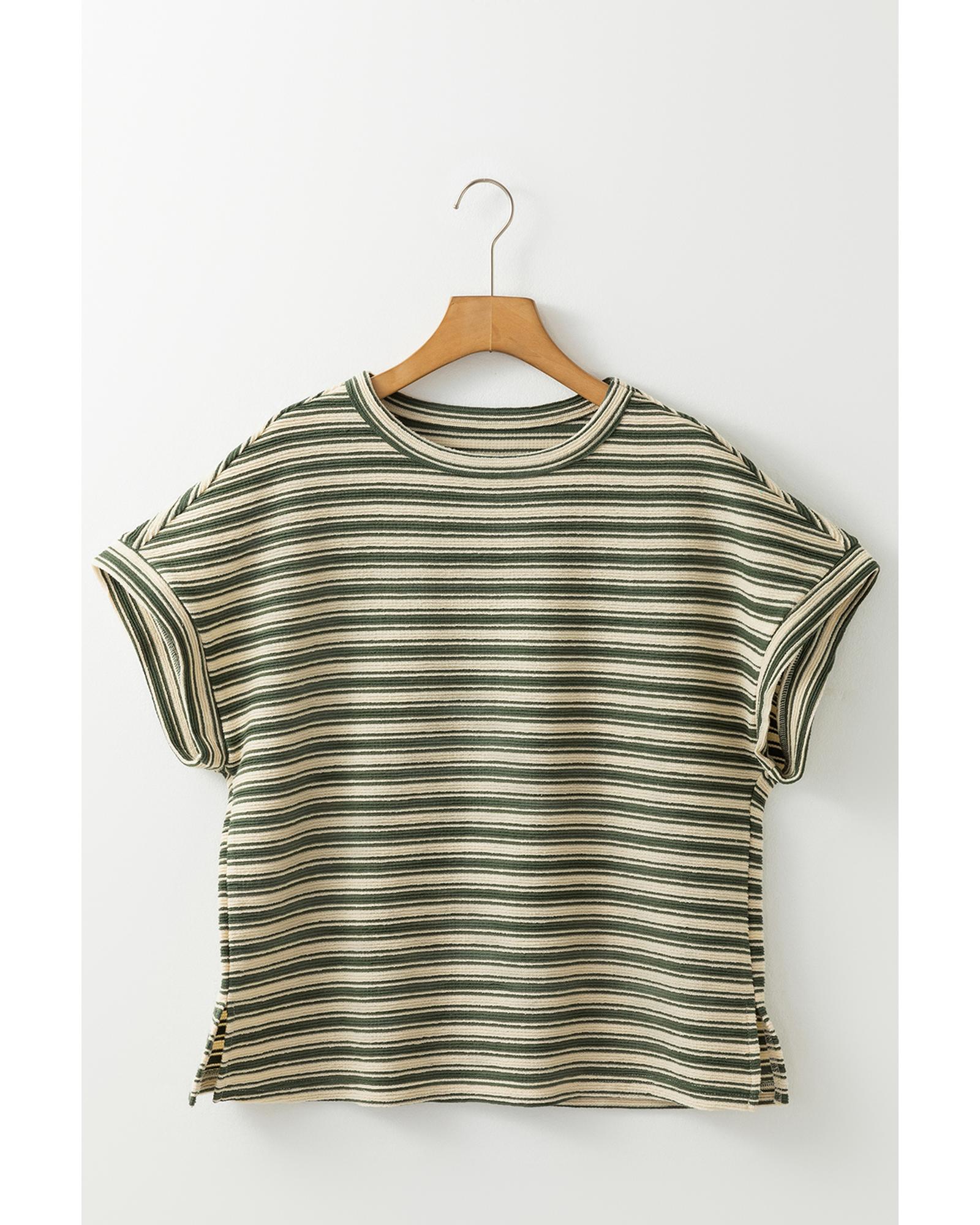 Green Stripe Textured Side Slits Crew Neck T Shirt – S