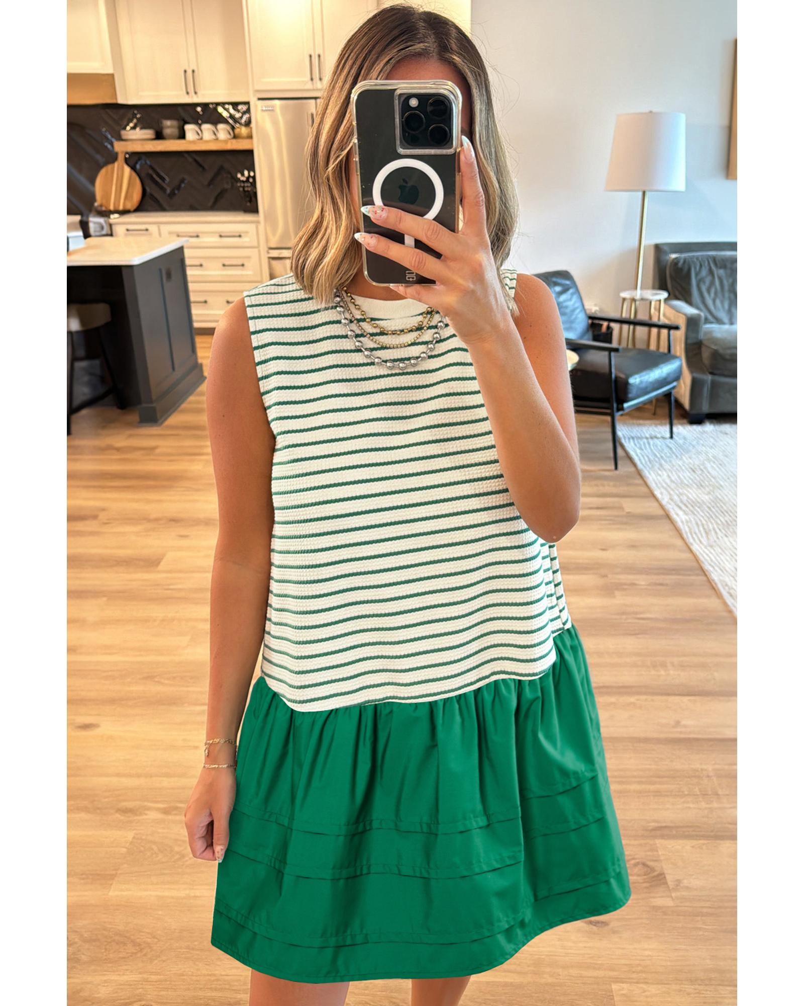 Green Stripe Woven Ruffled Sleeveless Mini Dress – L