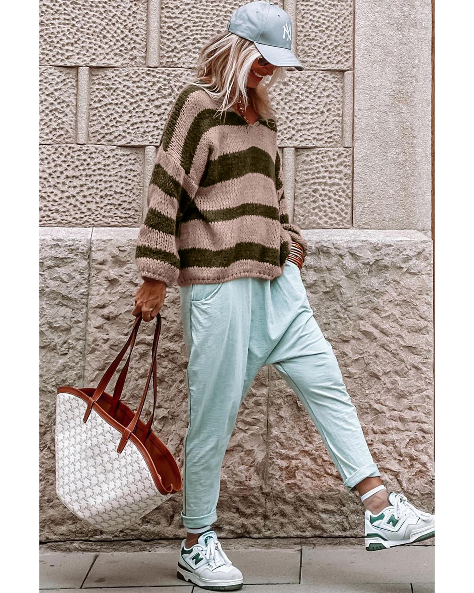 Green Striped Colorblock Knit V Neck Loose Fit Sweater – M