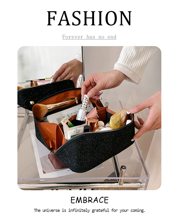 • Stylish and Durable: This sleek cosmetic bag is made from premium glitter fabric, offering a chic and sparkly appearance while maintaining durability for daily use.