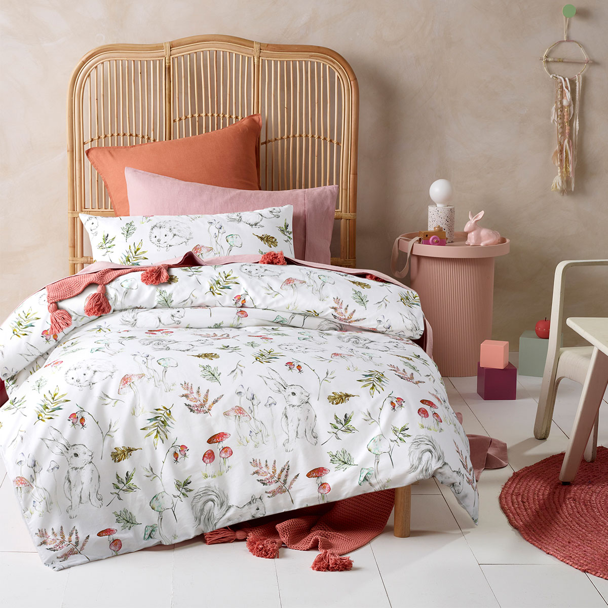 Add some imagination to your kid’s bedroom with Story Time White Cotton Digital Printed Quilt Cover Set by Happy Kids. The design features animals such as bunny, squirrel, and hedgehog accented with foliage and mushroom printed in soft tones of black, white, green, pink, grey, and brown that will add a dreamland vibe. It is made from natural breathable cotton that is soft against the skin for a cosy night’s sleep.