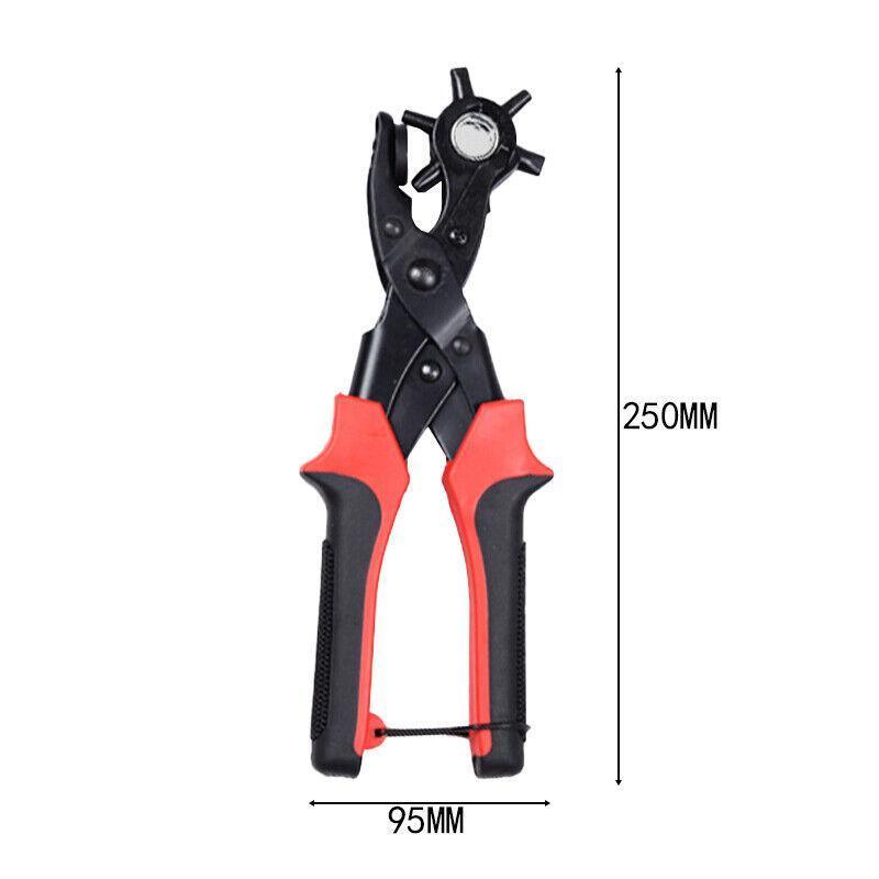 Tackle all your crafting and repair needs with this heavy duty leather hole punch tool, designed with a revolving head that offers six different hole sizes for maximum versatility. Crafted from solid alloy steel with a spray-coated finish, this belt hole punch plier delivers sharp precision and long-lasting durability. Whether you’re working with leather, canvas, plastic, fabric, rubber or cardboard, the ergonomic non-slip grip and double-lever design ensure a comfortable and effort-saving punching experience. With added accessories like a backup brass pad and screwdriver, it’s the perfect addition to any home or professional toolkit.