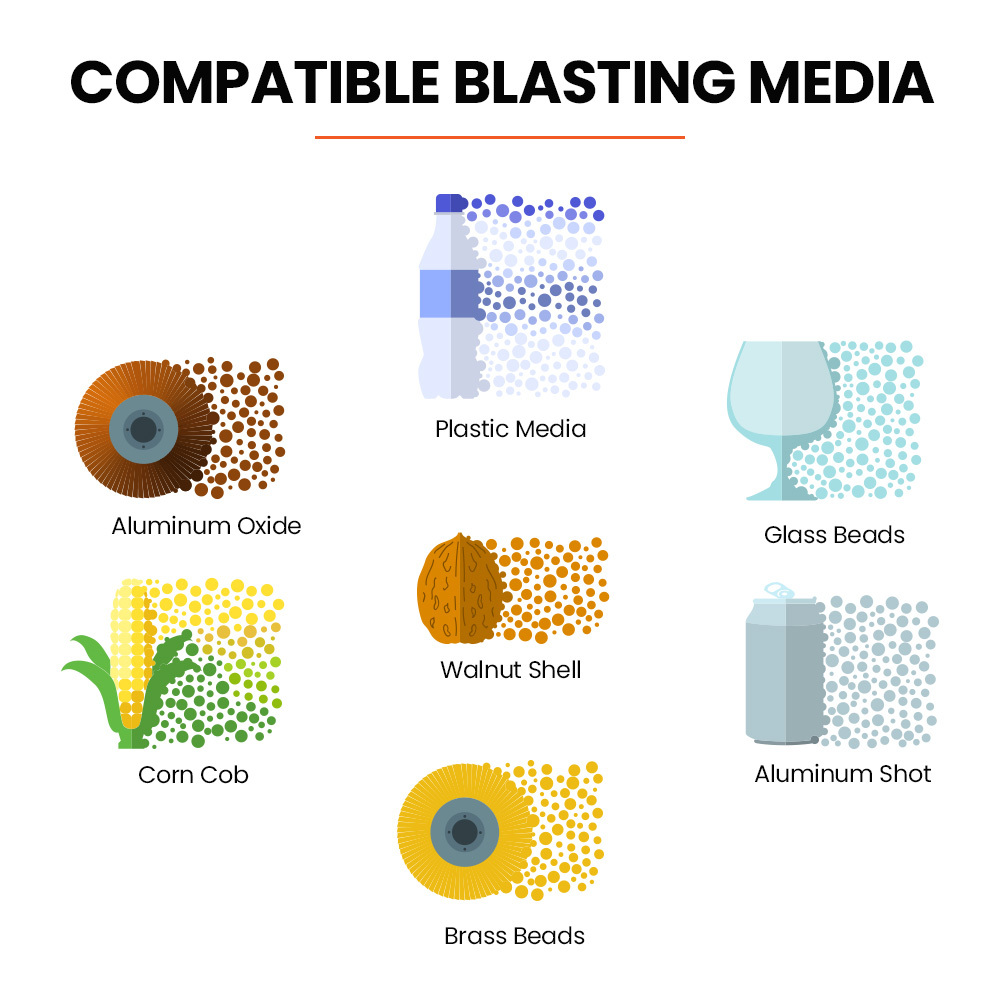 - Sand Types: Glass bead, silicon carbide, alumina, walnut shell, brass bead