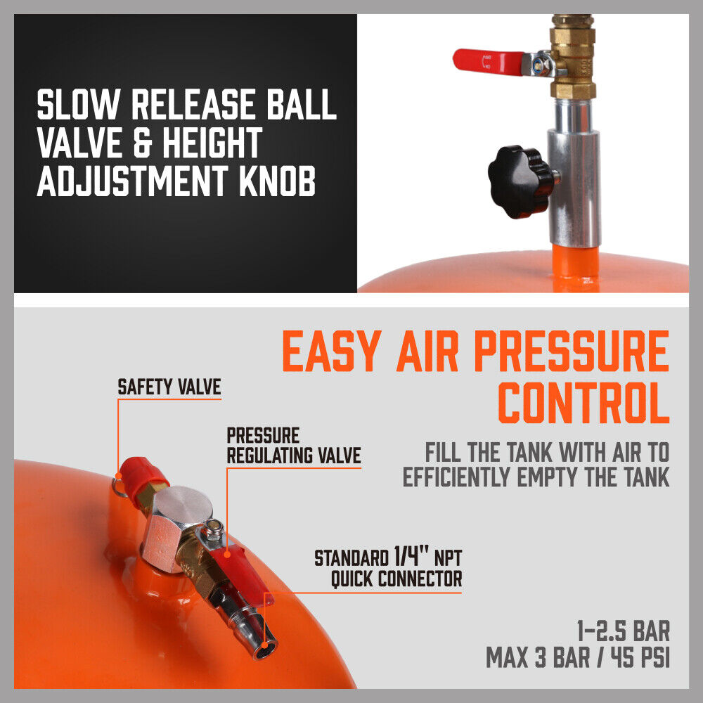 - Oil Drain Tank Working Pressure: Max 45psi. Air Inlet:Standard ¼ NPT. Ideal For Extracting Waste Oil and Other Fluids From Vehicles.