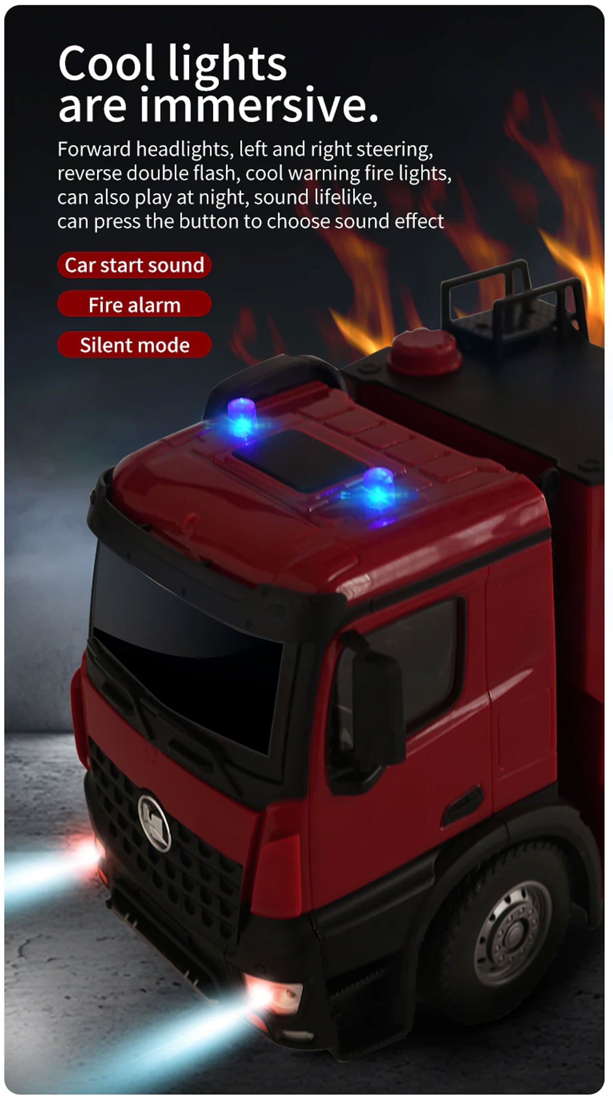 The 1:14 RC Fire Truck has many features, including Water spray; simulation fire alarm sound; light; workbench can rotate by 270 degrees; the ladder can lift in 60cm height. It can move in all directions; forward, backward, left, right. Safety non-toxic plastic material, then you can rest assured of your child to play our toy. It help to develop logical thinking, problem solving and fine motor skills. It is the perfect choice for gifts, birthday presents, Christmas gifts, etc.