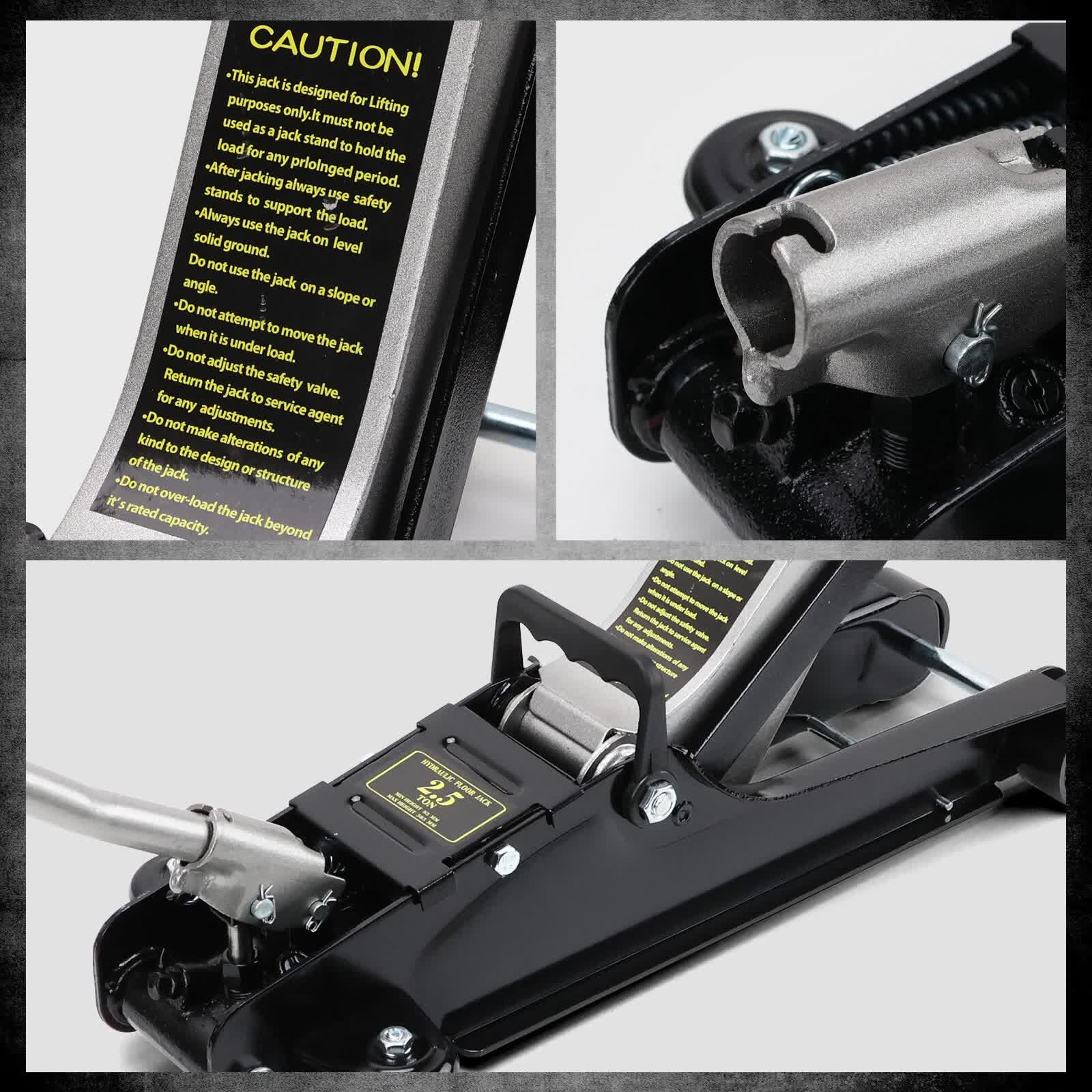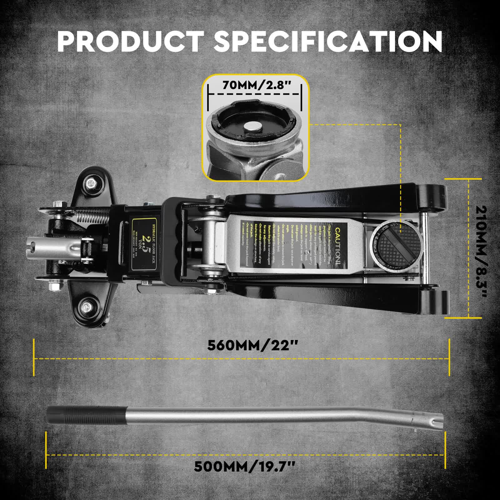 The hydraulic floor jack is a sleek, low profile, durable and long lasting 2.5T steel service jack capable of taking on any job for professionals or weekend warriors. The true low profile design allows users to get under almost any vehicle to lift and comes at a significantly lower cost compared to other models in the market.