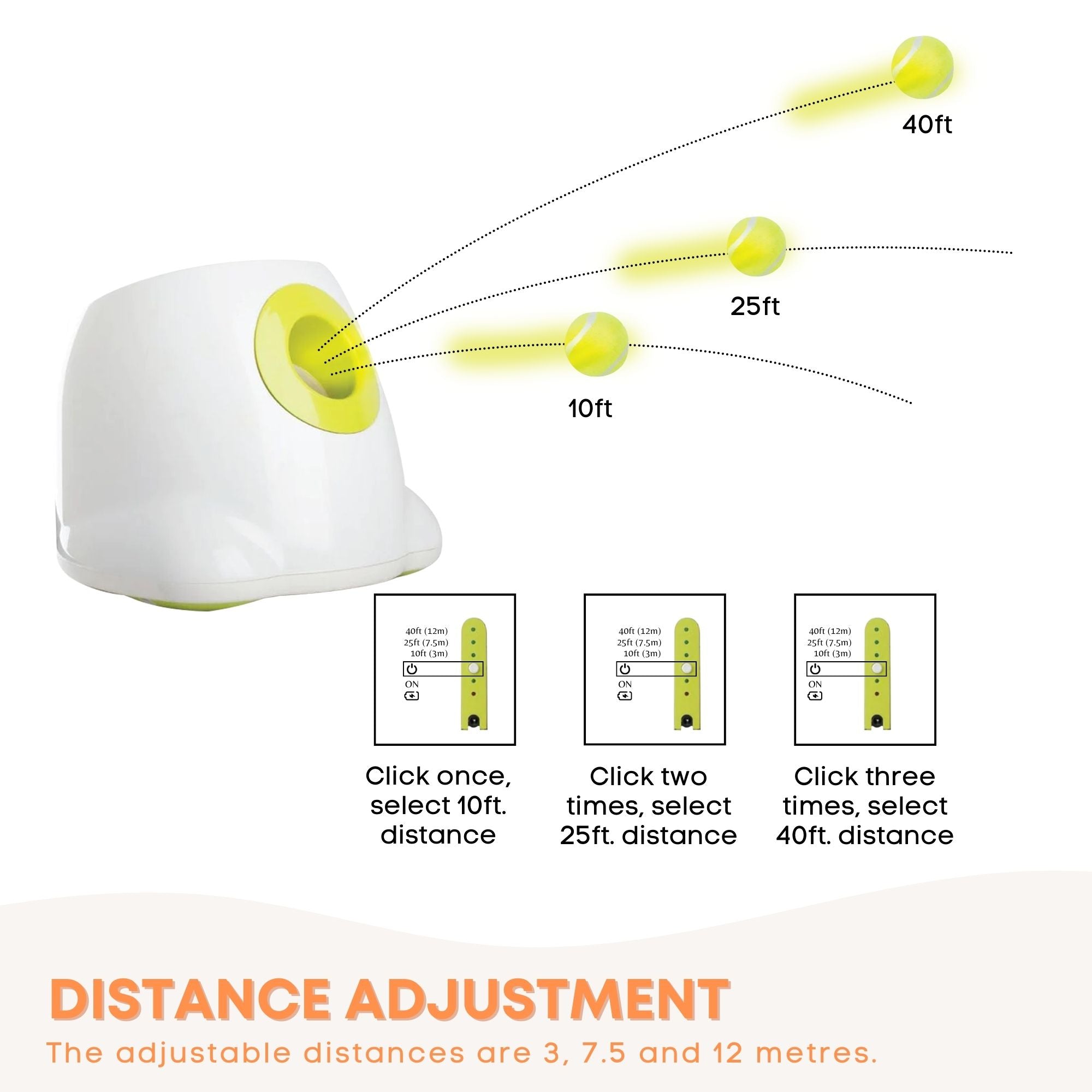 - Adjustable Distance Settings – make it throw 10ft (3m), 25ft (7.5m) or 40ft (12m). Great training tool for both older dogs and as a way to tire out energetic puppies.