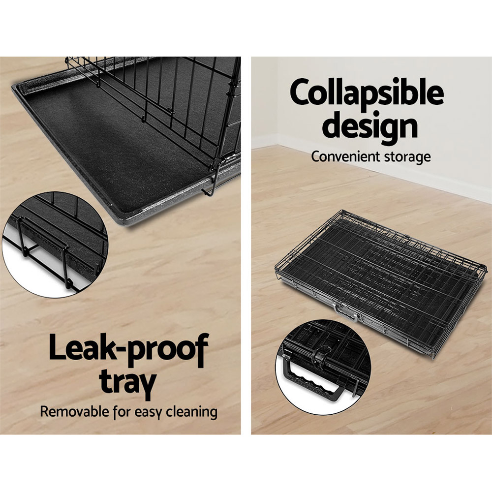 Featuring a foldable design with triple access doors, this dog cage offers maximum convenience and is extremely safe for containing your pets. It’s metal constructed with a powder coated finish enhancing durability and is also rust resistant. Easy to setup, store, transport and clean, an absolute hassle free purchase! Great for securely keeping your pets contained, a must have for every pet owner.