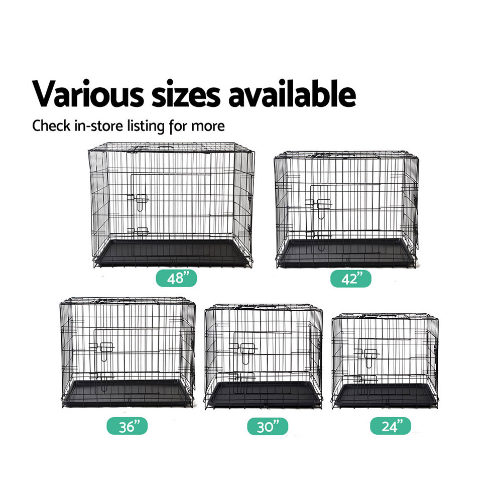 Featuring a foldable design with triple access doors, this dog cage offers maximum convenience and is extremely safe for containing your pets. It’s metal constructed with a powder coated finish enhancing durability and is also rust resistant. Easy to setup, store, transport and clean. Great for securely keeping your pets contained, a must have for every pet owner.